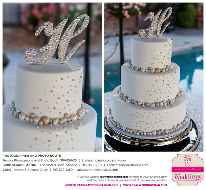 We had a three layer cake and then a sheet cake. The flavors were amazing! They were Fuzzy Navel, Blueberry with a berry ganache, Champagne, Banana with a chocolate filling. We wanted fruity & fun flavors since we were a summer wedding. We chose a fondant frosting and had iridescent pearls flowing down the cake matching our pearl monogrammed “H” cake topper. We felt the style of the cake fit the romantic and vintage/antique style of our wedding. We also had cute take home boxes, with wooden forks, filled with cake for our guests. There wasn’t a crumb left at the end of the night