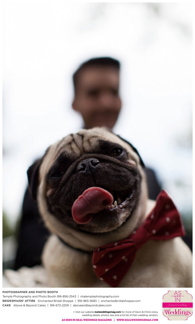 The ceremony, in front of 120 guests, included mostly local guests and a six-member wedding party, plus the couple’s pug, Daiquiri, who walked the rings down the aisle.