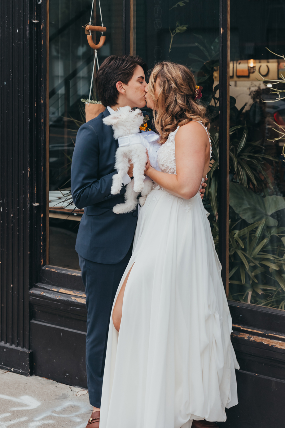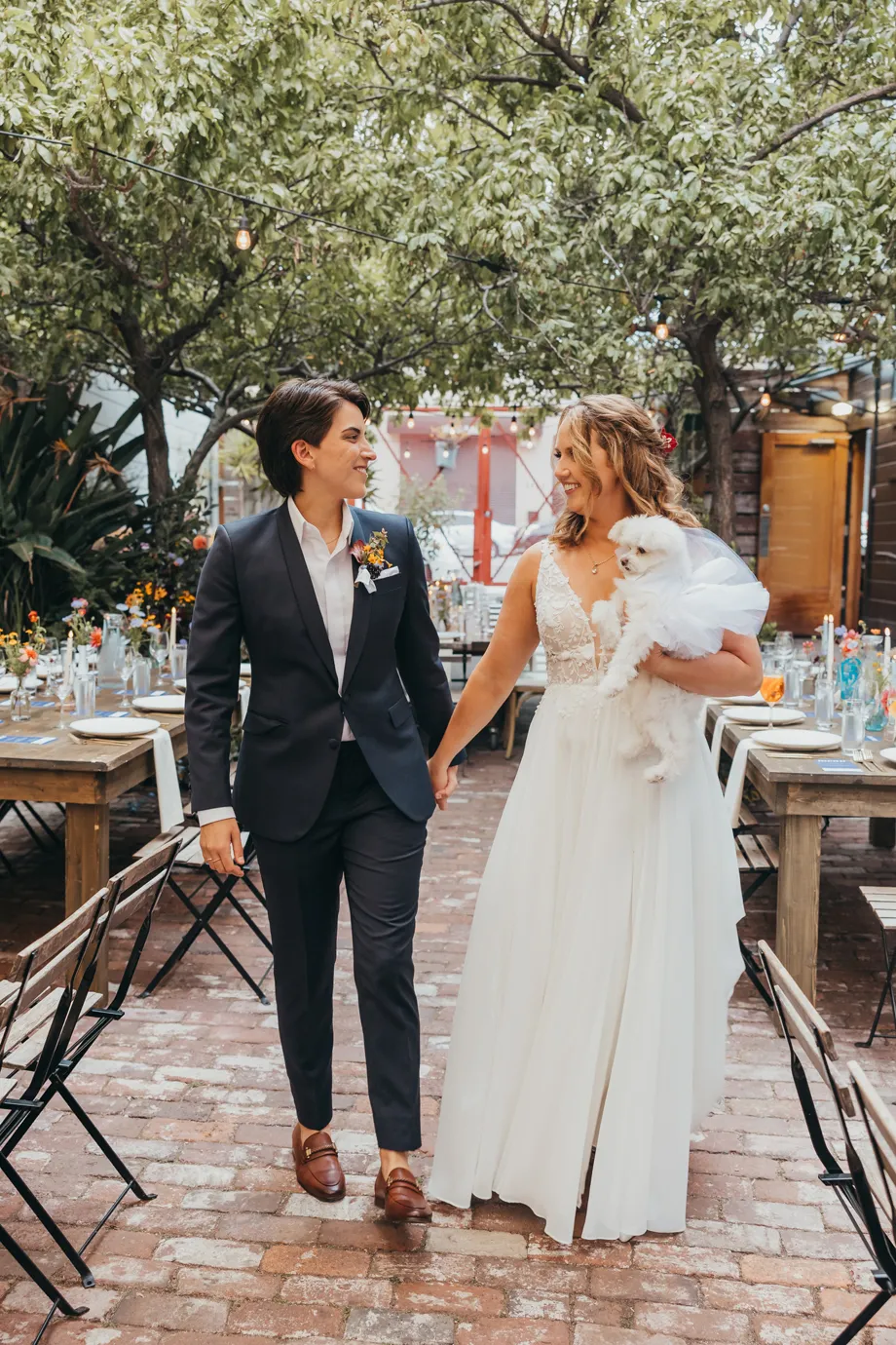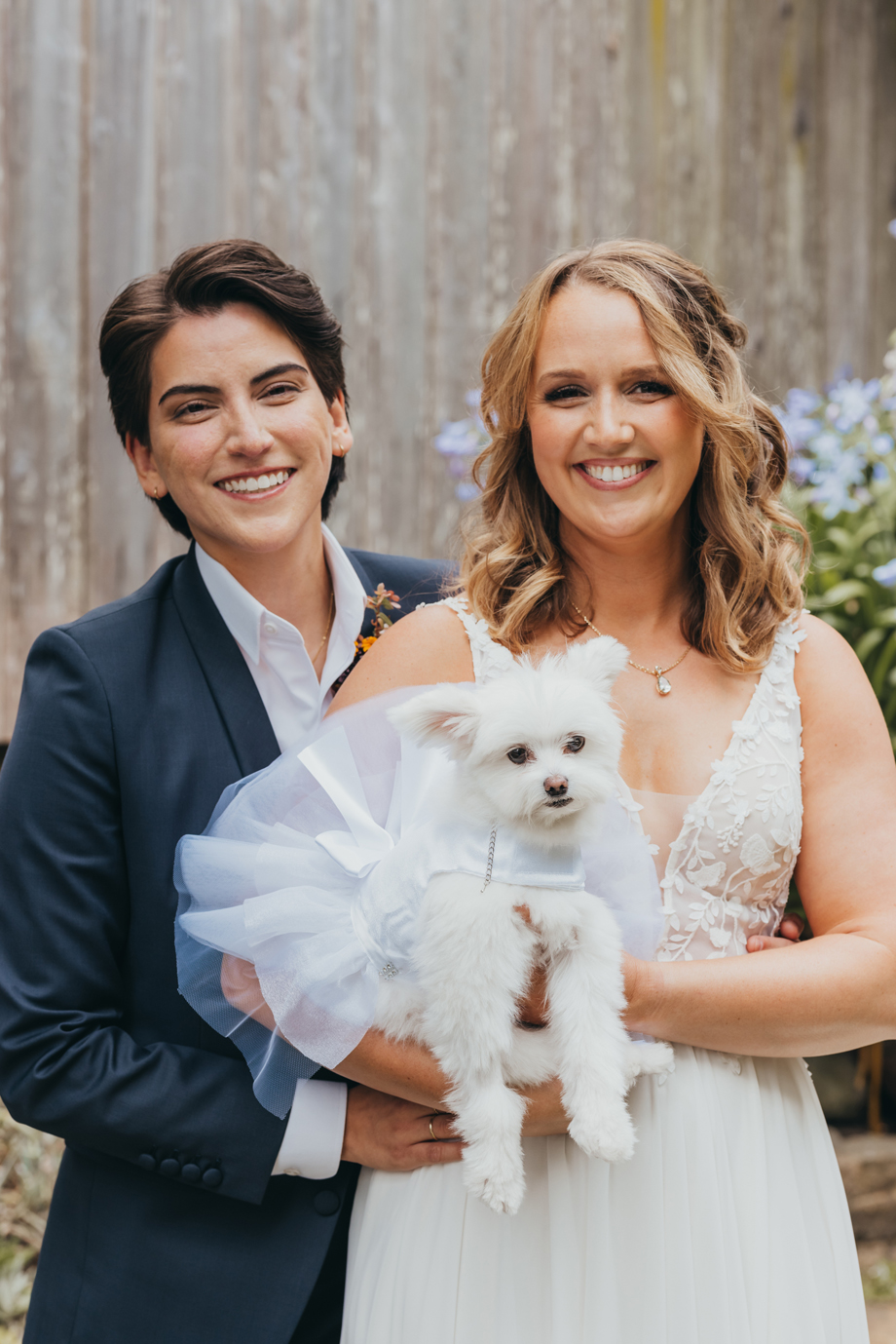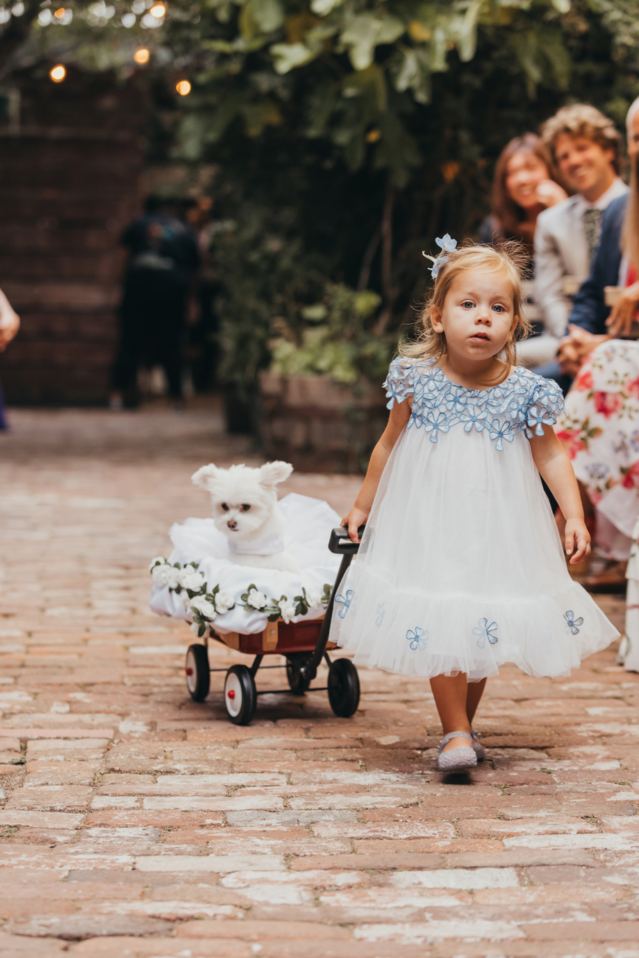 We had our dog, Lola, come down the aisle in a decorated wagon. She is our princess so it was very fitting. She was pulled by our flower girl, Eva, which was very special. Our close friend officiated the ceremony and we had another close friend read a poem by Frida Kahlo.