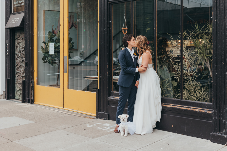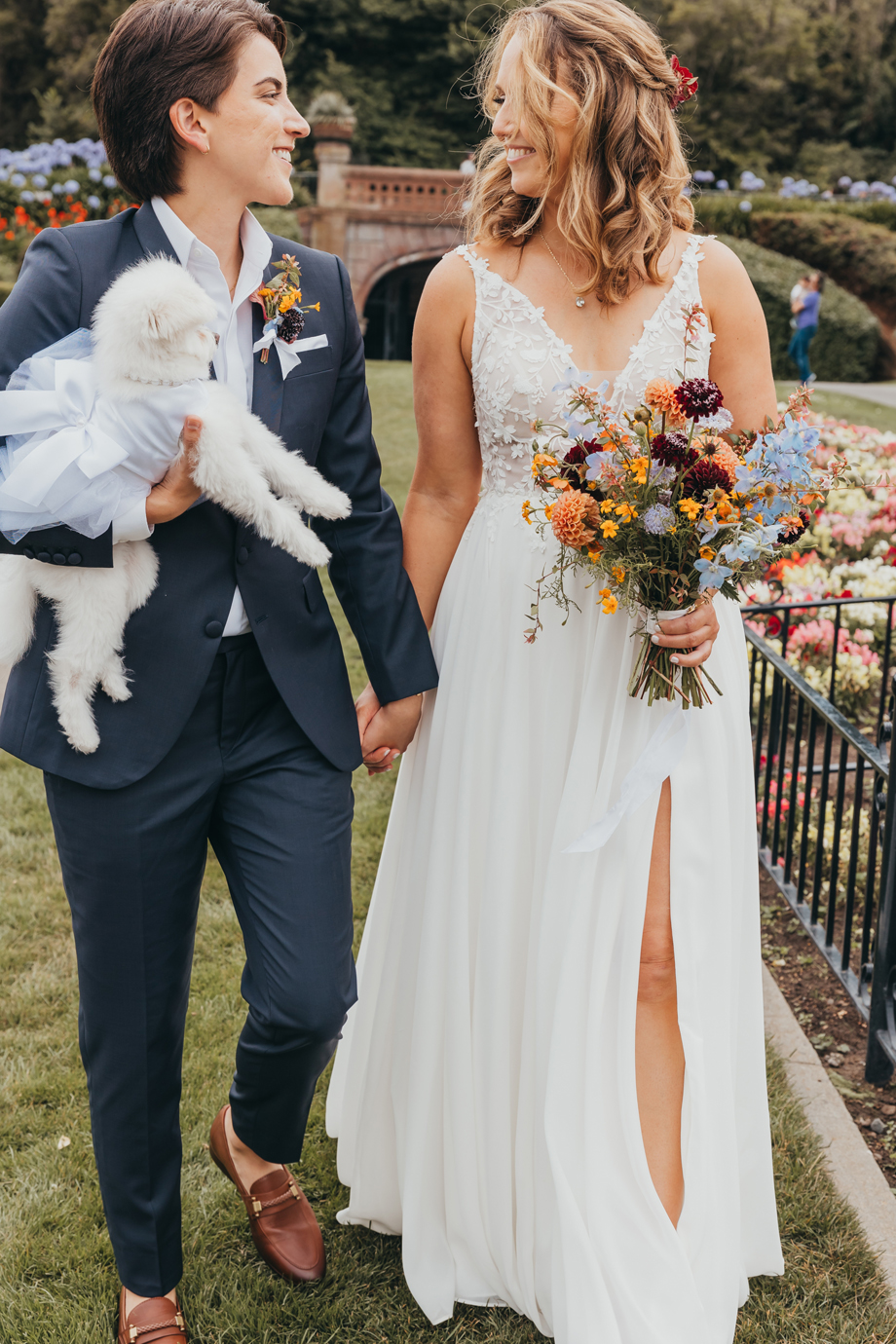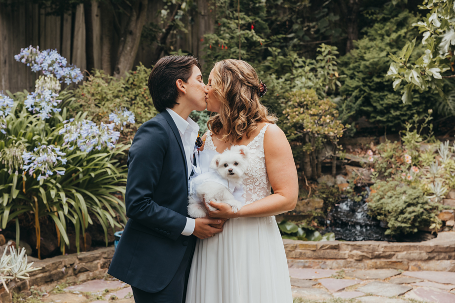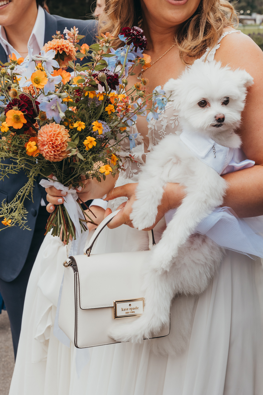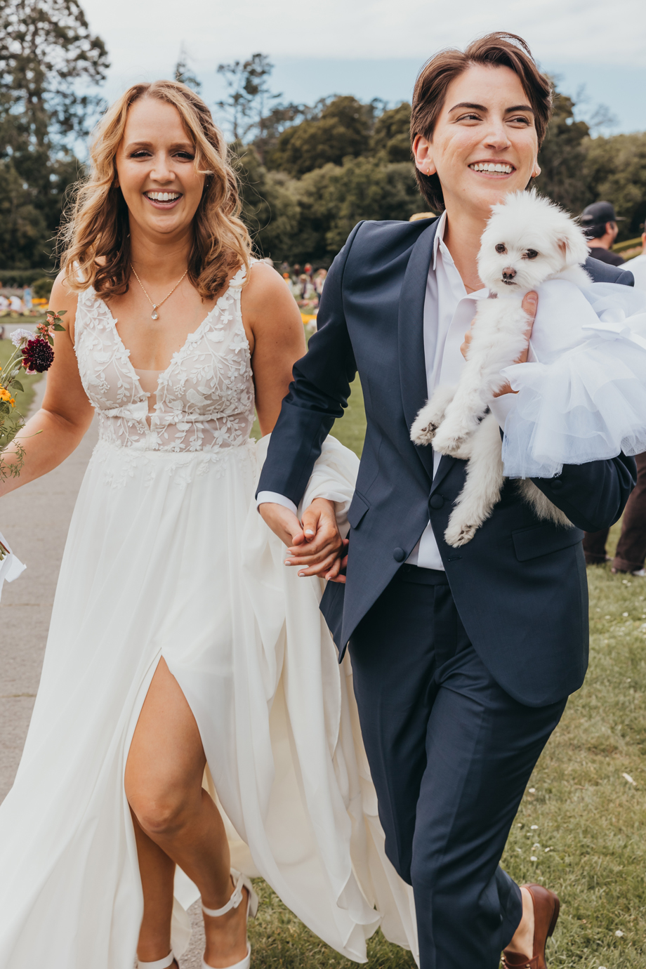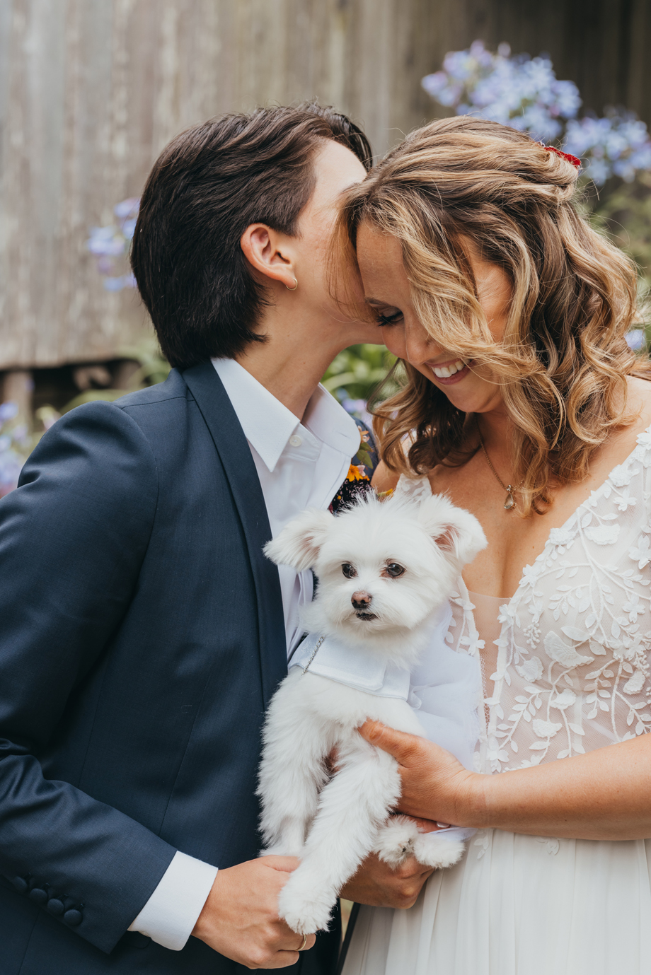 We had our dog, Lola, come down the aisle in a decorated wagon. She is our princess so it was very fitting. She was pulled by our flower girl, Eva, which was very special. Our close friend officiated the ceremony and we had another close friend read a poem by Frida Kahlo.