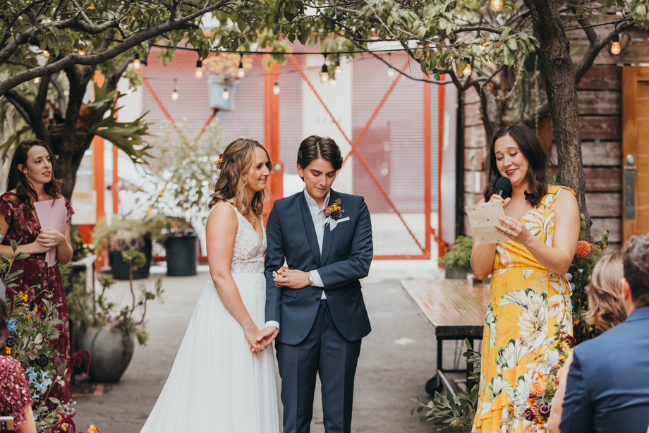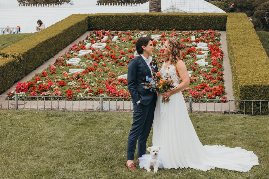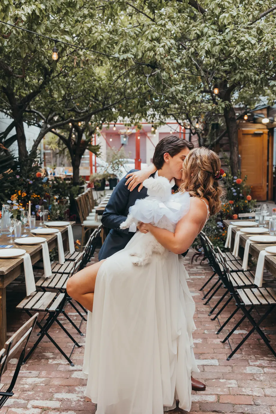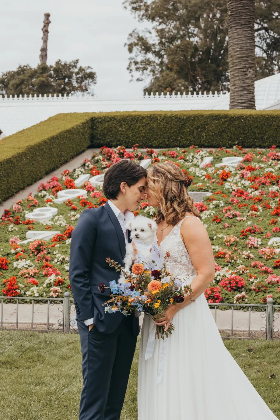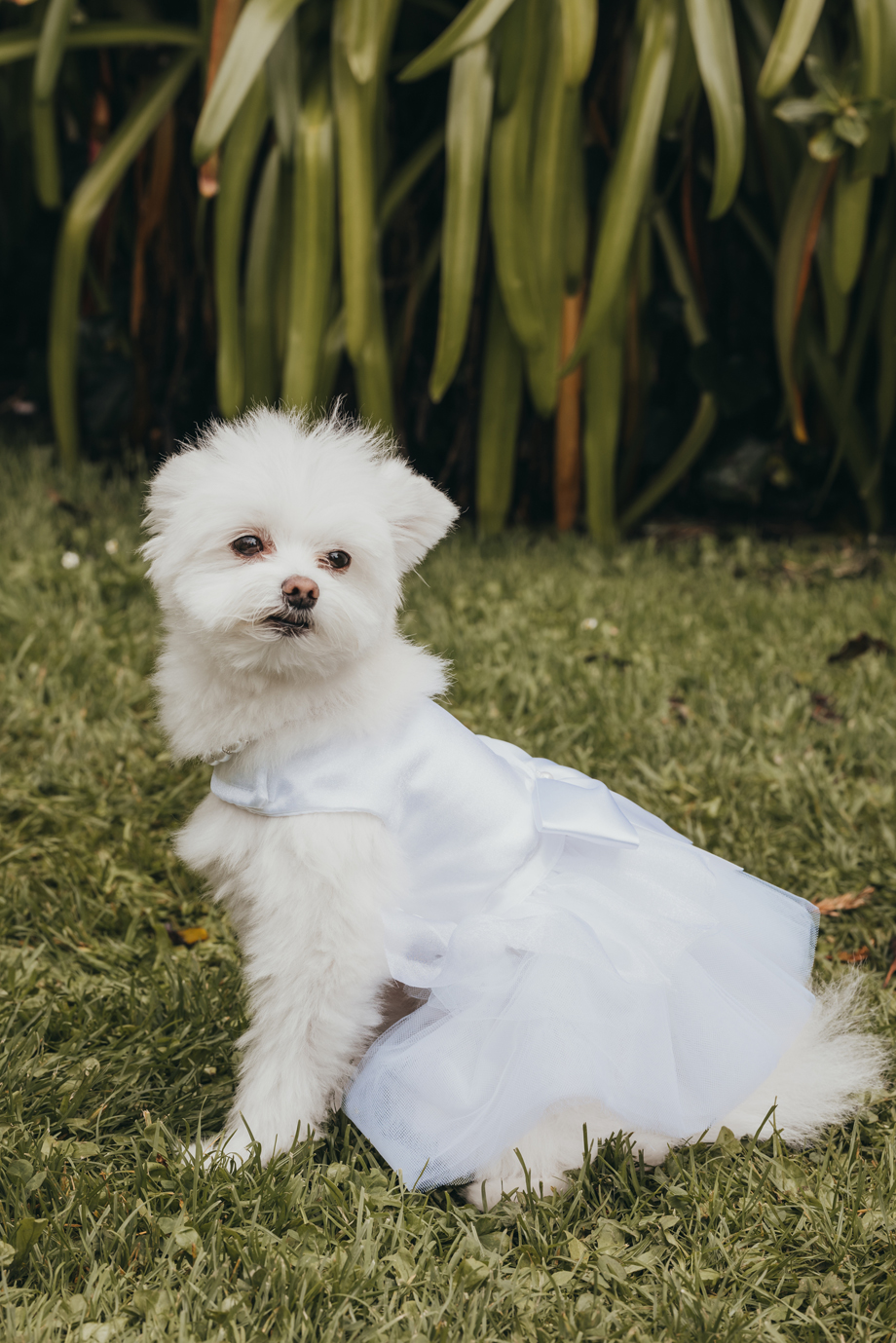 We had our dog, Lola, come down the aisle in a decorated wagon. She is our princess so it was very fitting. She was pulled by our flower girl, Eva, which was very special. Our close friend officiated the ceremony and we had another close friend read a poem by Frida Kahlo.