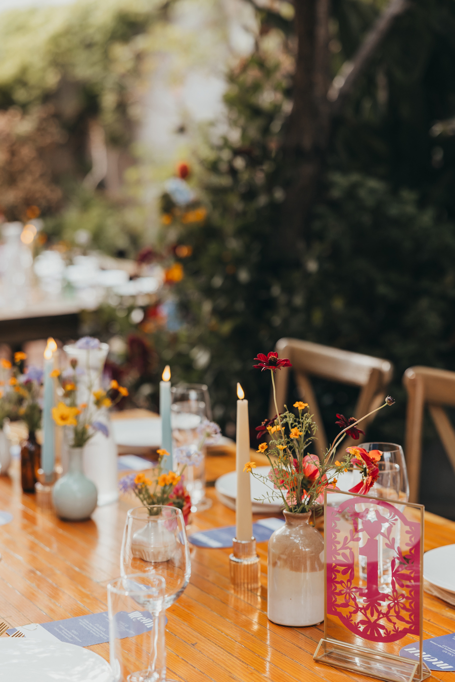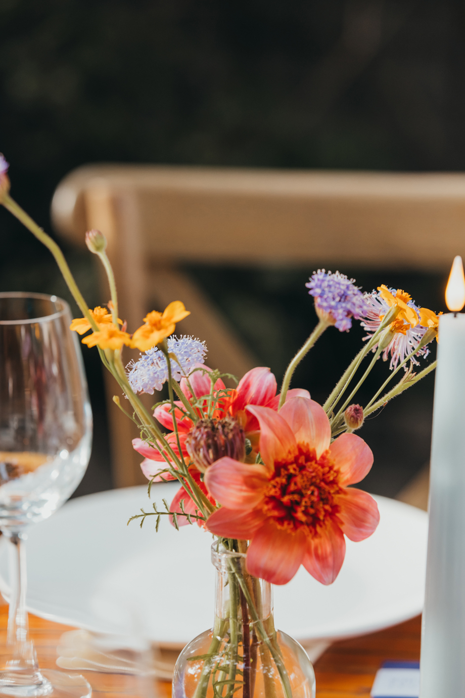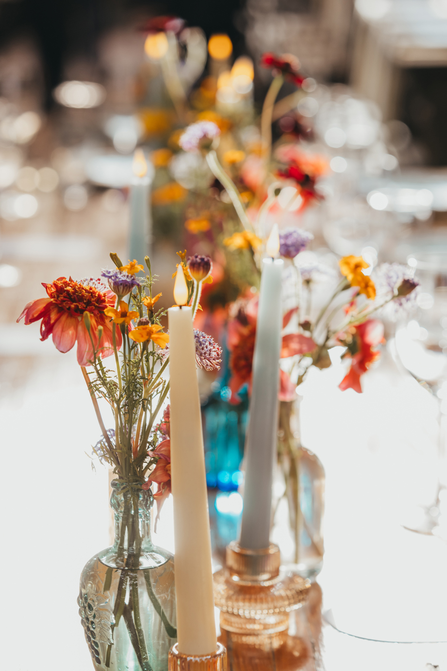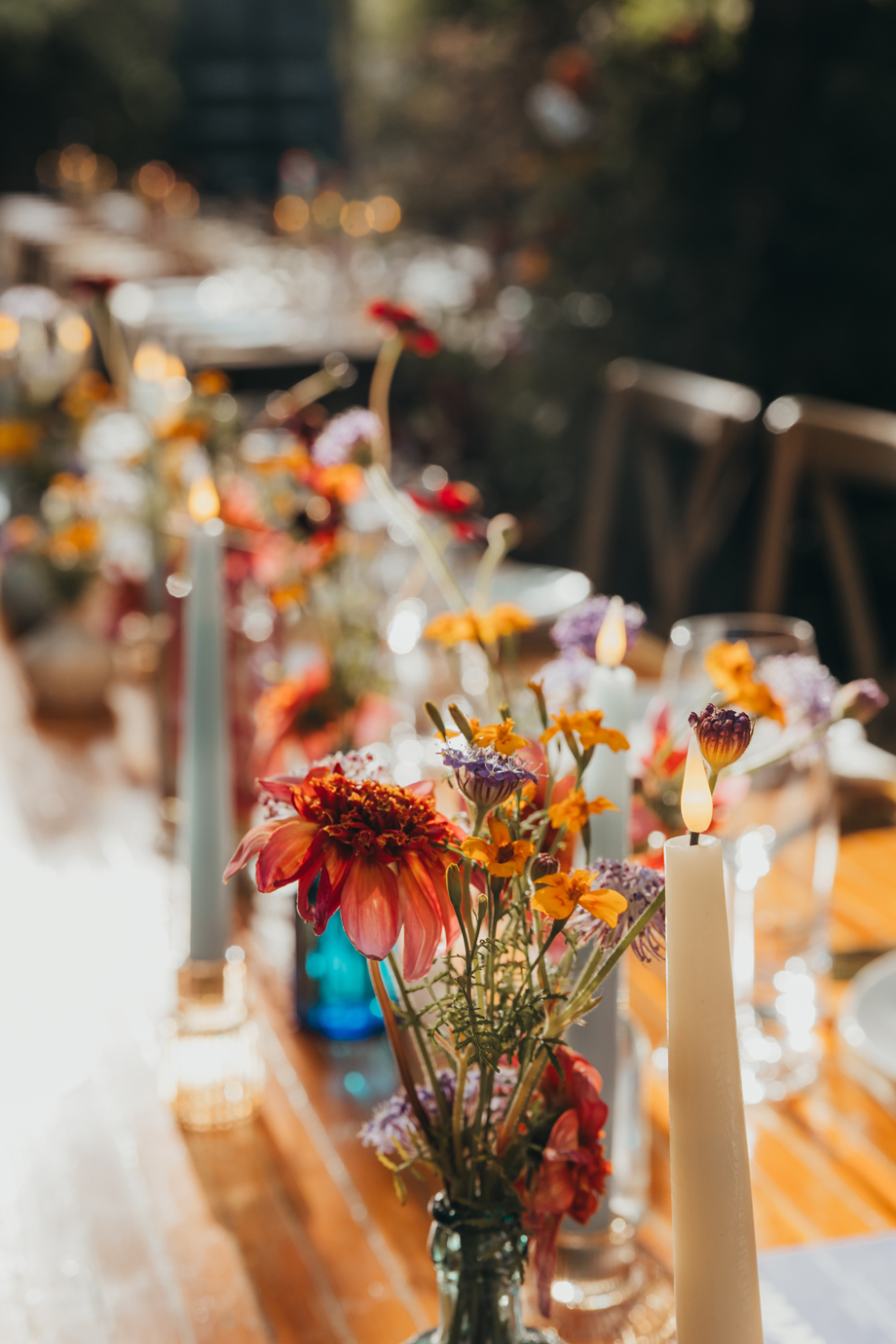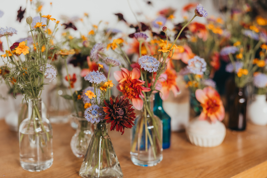 I loved the flowers so much, they were exactly what I had envisioned. I collected bud vases of all different colors and shapes from thrift stores for over a year and the florist used them all to create the centerpieces. At the end of the night guests were able to take home a vase of flowers.
