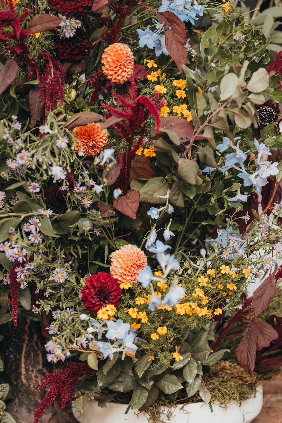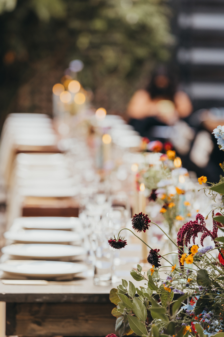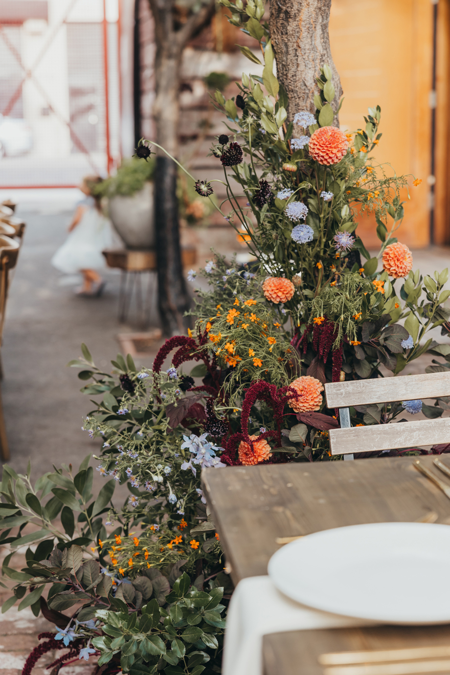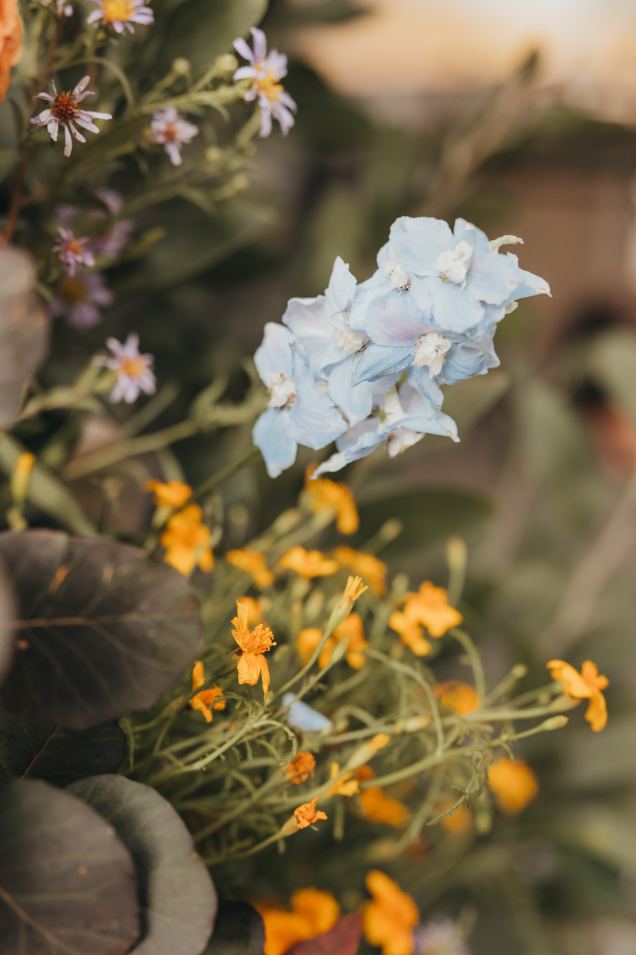 I loved the flowers so much, they were exactly what I had envisioned. I collected bud vases of all different colors and shapes from thrift stores for over a year and the florist used them all to create the centerpieces. At the end of the night guests were able to take home a vase of flowers.