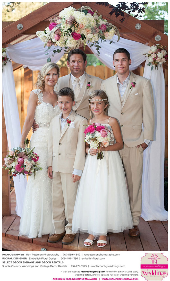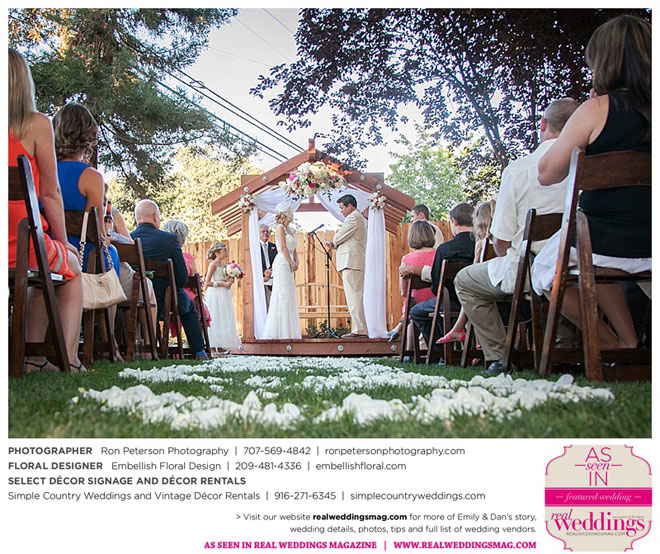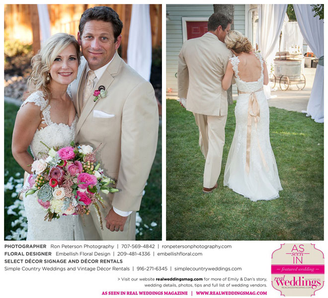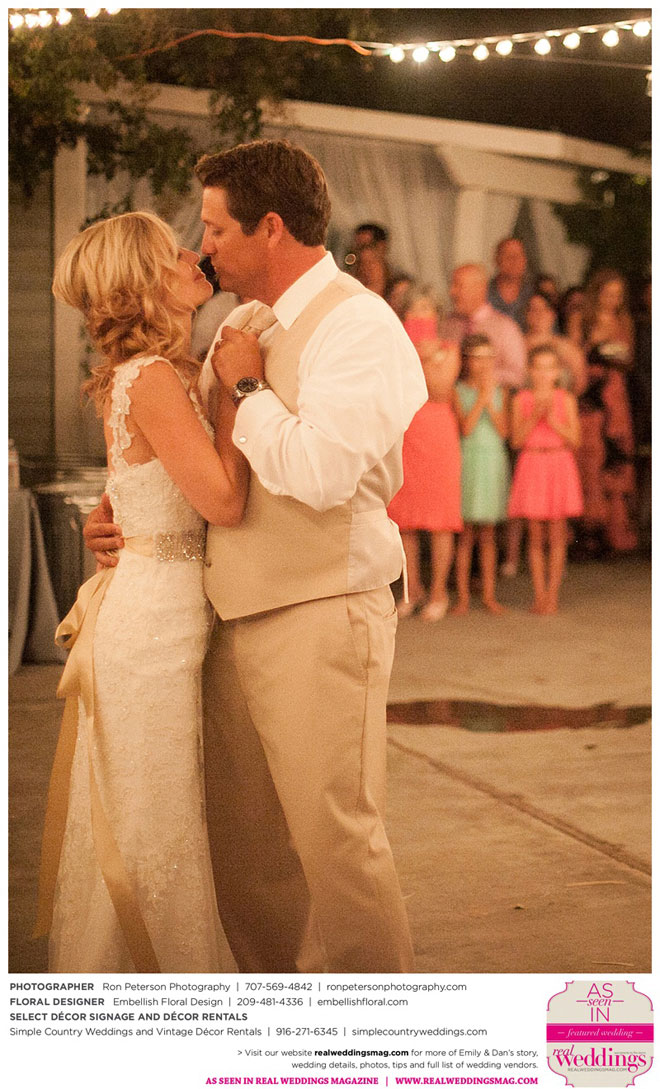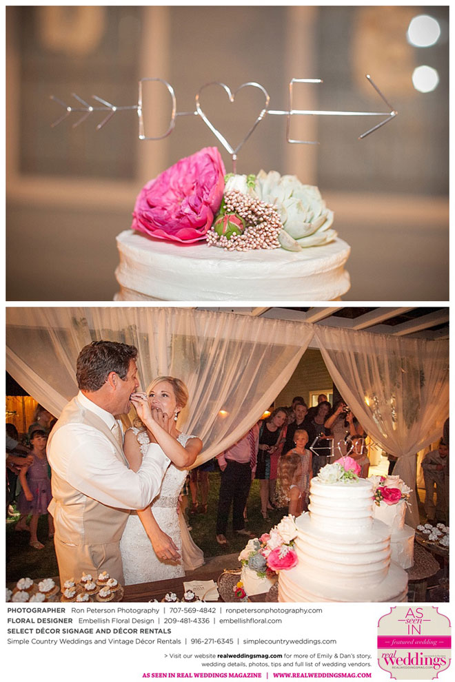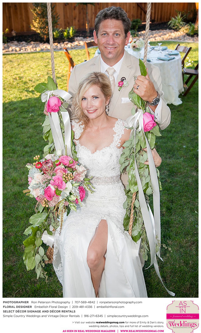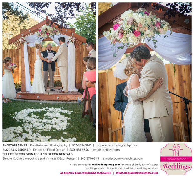 Dan says he was “definitely stunned” when he first saw Emily, “although it was not a surprise because she is always beautiful.” Emily was wowed by her groom, too. “I peeked out the sliding glass bedroom door where I was getting ready and saw him walk into the backyard,” she says. “He looked amazingly handsome in his suit. I couldn’t wait to be with him. It was so exciting!”