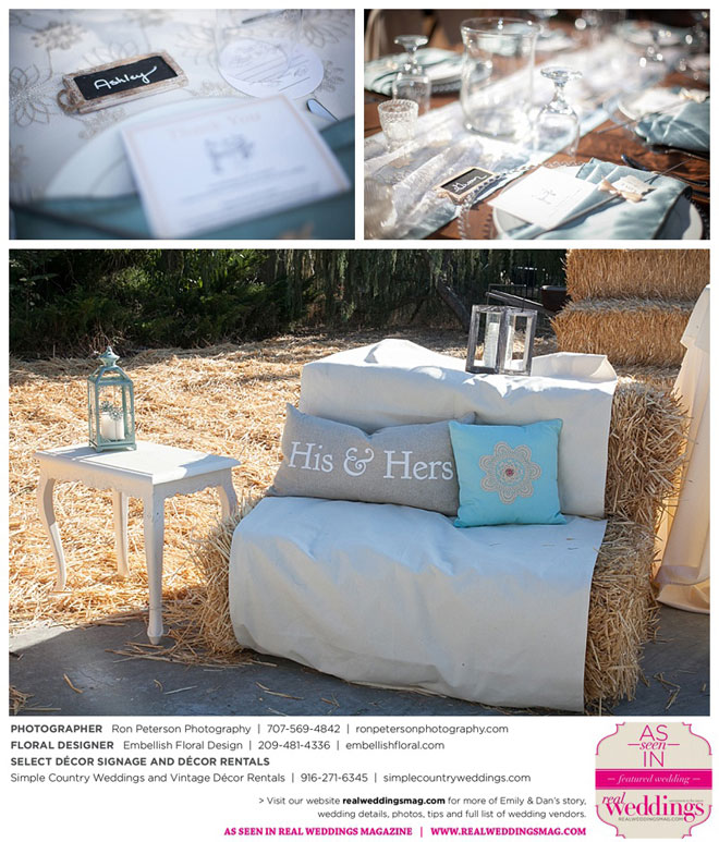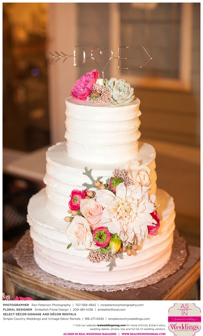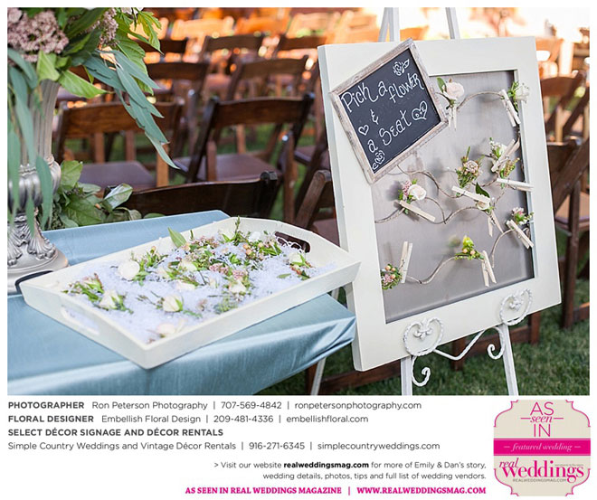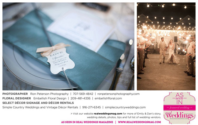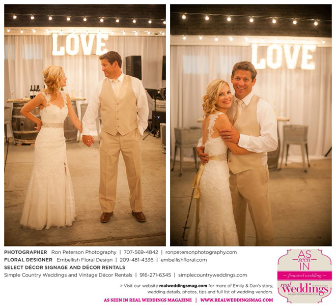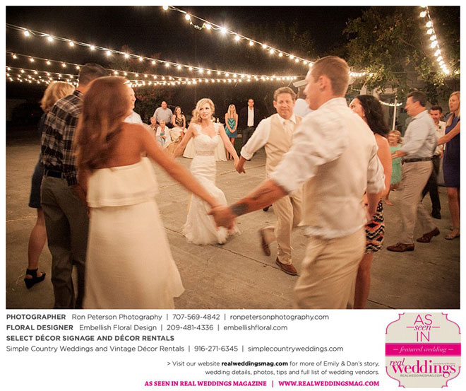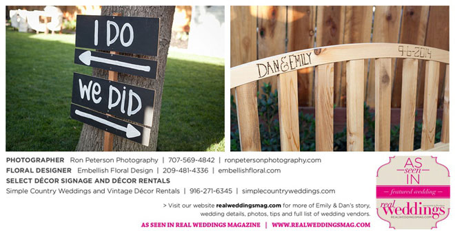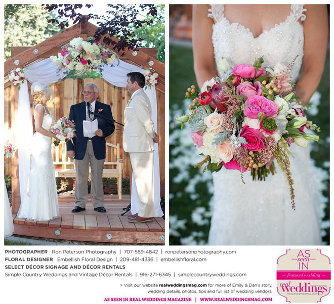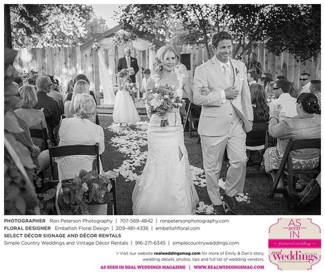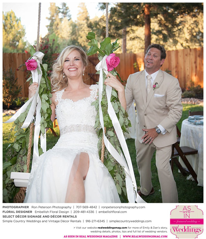 Dan says he was “definitely stunned” when he first saw Emily, “although it was not a surprise because she is always beautiful.” Emily was wowed by her groom, too. “I peeked out the sliding glass bedroom door where I was getting ready and saw him walk into the backyard,” she says. “He looked amazingly handsome in his suit. I couldn’t wait to be with him. It was so exciting!”