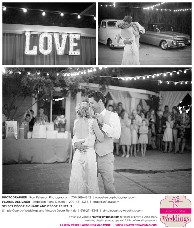 They took photos “all over the yard” says Emily, noting that they posed in front of the arbor/altar, on the swing, in front of a “Love” sign that the groom made, and in front of old Chevy pick-up trucks loaned to the couple specifically for their wedding.