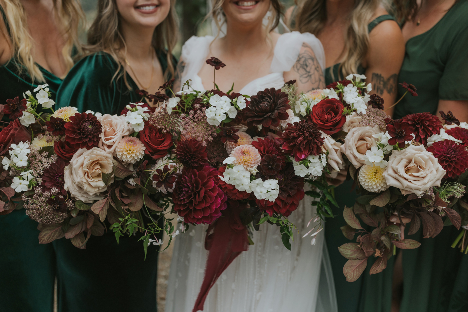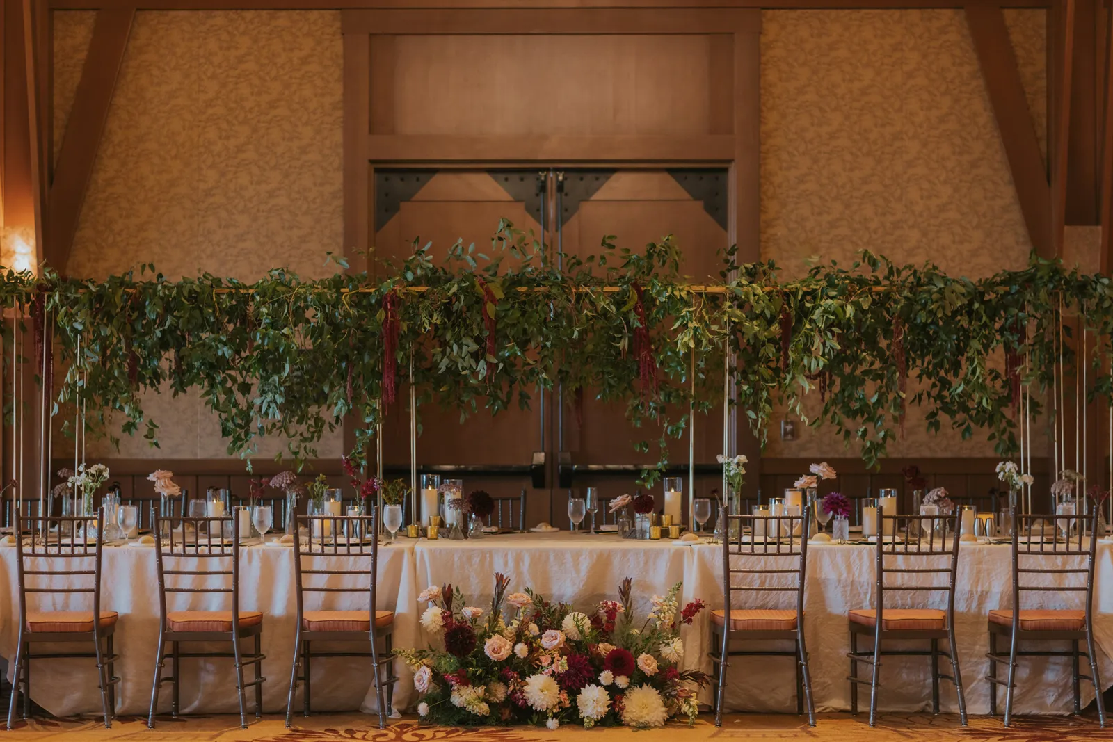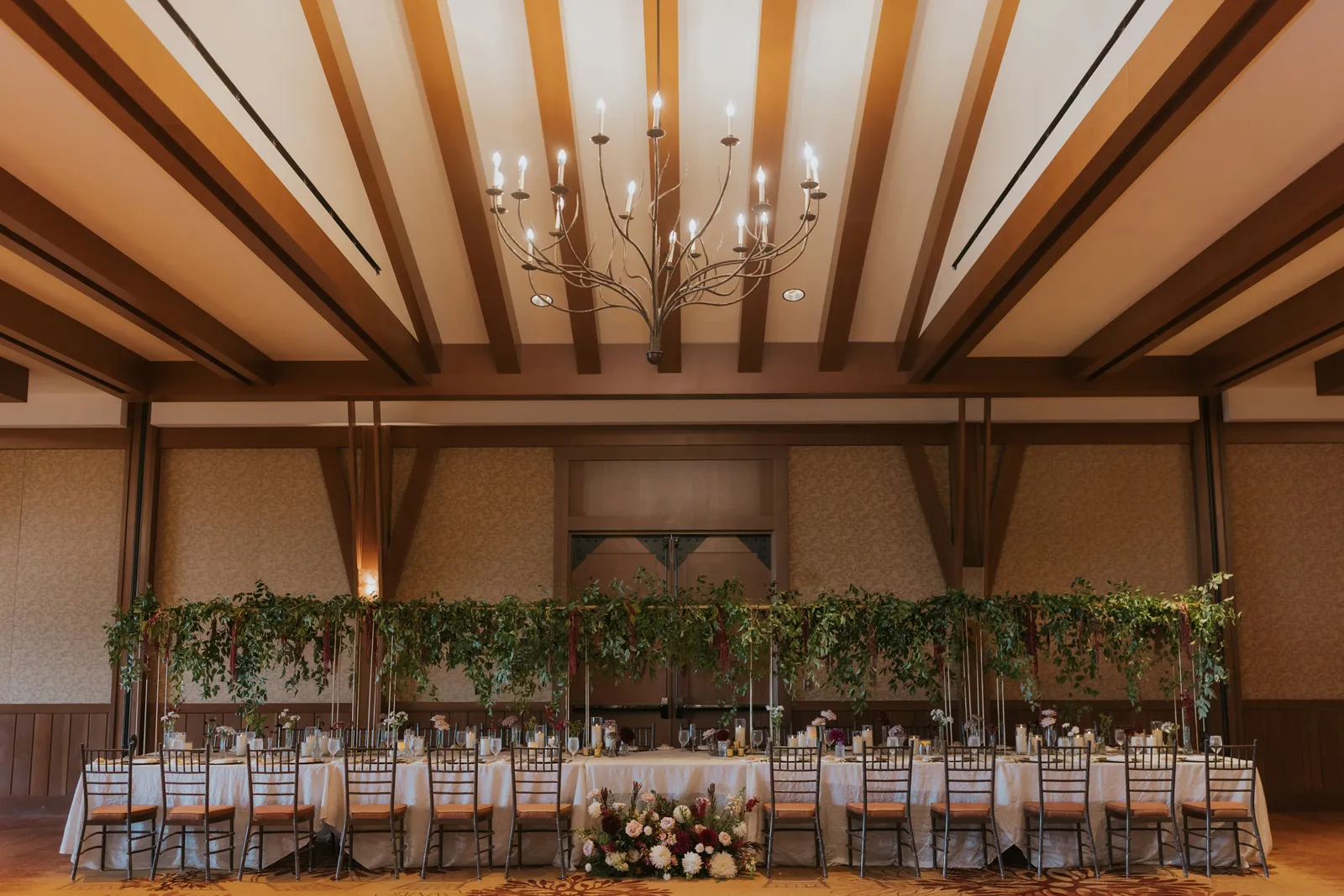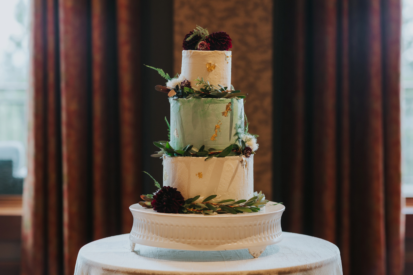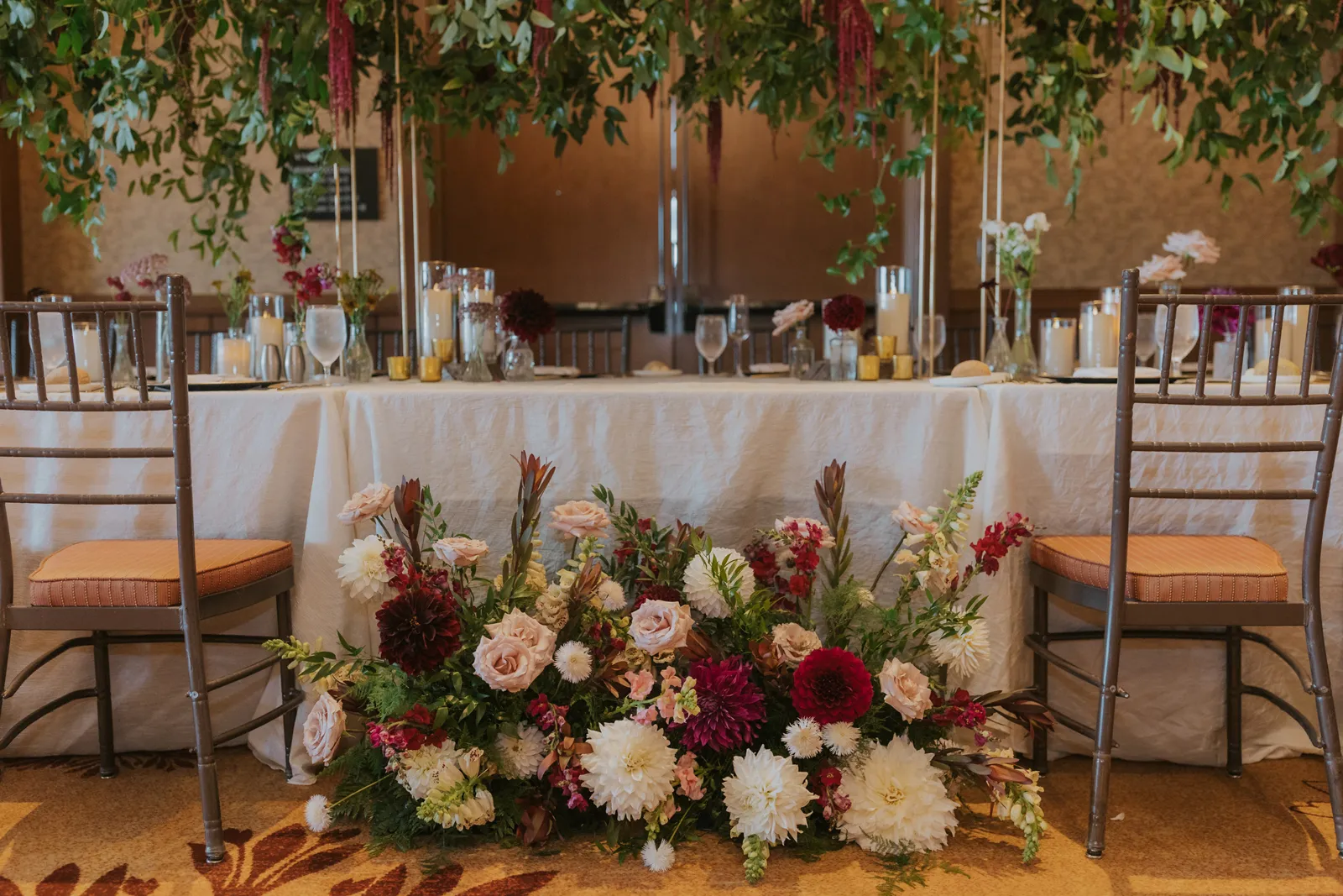 The florals. Other than the photos, they were the most important part of the day. I was going for a moody forest vibe and wanted to feel like we brought the outside into the ballroom. We chose really dark reds and burgundy contrasted with soft whites. The deep reds went so well with the green bridesmaids’ dresses and Jake’s green suit. The arch had some of the biggest dahlias I had ever seen and our floral designer, Shelayne, even added some fresh jasmine into my bouquet—it smelled so good! I can’t even put into words how much we loved our head table. It was more beautiful than I could have ever imagined. Working with