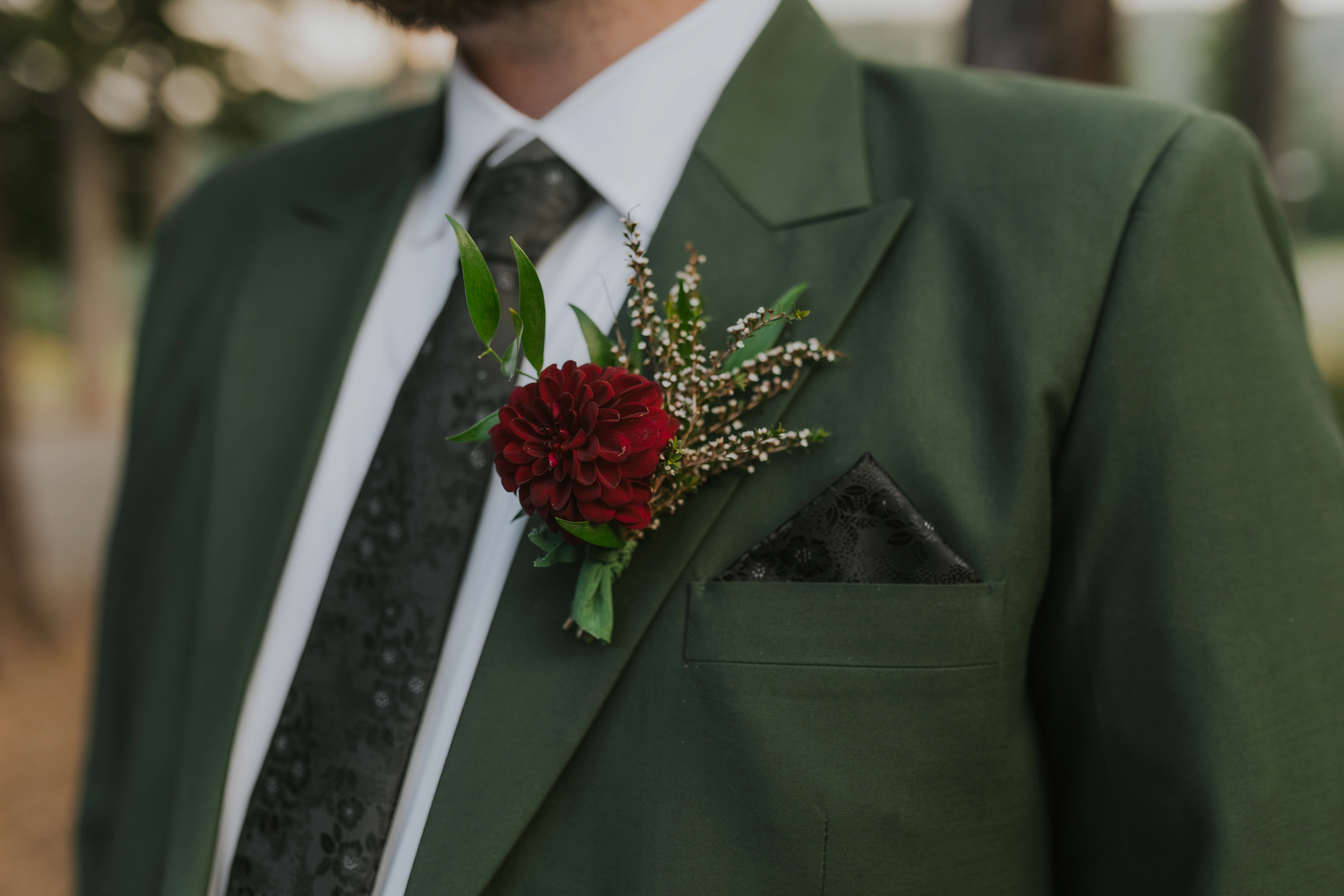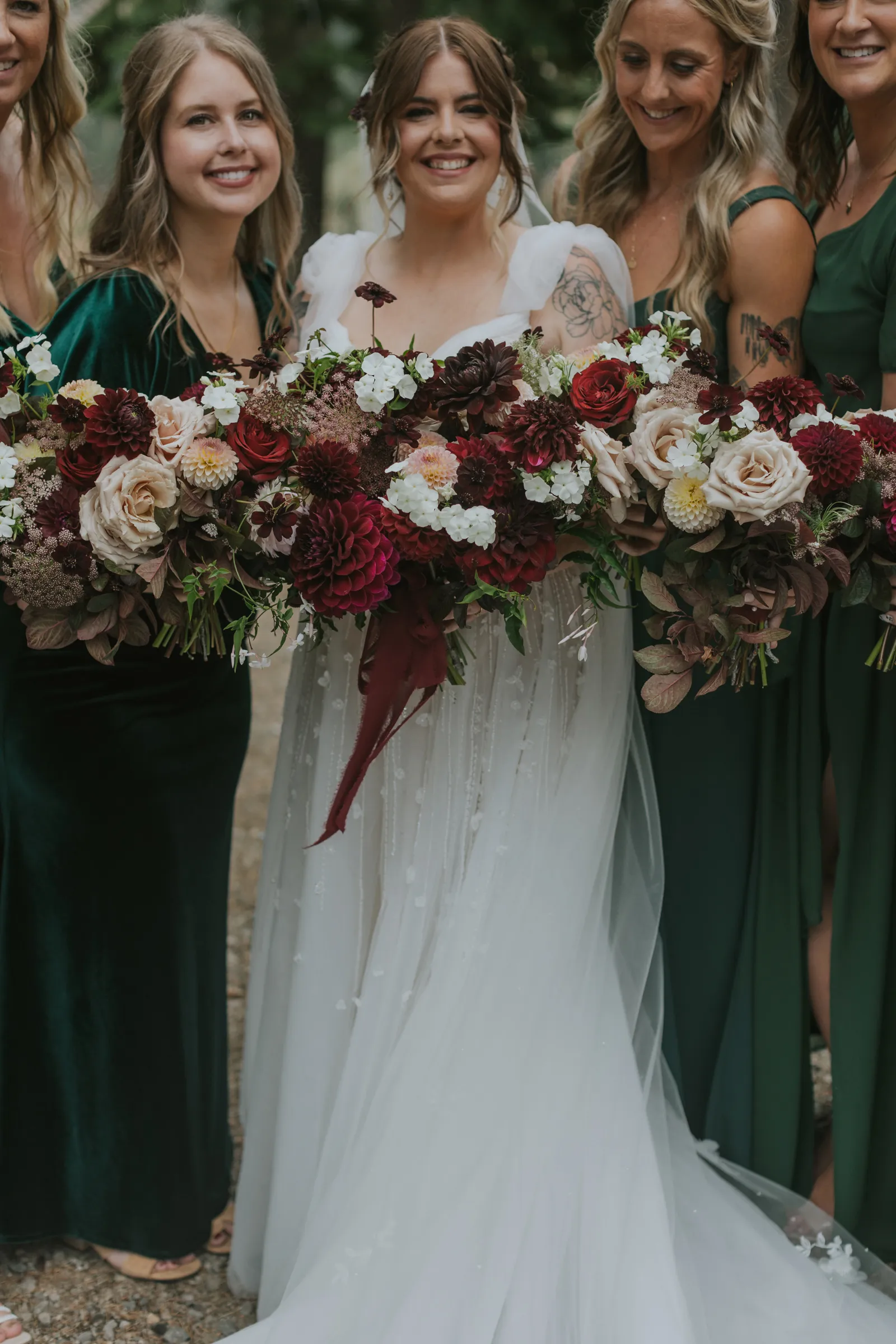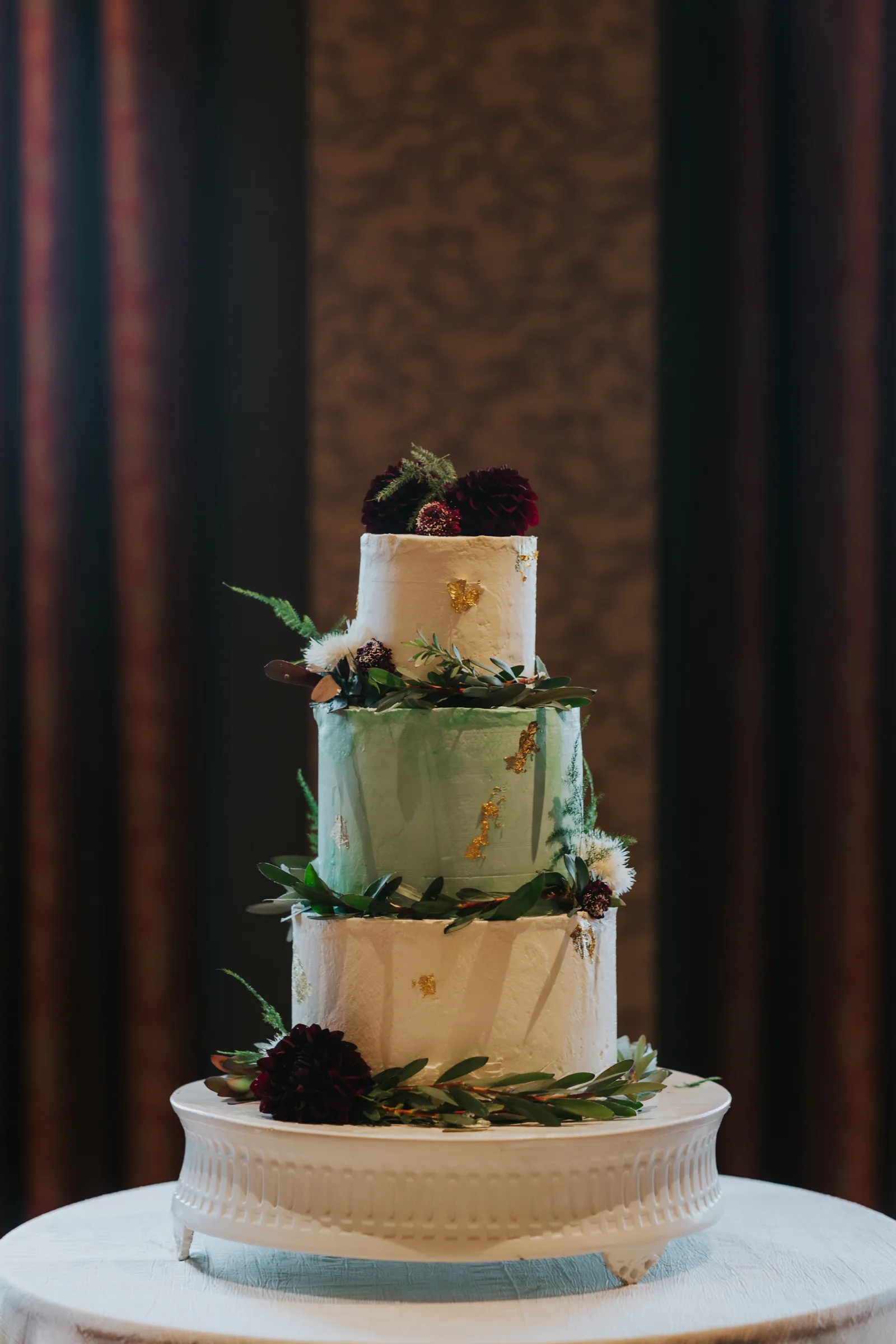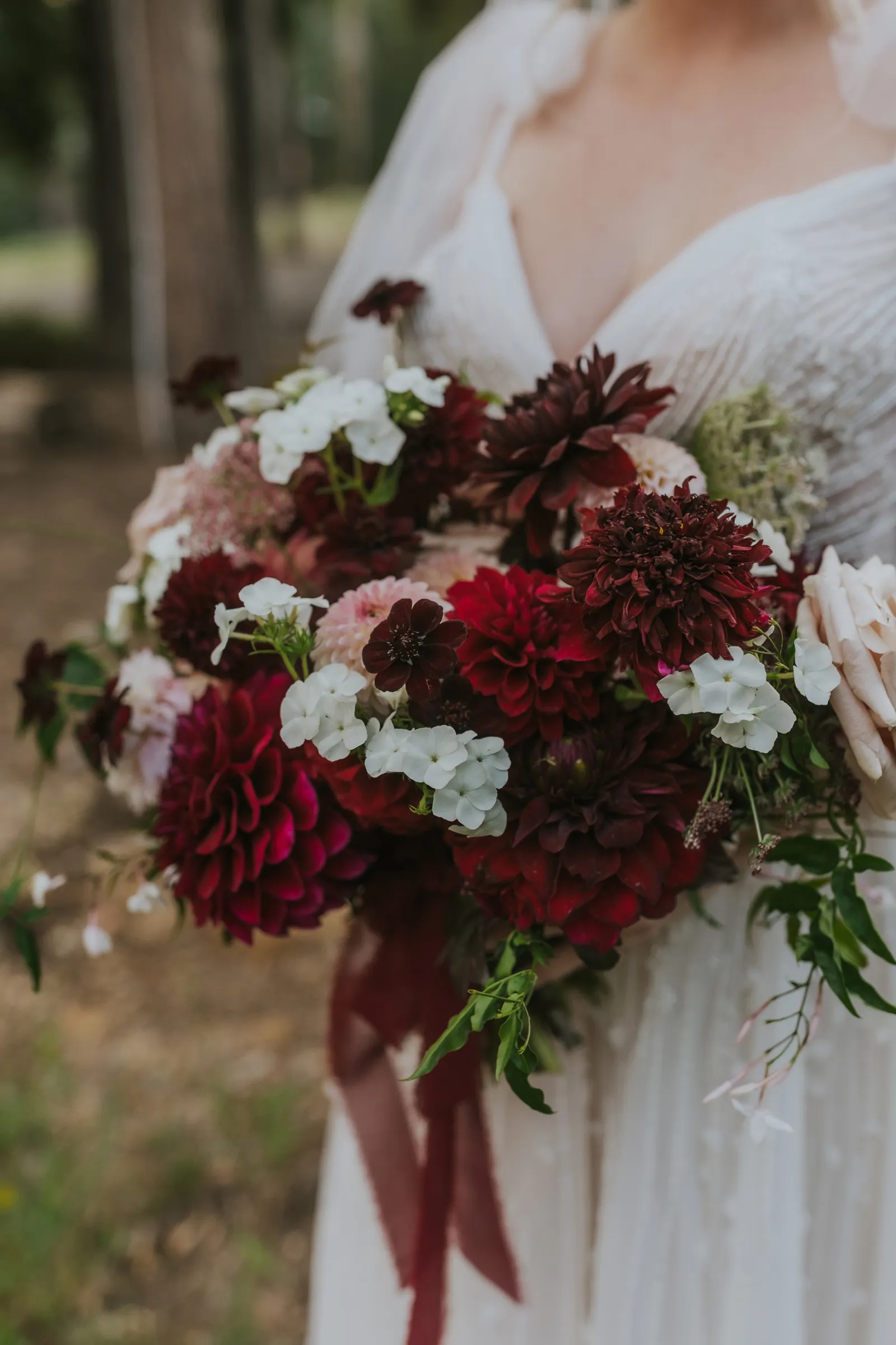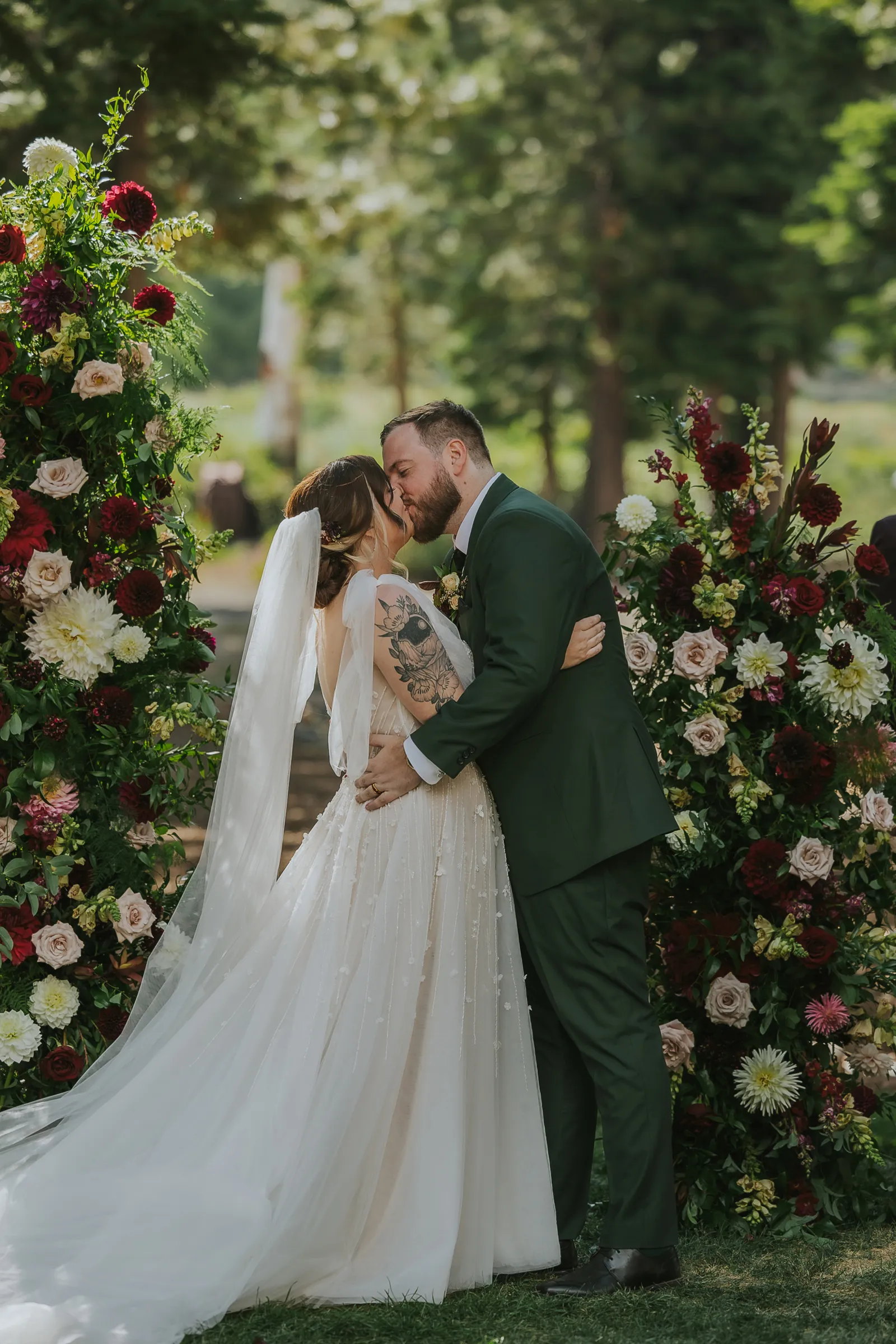 The florals. Other than the photos, they were the most important part of the day. I was going for a moody forest vibe and wanted to feel like we brought the outside into the ballroom. We chose really dark reds and burgundy contrasted with soft whites. The deep reds went so well with the green bridesmaids’ dresses and Jake’s green suit. The arch had some of the biggest dahlias I had ever seen and our floral designer, Shelayne, even added some fresh jasmine into my bouquet—it smelled so good! I can’t even put into words how much we loved our head table. It was more beautiful than I could have ever imagined. Working with