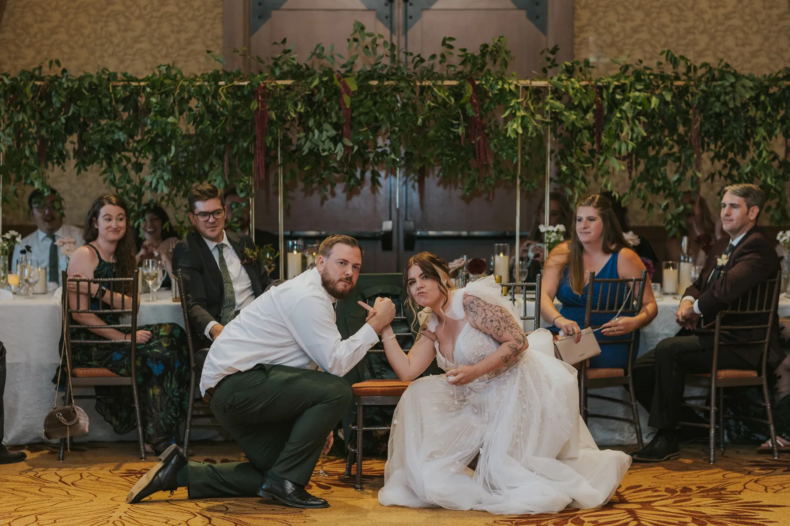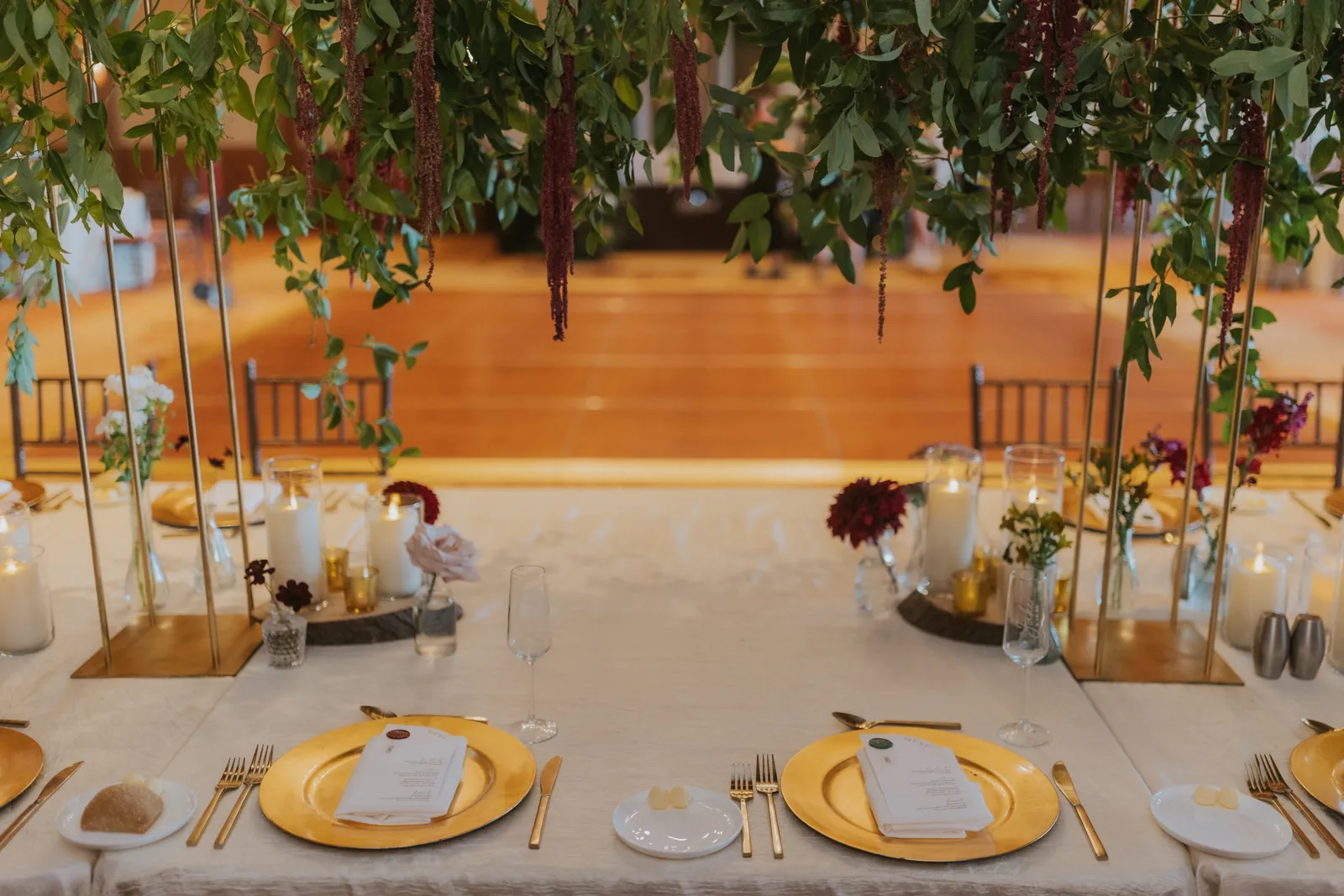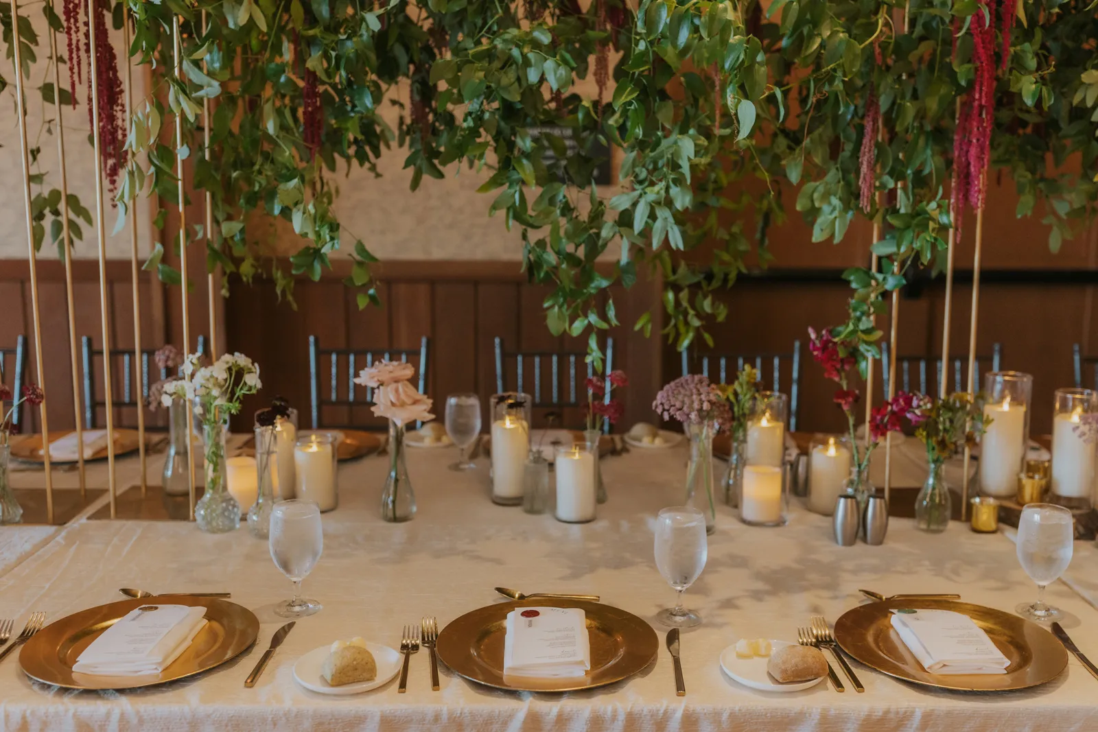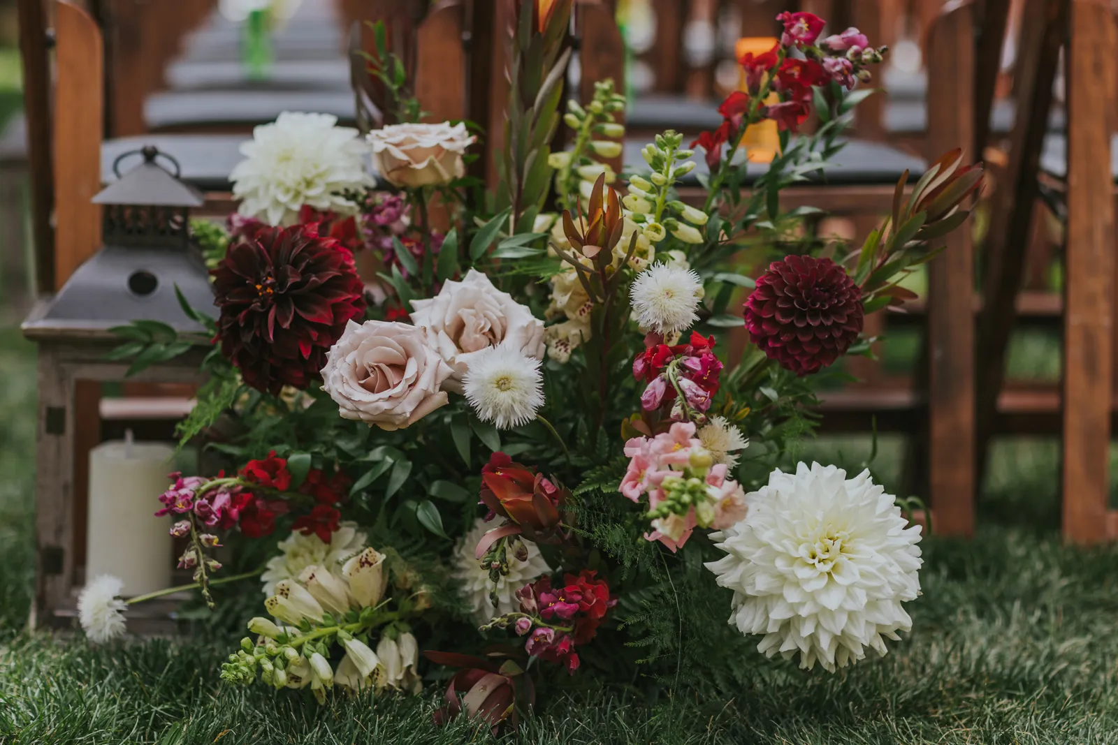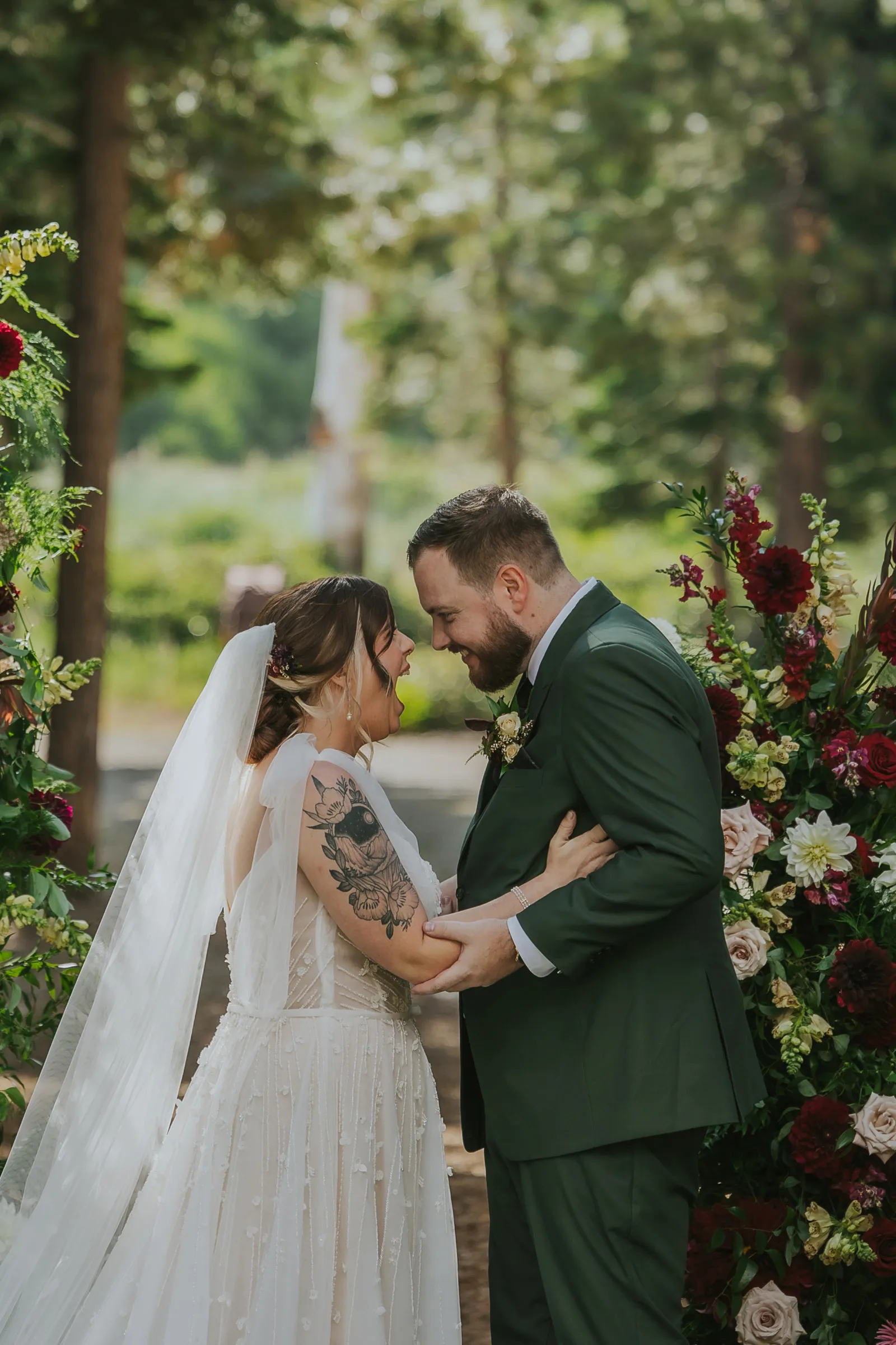 The florals. Other than the photos, they were the most important part of the day. I was going for a moody forest vibe and wanted to feel like we brought the outside into the ballroom. We chose really dark reds and burgundy contrasted with soft whites. The deep reds went so well with the green bridesmaids’ dresses and Jake’s green suit. The arch had some of the biggest dahlias I had ever seen and our floral designer, Shelayne, even added some fresh jasmine into my bouquet—it smelled so good! I can’t even put into words how much we loved our head table. It was more beautiful than I could have ever imagined. Working with