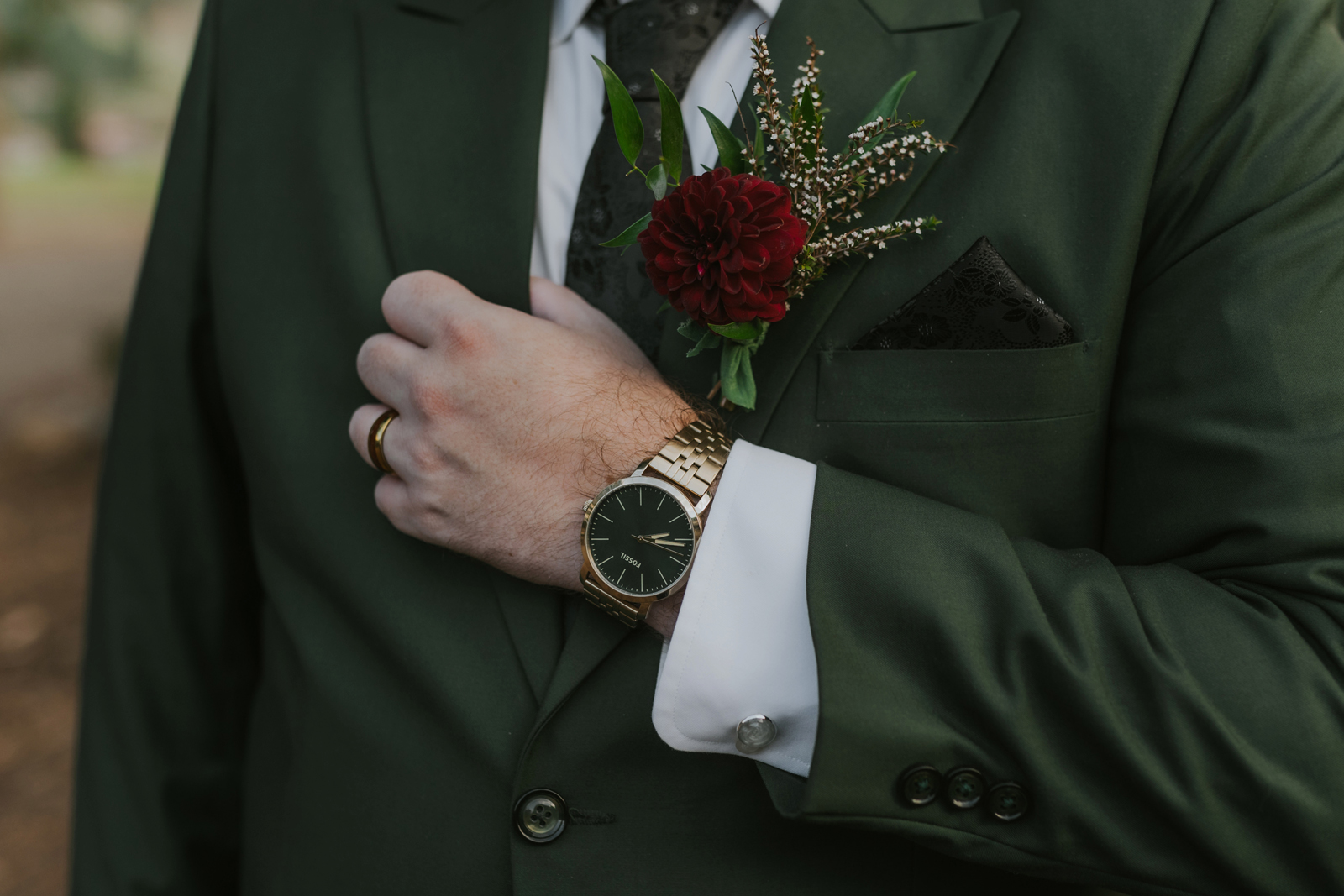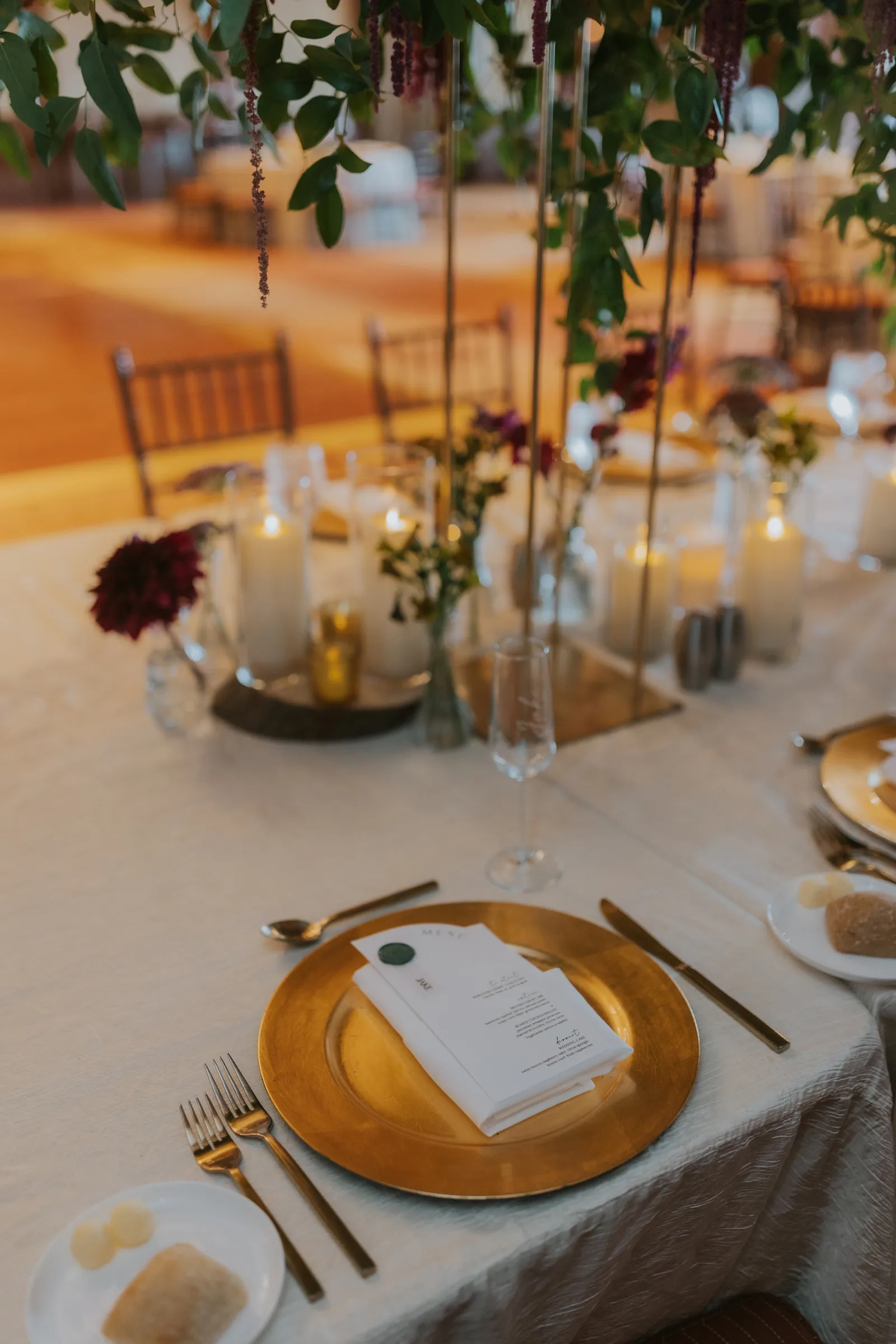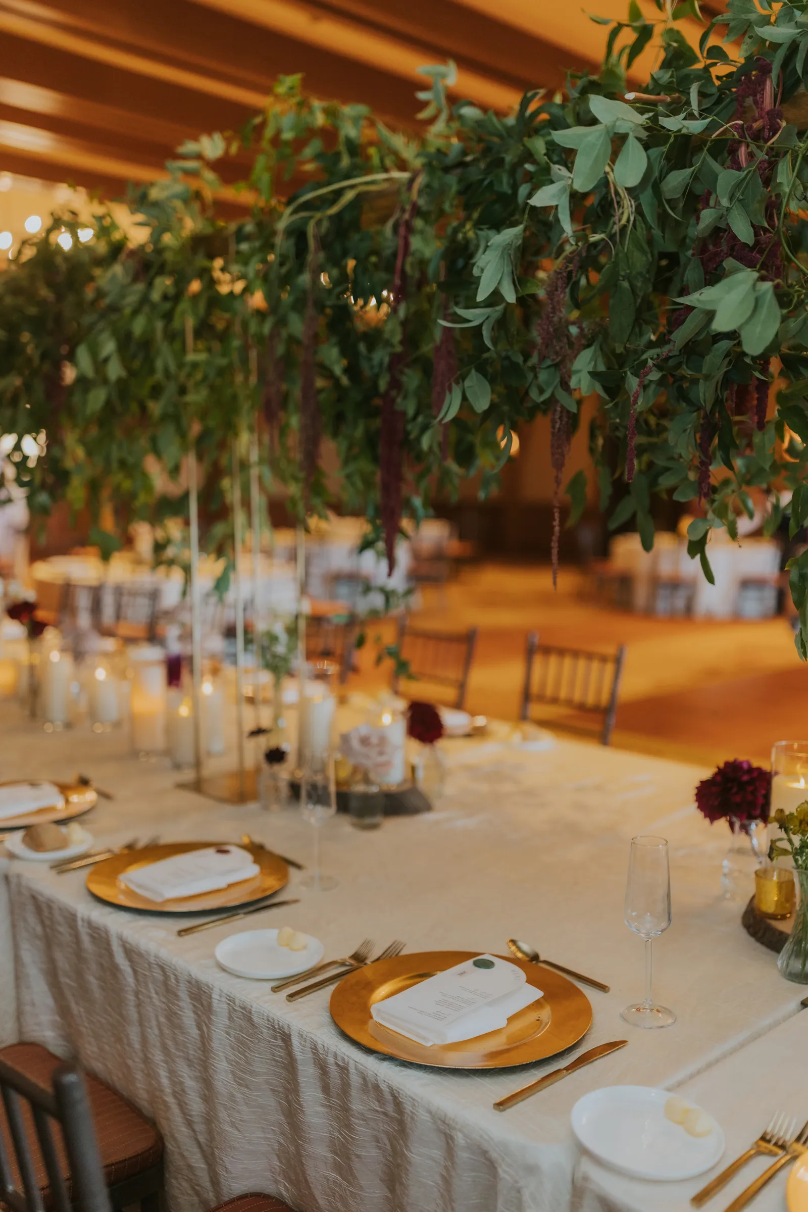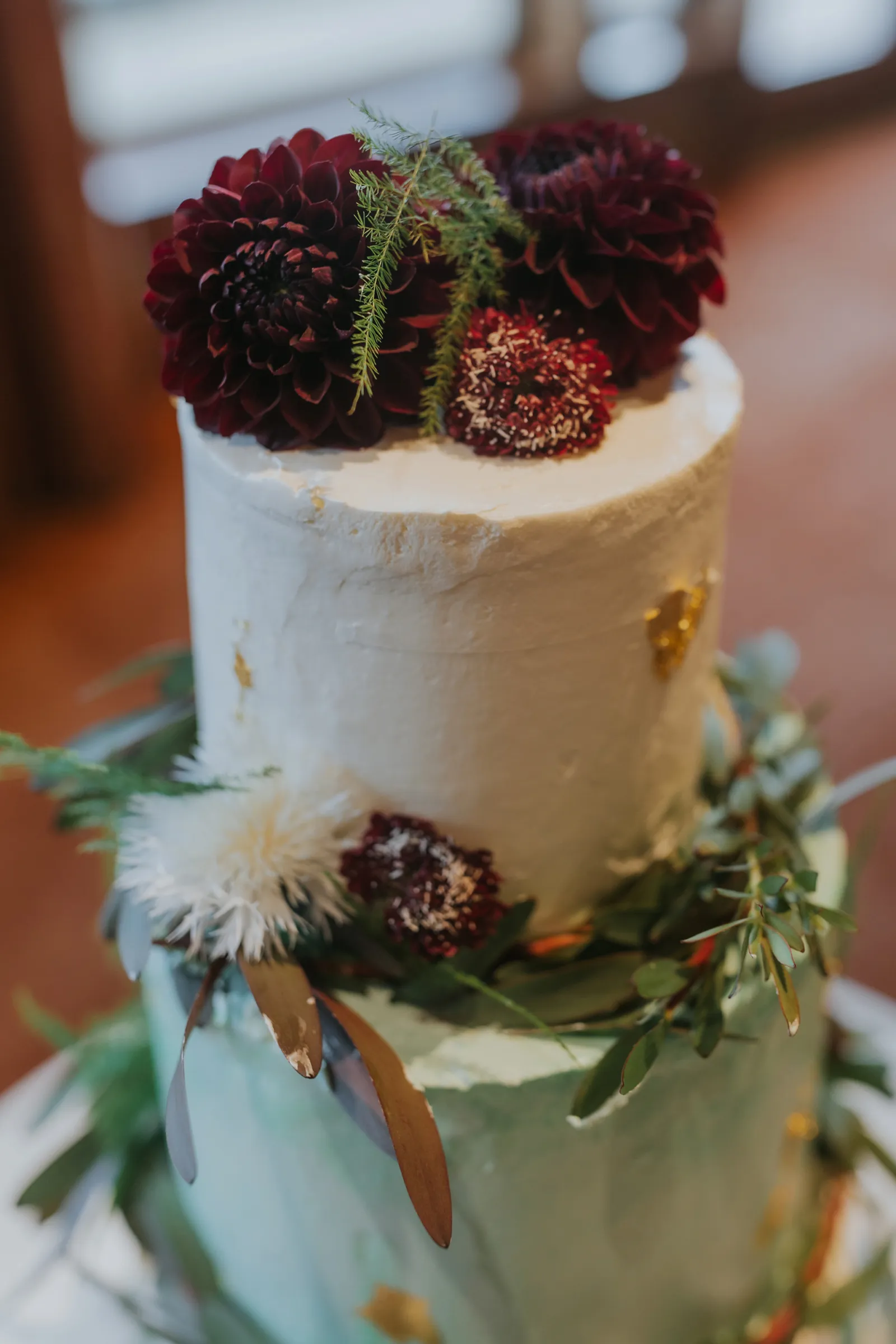 The florals. Other than the photos, they were the most important part of the day. I was going for a moody forest vibe and wanted to feel like we brought the outside into the ballroom. We chose really dark reds and burgundy contrasted with soft whites. The deep reds went so well with the green bridesmaids’ dresses and Jake’s green suit. The arch had some of the biggest dahlias I had ever seen and our floral designer, Shelayne, even added some fresh jasmine into my bouquet—it smelled so good! I can’t even put into words how much we loved our head table. It was more beautiful than I could have ever imagined. Working with