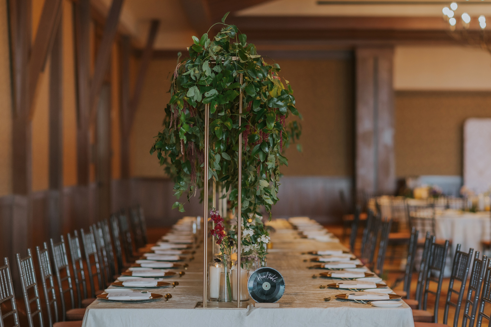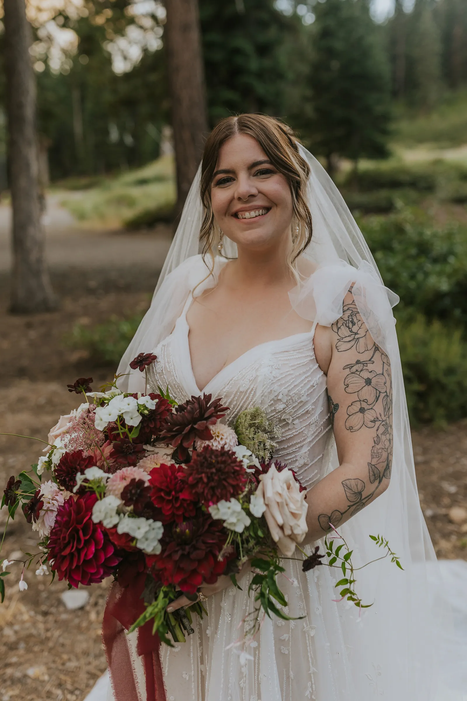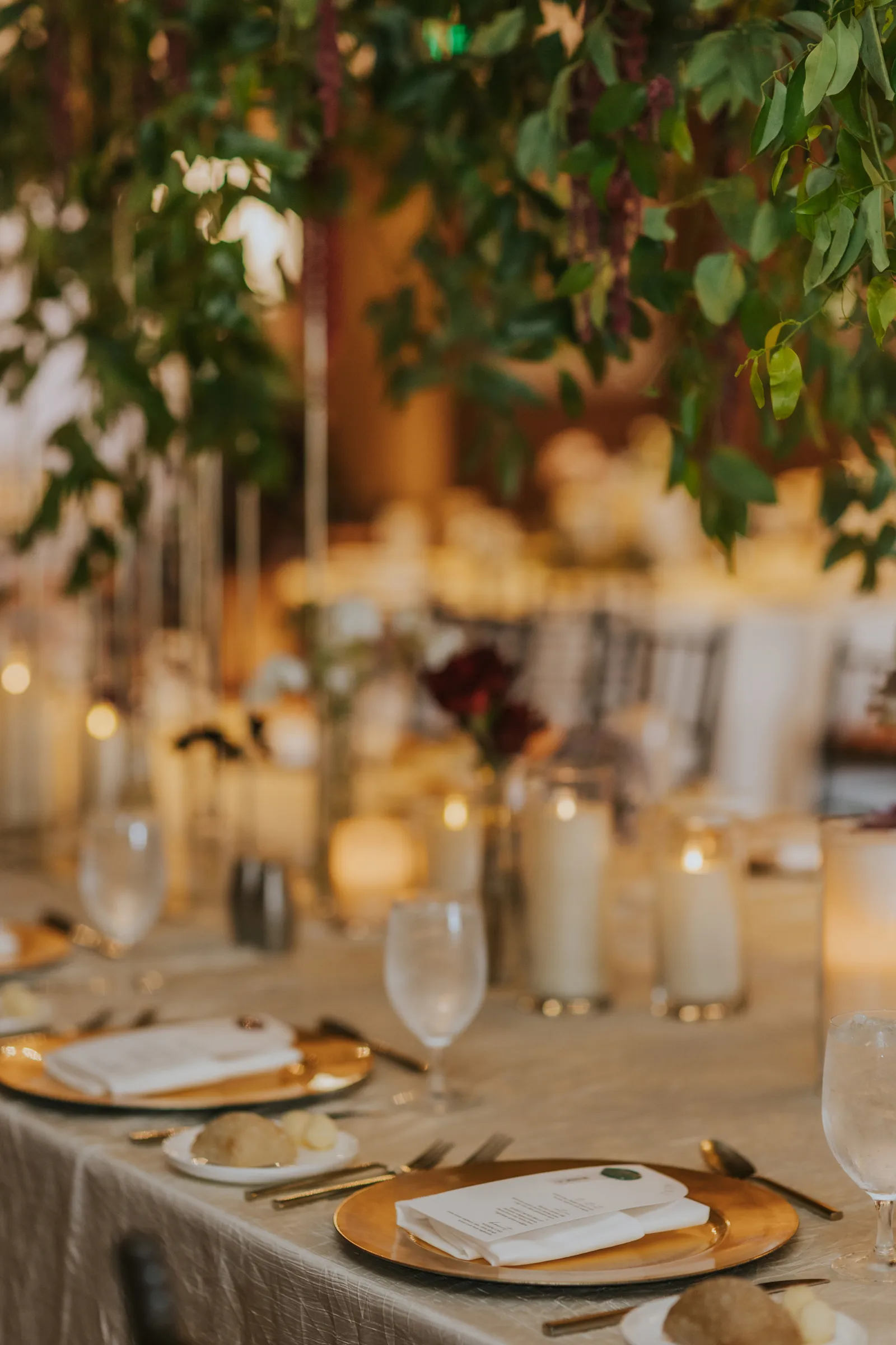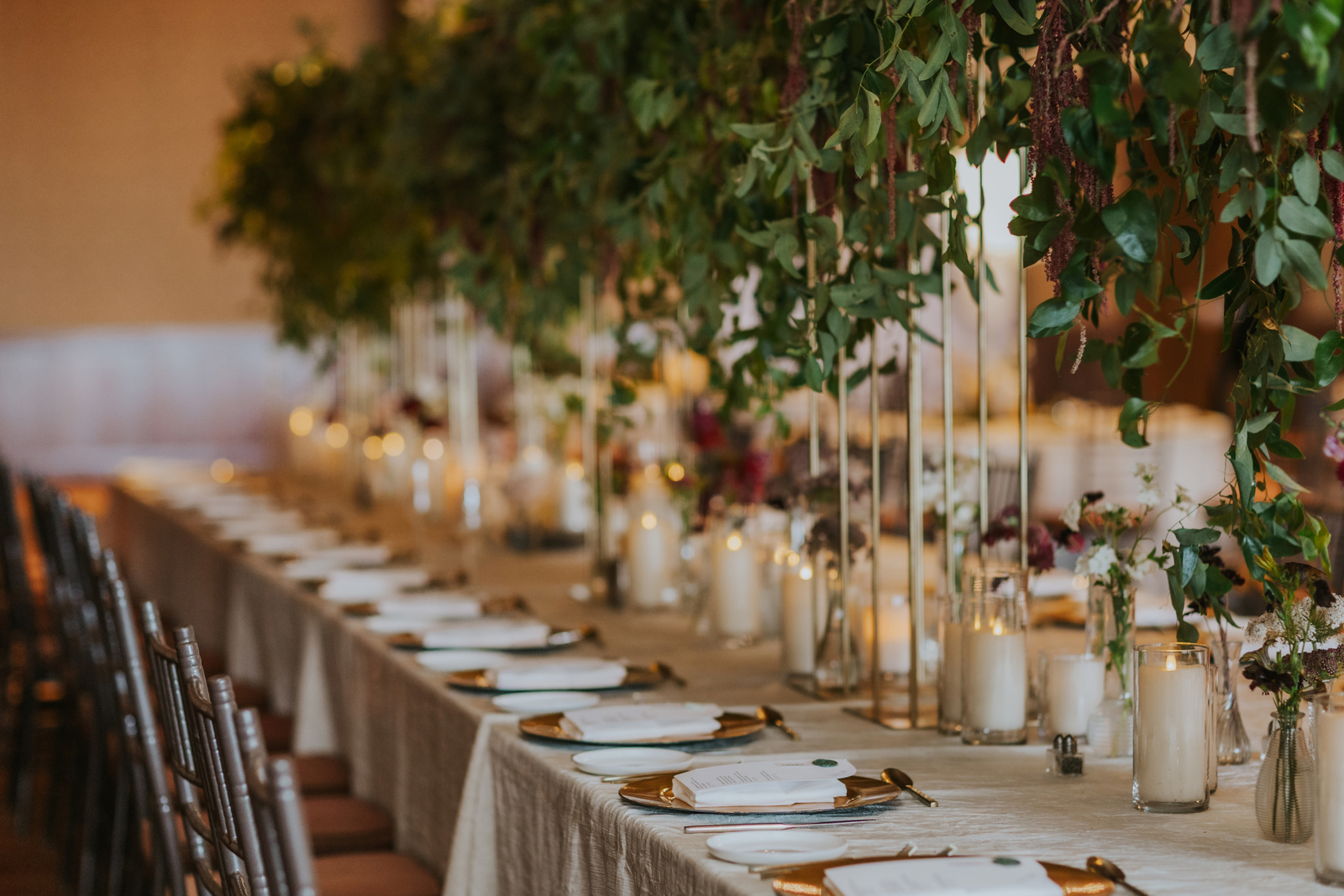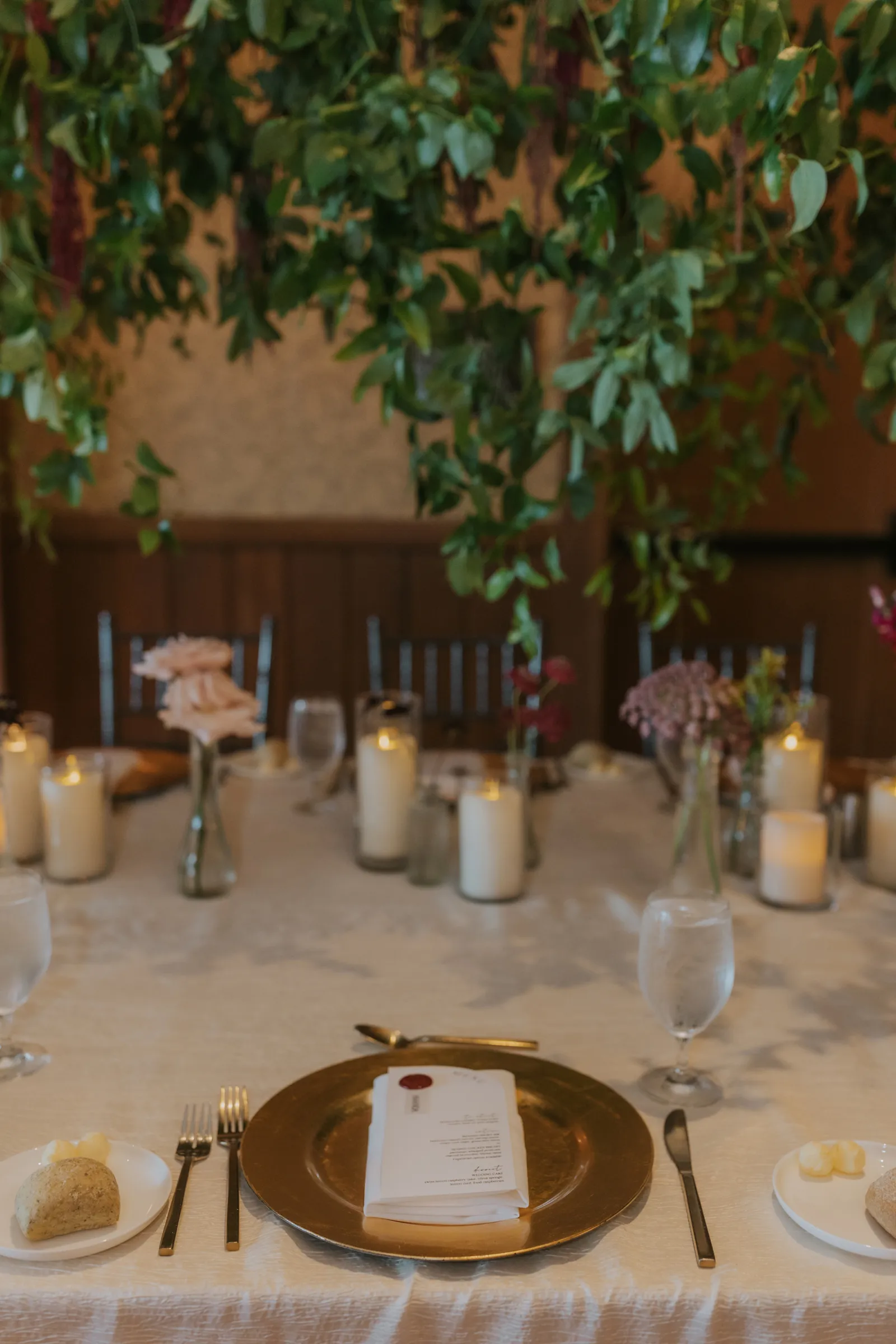 The florals. Other than the photos, they were the most important part of the day. I was going for a moody forest vibe and wanted to feel like we brought the outside into the ballroom. We chose really dark reds and burgundy contrasted with soft whites. The deep reds went so well with the green bridesmaids’ dresses and Jake’s green suit. The arch had some of the biggest dahlias I had ever seen and our floral designer, Shelayne, even added some fresh jasmine into my bouquet—it smelled so good! I can’t even put into words how much we loved our head table. It was more beautiful than I could have ever imagined. Working with