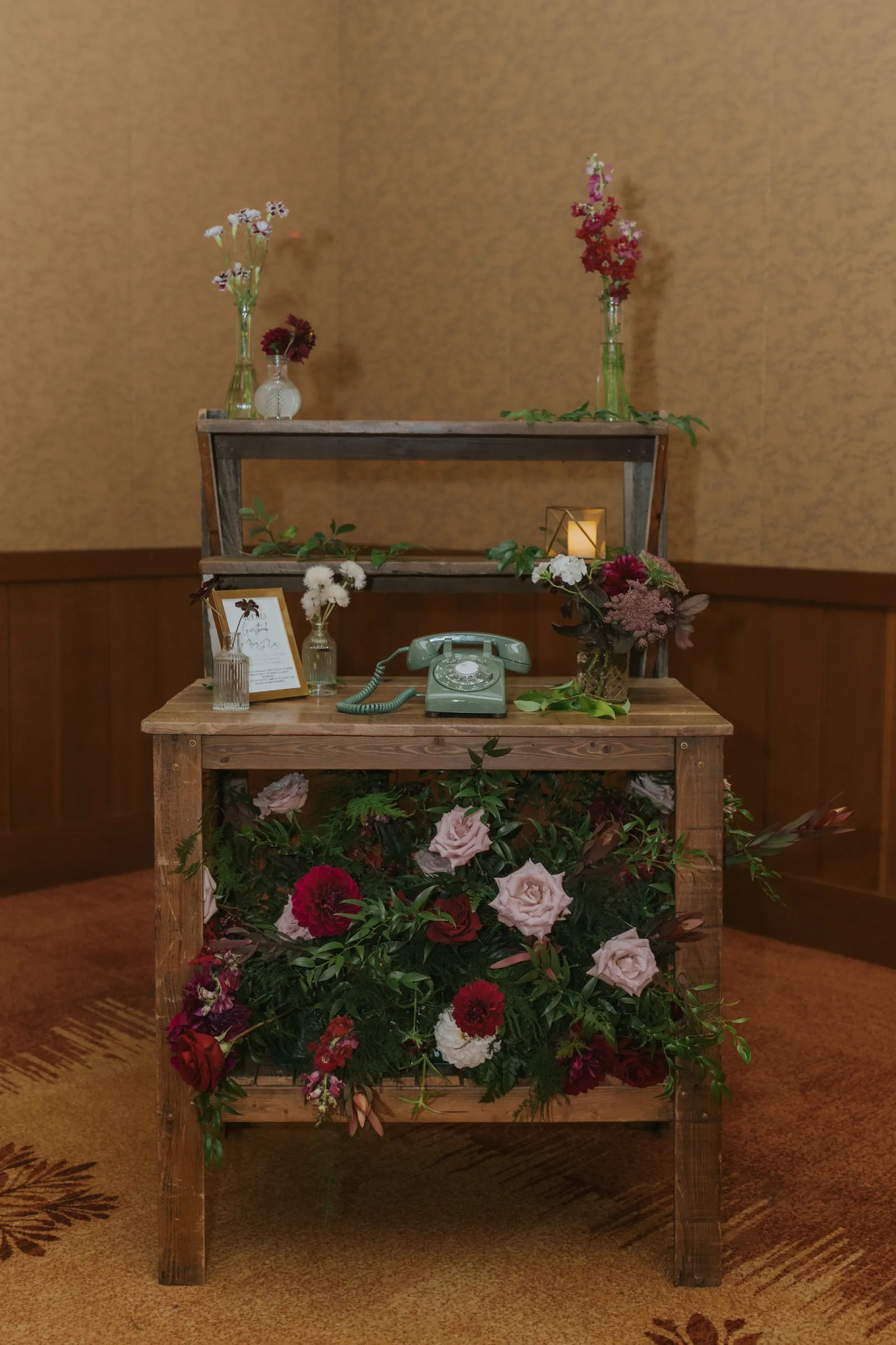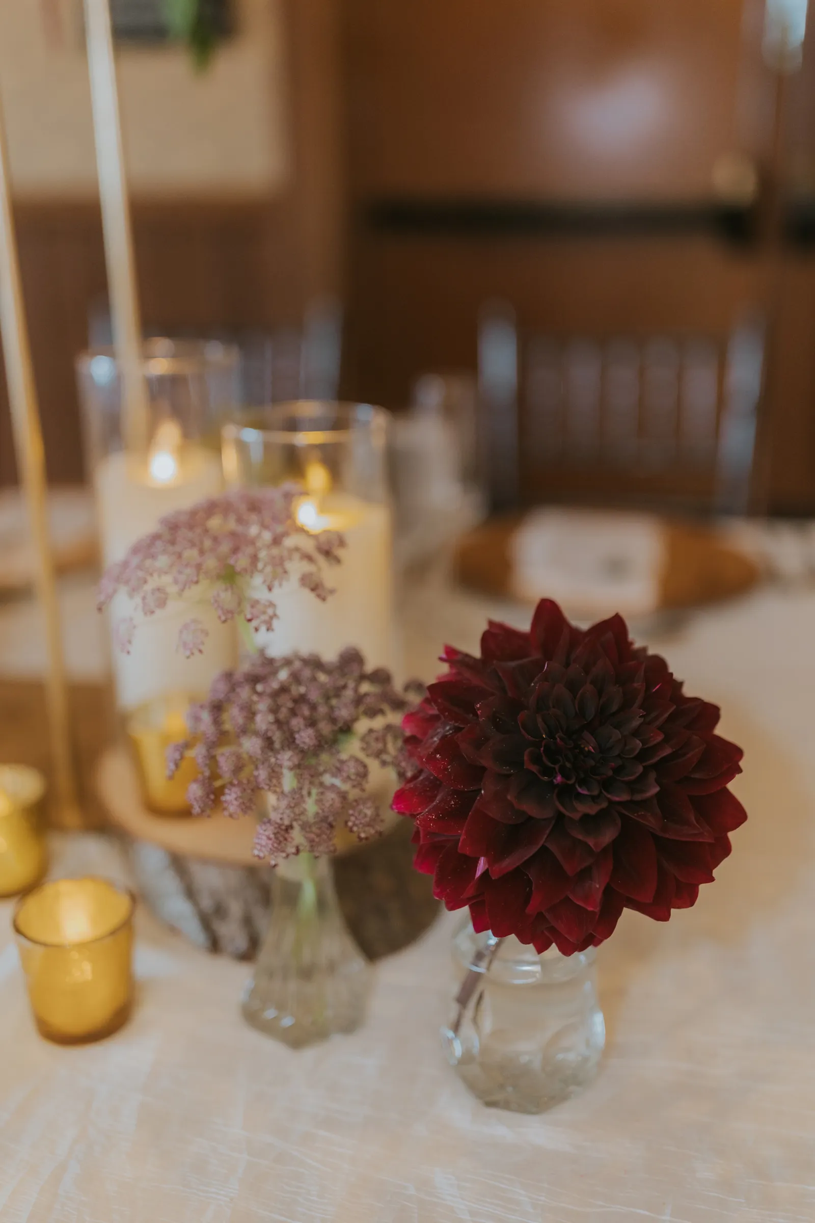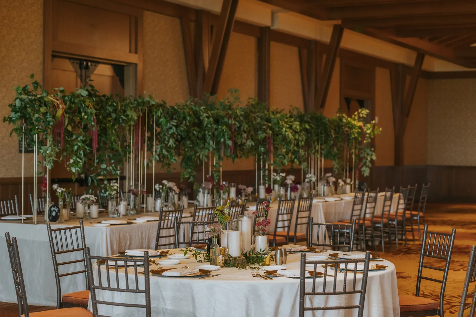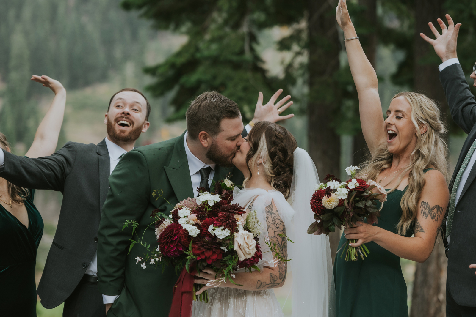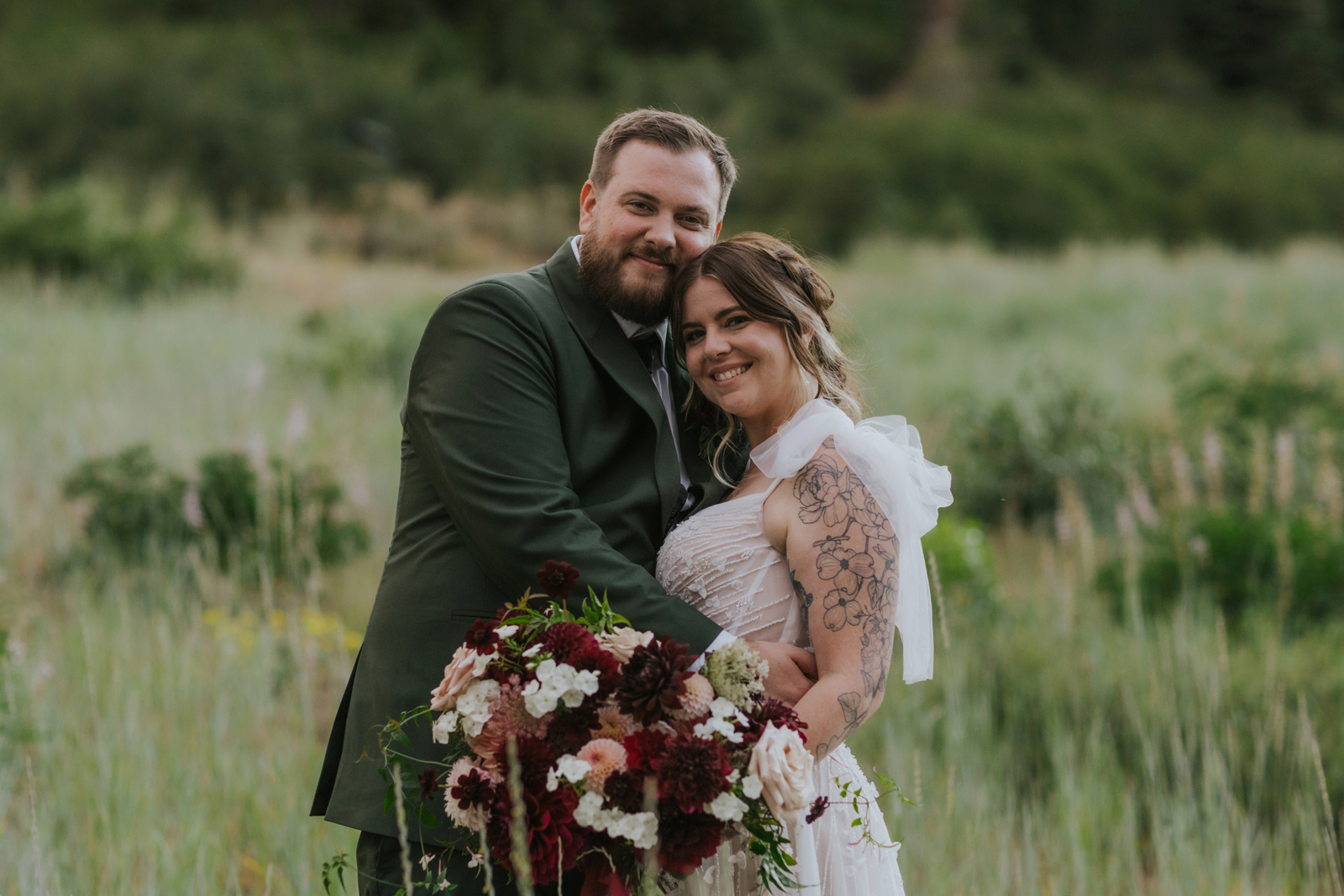 The florals. Other than the photos, they were the most important part of the day. I was going for a moody forest vibe and wanted to feel like we brought the outside into the ballroom. We chose really dark reds and burgundy contrasted with soft whites. The deep reds went so well with the green bridesmaids’ dresses and Jake’s green suit. The arch had some of the biggest dahlias I had ever seen and our floral designer, Shelayne, even added some fresh jasmine into my bouquet—it smelled so good! I can’t even put into words how much we loved our head table. It was more beautiful than I could have ever imagined. Working with