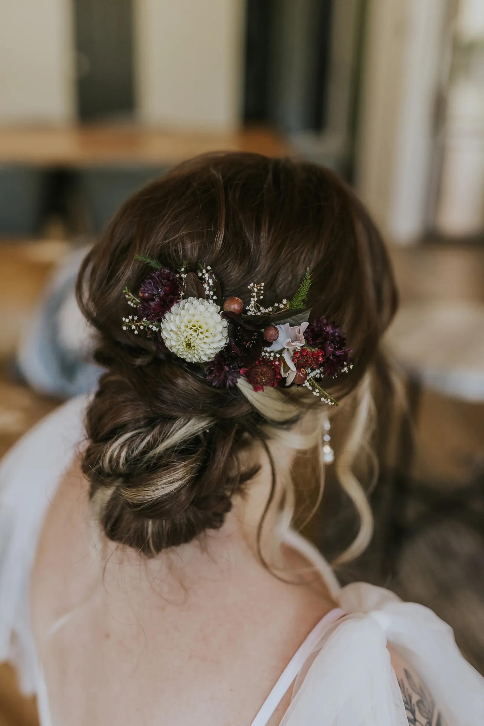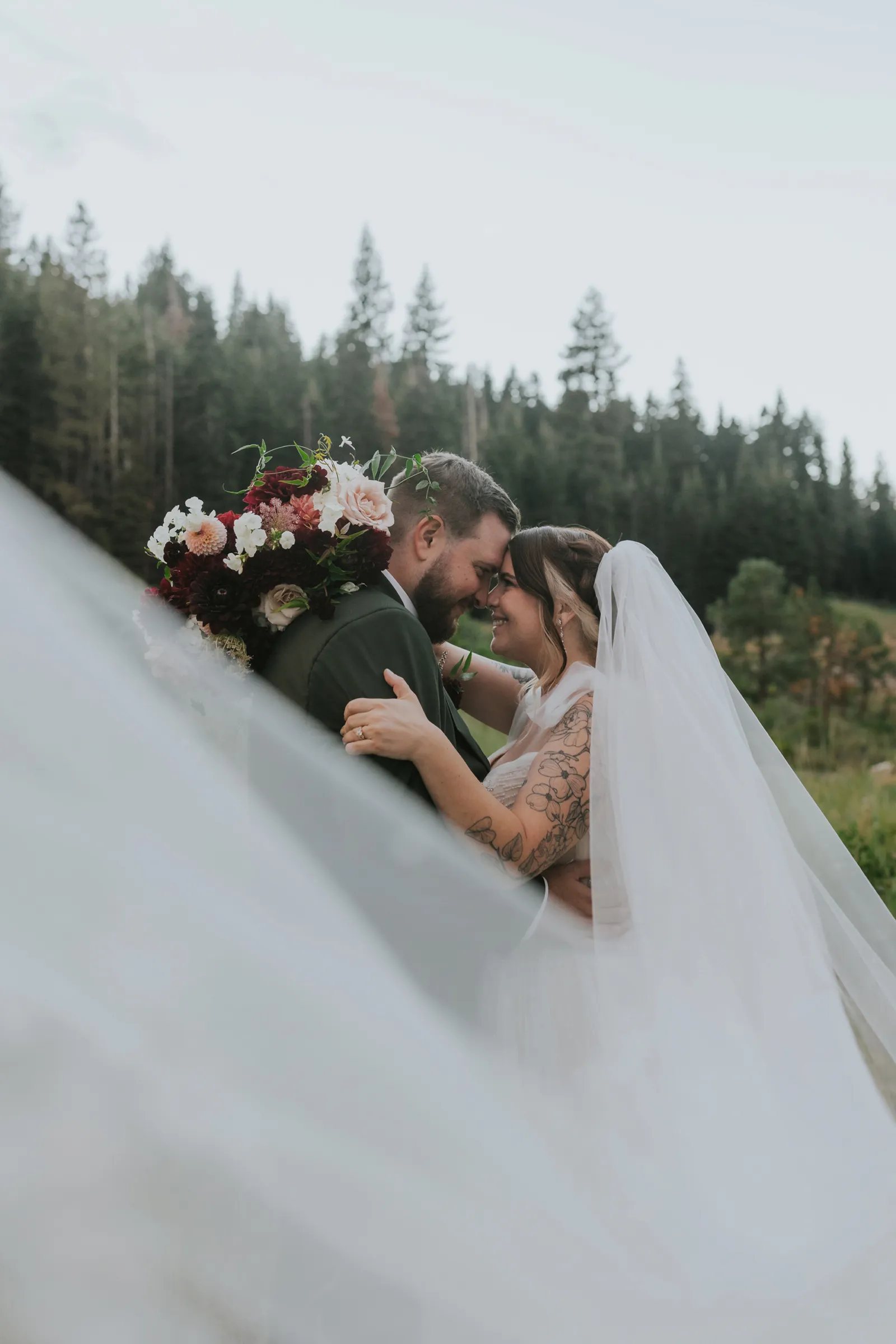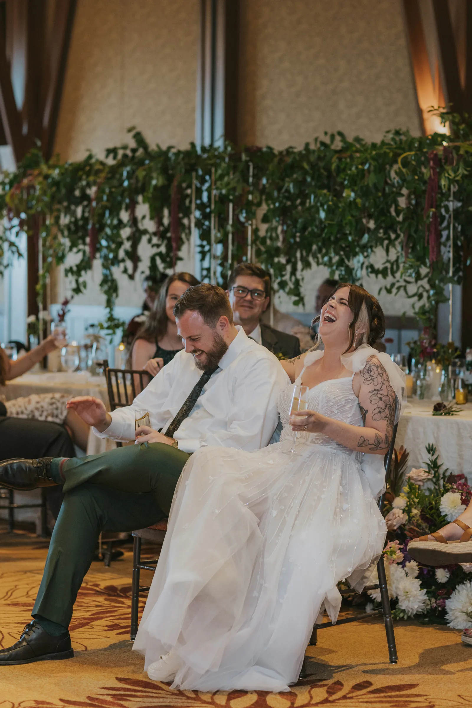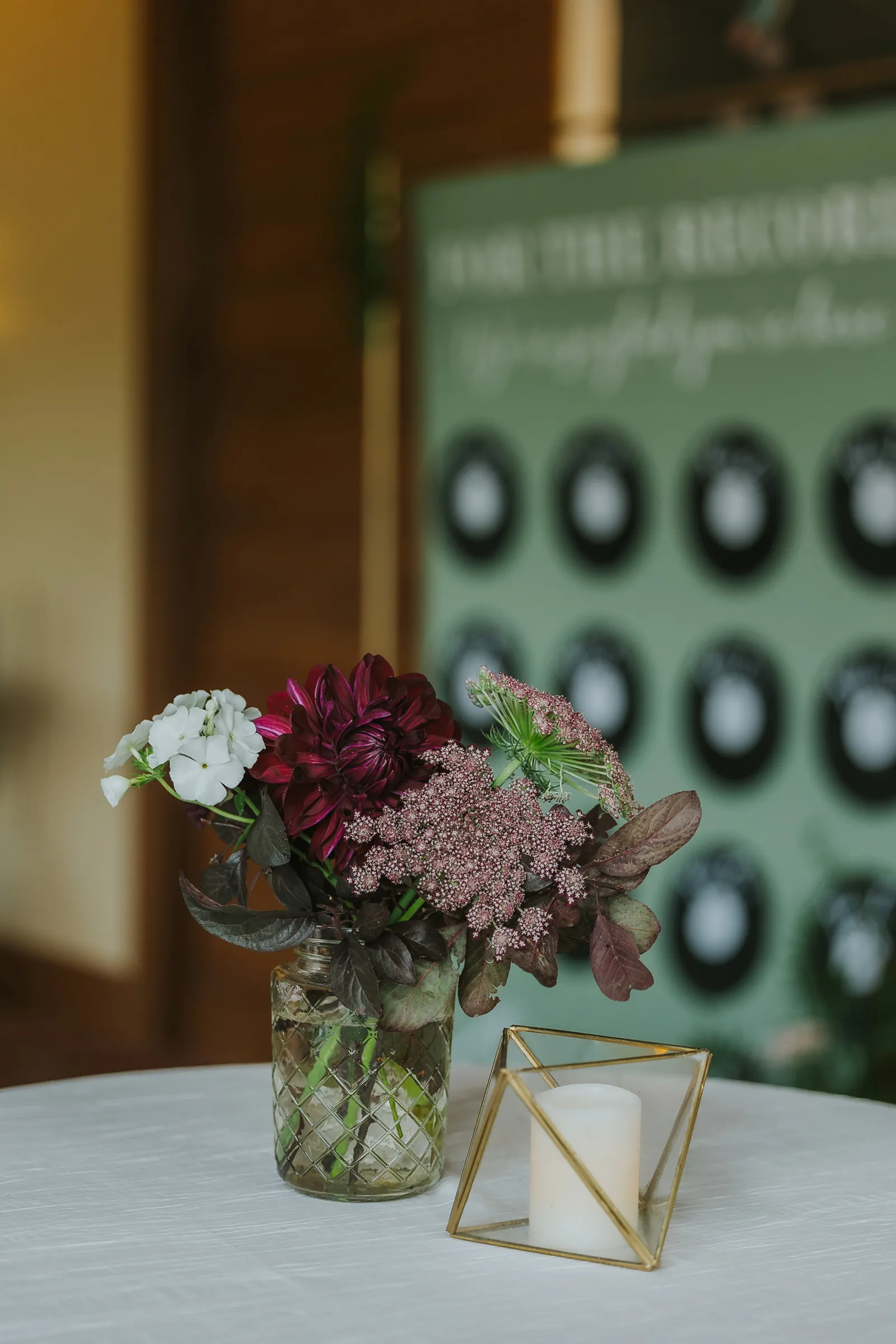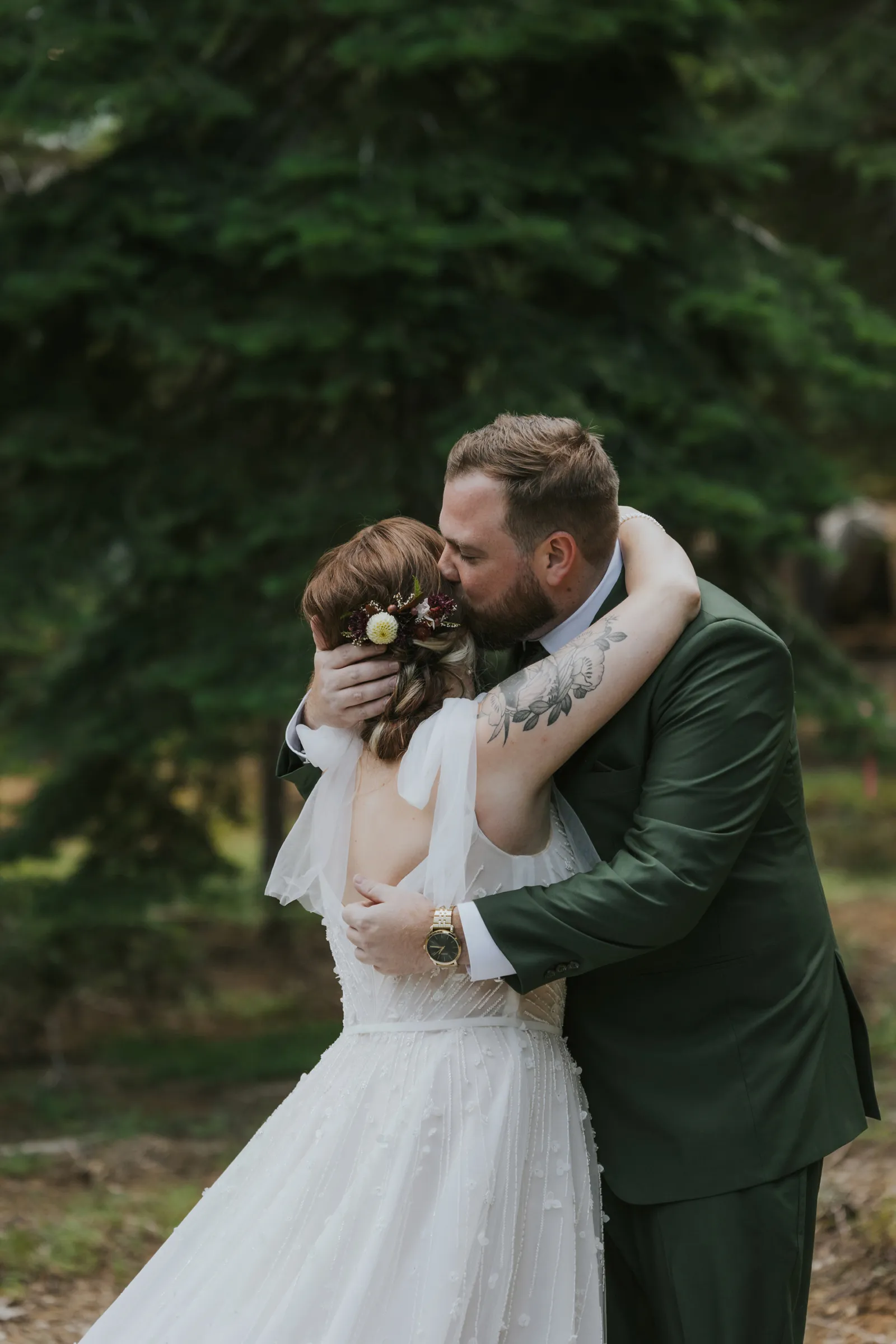 The florals. Other than the photos, they were the most important part of the day. I was going for a moody forest vibe and wanted to feel like we brought the outside into the ballroom. We chose really dark reds and burgundy contrasted with soft whites. The deep reds went so well with the green bridesmaids’ dresses and Jake’s green suit. The arch had some of the biggest dahlias I had ever seen and our floral designer, Shelayne, even added some fresh jasmine into my bouquet—it smelled so good! I can’t even put into words how much we loved our head table. It was more beautiful than I could have ever imagined. Working with