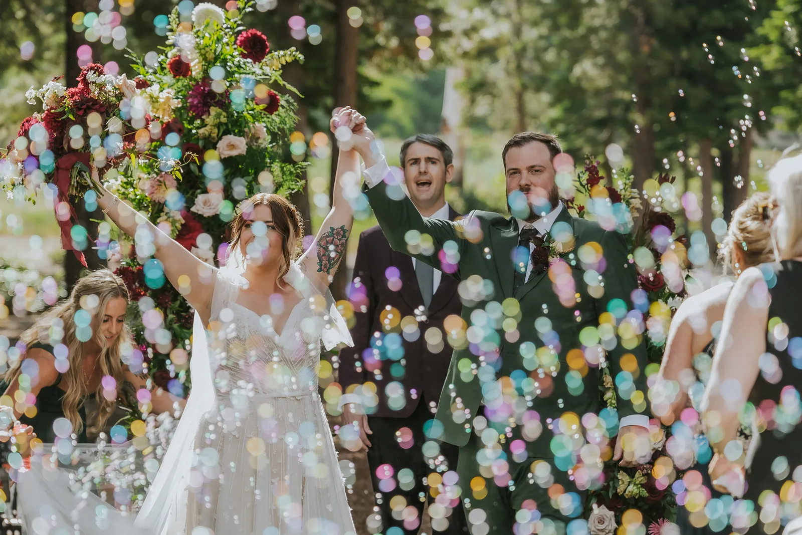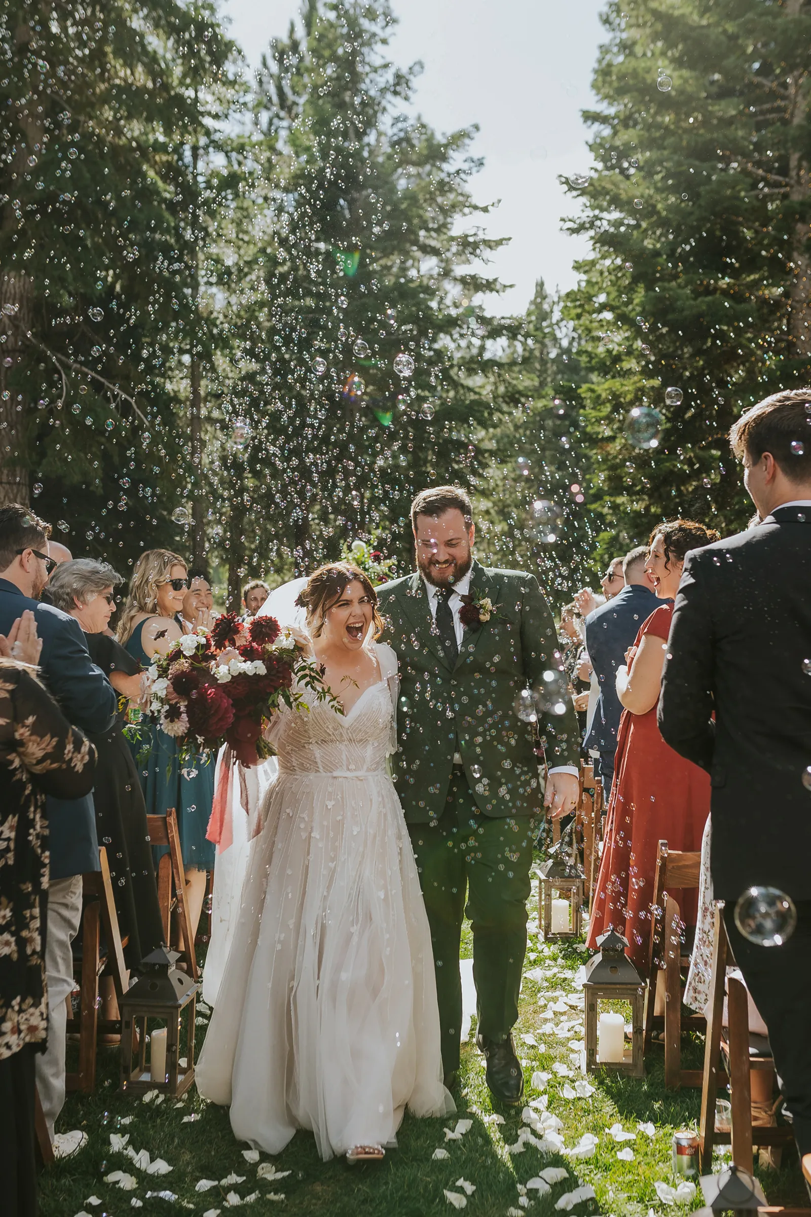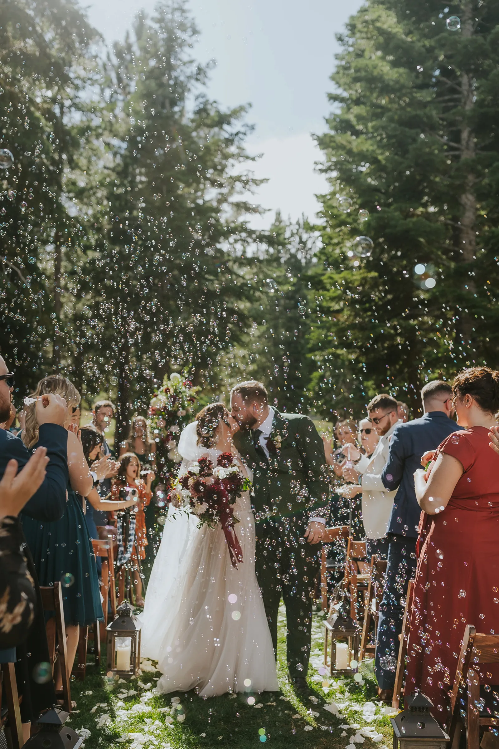 Our ceremony was the perfect mix of silly, sweet and intentional. The woods is such a gorgeous area to have a ceremony and we really just wanted the space to shine! We kept the aisle decor pretty minimal and opted for an illusion arch instead of a regular one. We had our best friend and old roommate, Brad, officiate the ceremony which was so special for Jake and I. He had the crowd laughing and in tears at the same time. Our guests thought he was an actual pastor! We ended up saying our vows privately during our first look but said generic ones during the ceremony. I even ended up placing Jake’s ring on his right hand because I was so nervous up there! Instead of a flower girl, we had one of our best friends walk down with beers and hard seltzers and hand them out to guests! This was a hit and we suggest everyone do this if it fits your style and vibe. We included our dog in the ceremony (Twist Florals even made her a dog collar) and she stole the show. Since we were unable to do a sparkler send off at the end of the night, I really wanted to do something fun for our ceremony, so we did a bubble exit! We placed bubbles on our guests seats and had two bubble machines as well. At the end of our ceremony we had everyone blow bubbles as we walked back down the aisle and it turned out to be one of our favorite parts of the day.