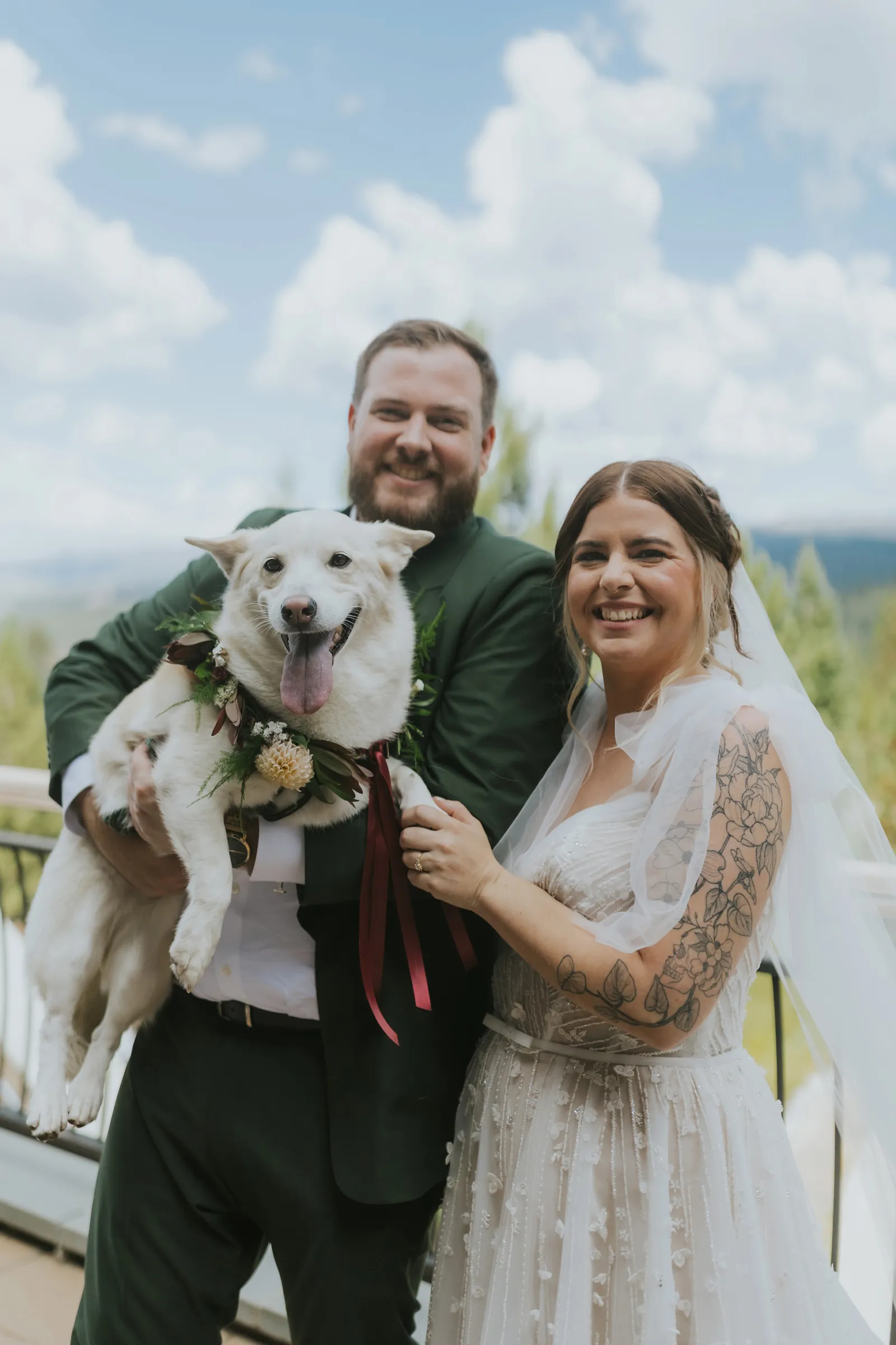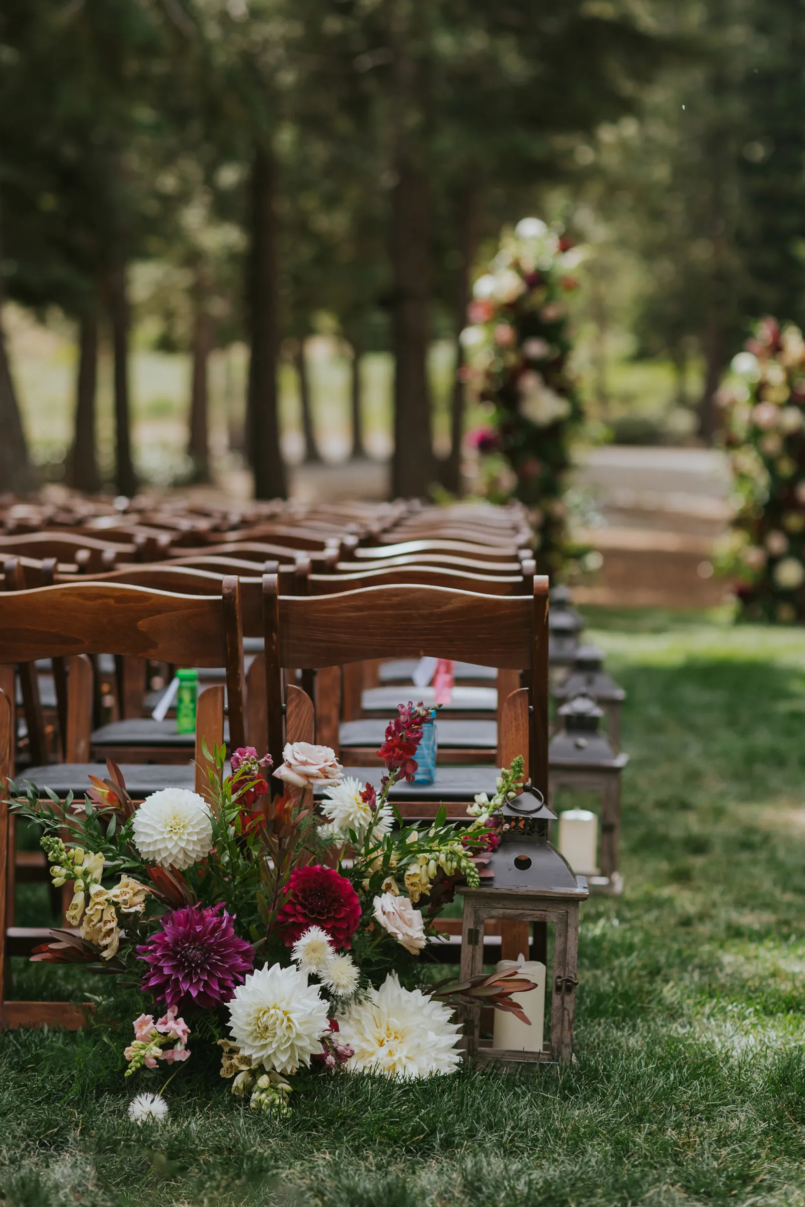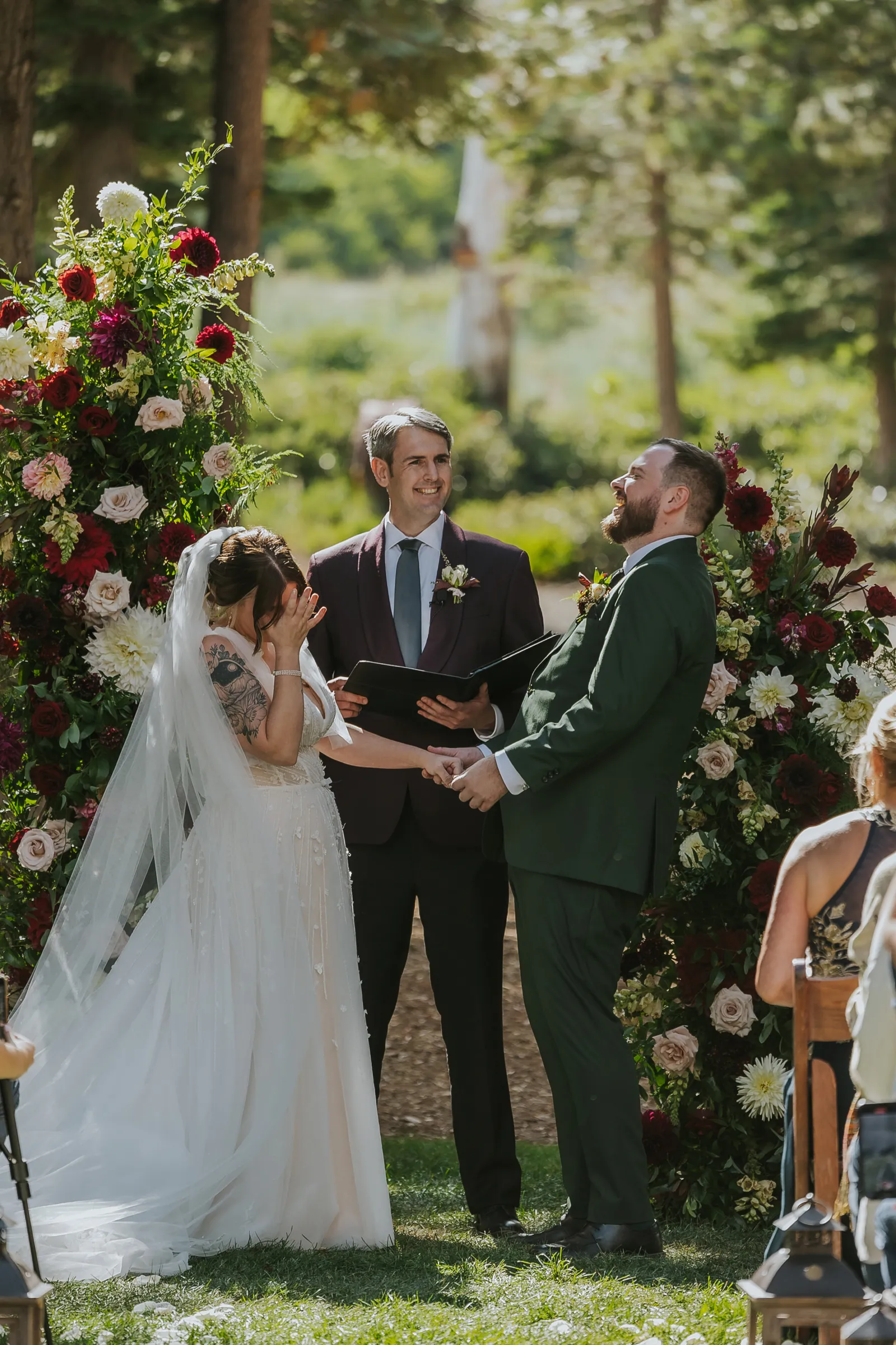 Our ceremony was the perfect mix of silly, sweet and intentional. The woods is such a gorgeous area to have a ceremony and we really just wanted the space to shine! We kept the aisle decor pretty minimal and opted for an illusion arch instead of a regular one. We had our best friend and old roommate, Brad, officiate the ceremony which was so special for Jake and I. He had the crowd laughing and in tears at the same time. Our guests thought he was an actual pastor! We ended up saying our vows privately during our first look but said generic ones during the ceremony. I even ended up placing Jake’s ring on his right hand because I was so nervous up there! Instead of a flower girl, we had one of our best friends walk down with beers and hard seltzers and hand them out to guests! This was a hit and we suggest everyone do this if it fits your style and vibe. We included our dog in the ceremony (Twist Florals even made her a dog collar) and she stole the show. Since we were unable to do a sparkler send off at the end of the night, I really wanted to do something fun for our ceremony, so we did a bubble exit! We placed bubbles on our guests seats and had two bubble machines as well. At the end of our ceremony we had everyone blow bubbles as we walked back down the aisle and it turned out to be one of our favorite parts of the day.