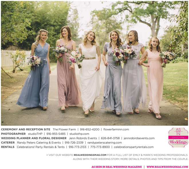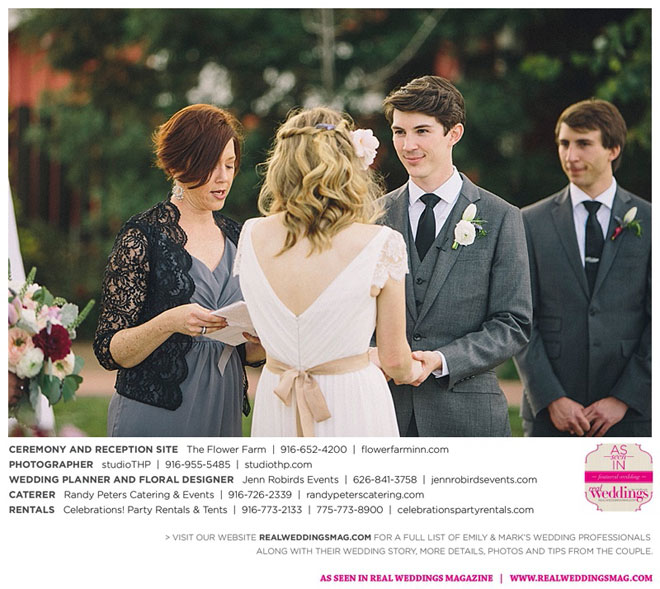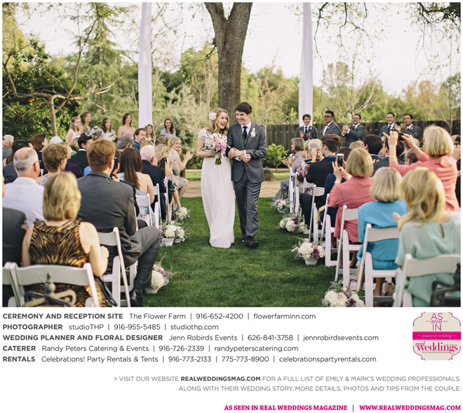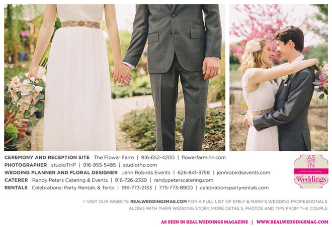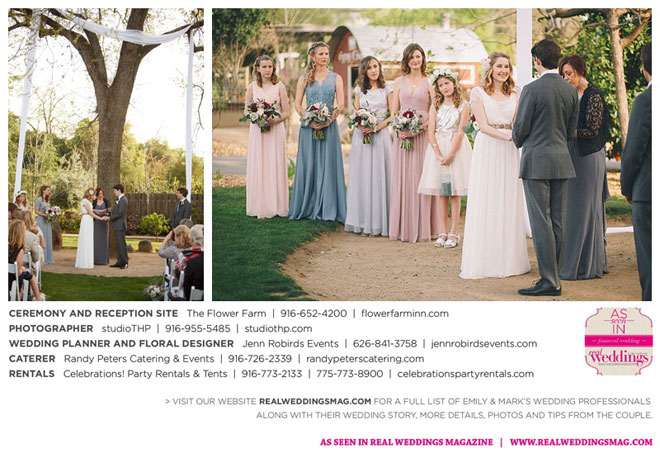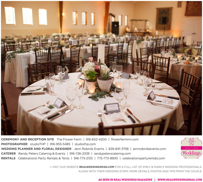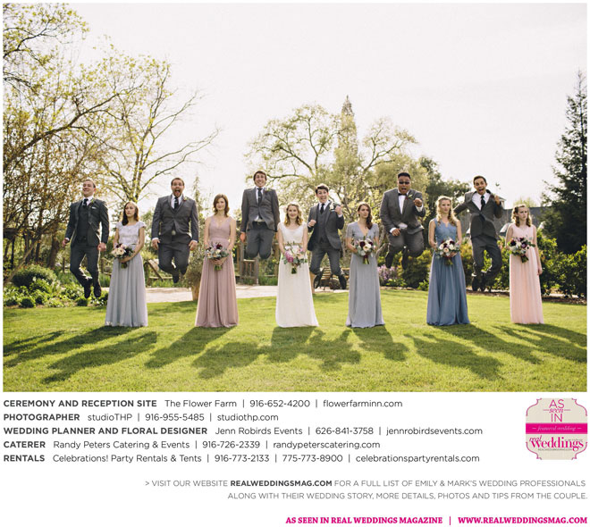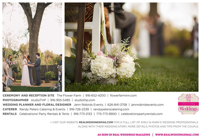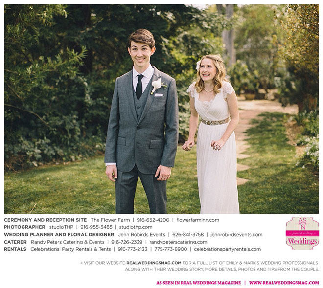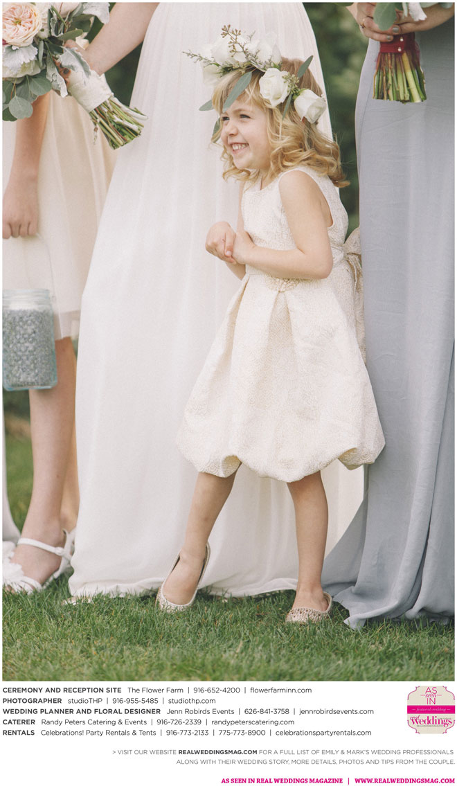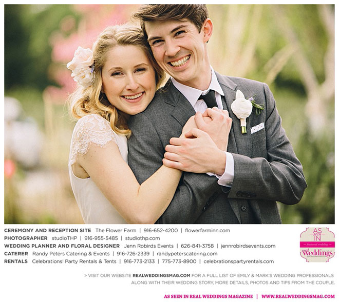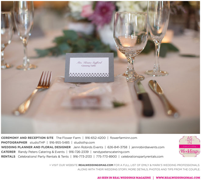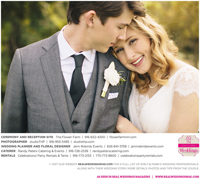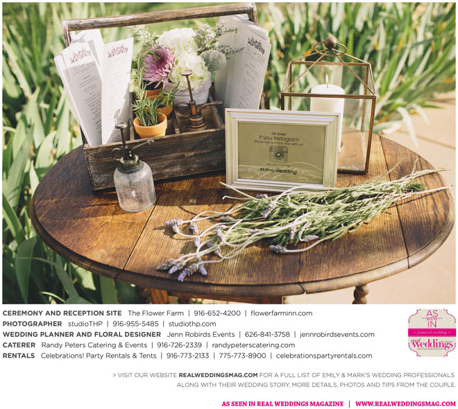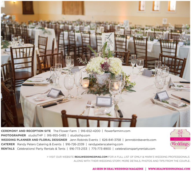 About 160 of the couple’s family and friends attended their ceremony and reception at The Flower Farm in Loomis. To bring in a personal touch, the nuptials incorporated family and close friends. “My dad presented a reading during the ceremony—I was so touched that he lent his voice—and our officiant was a personal friend of mine, whom I respect and love immensely. Her humor kept me laughing and her sageness made me cry,” Emily says.