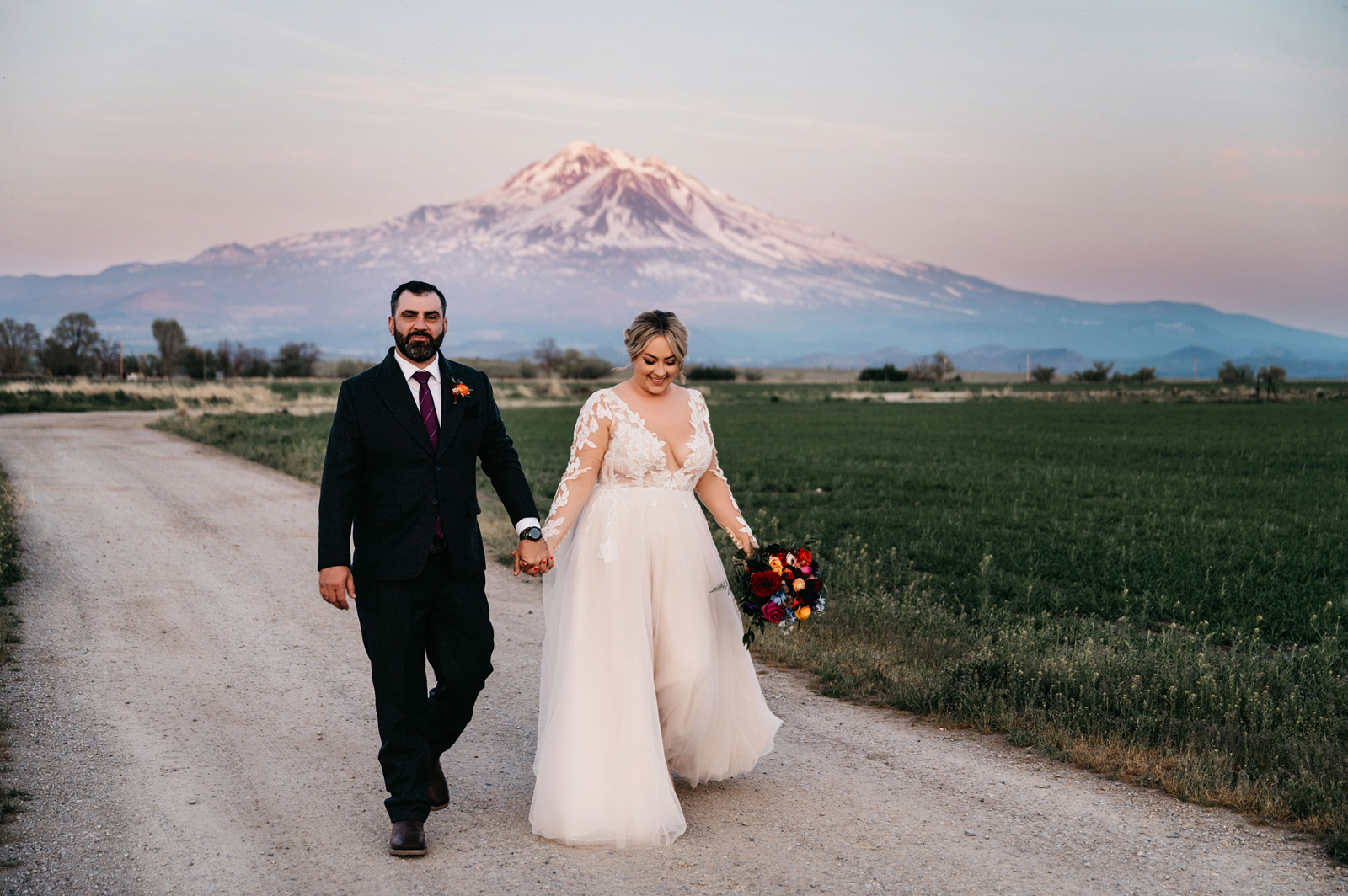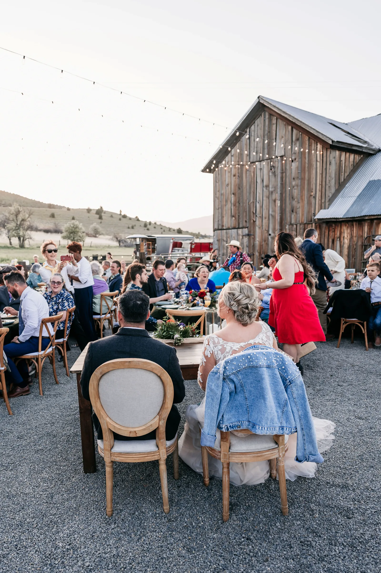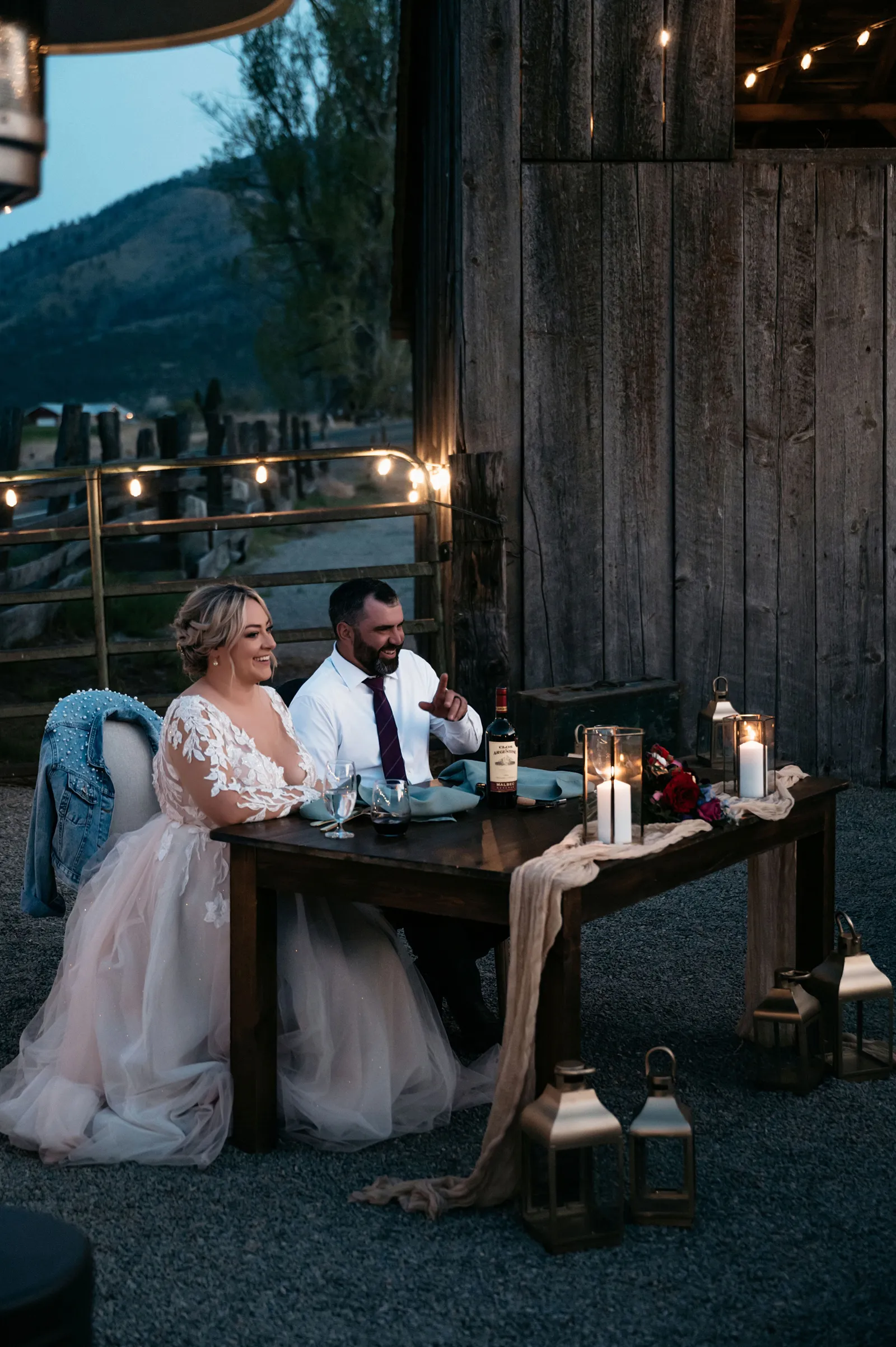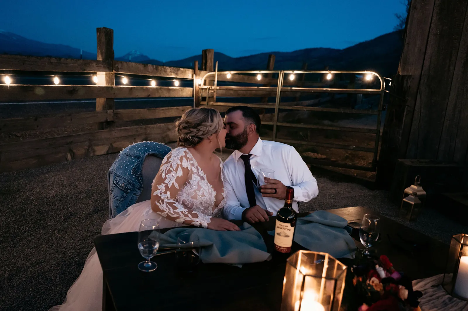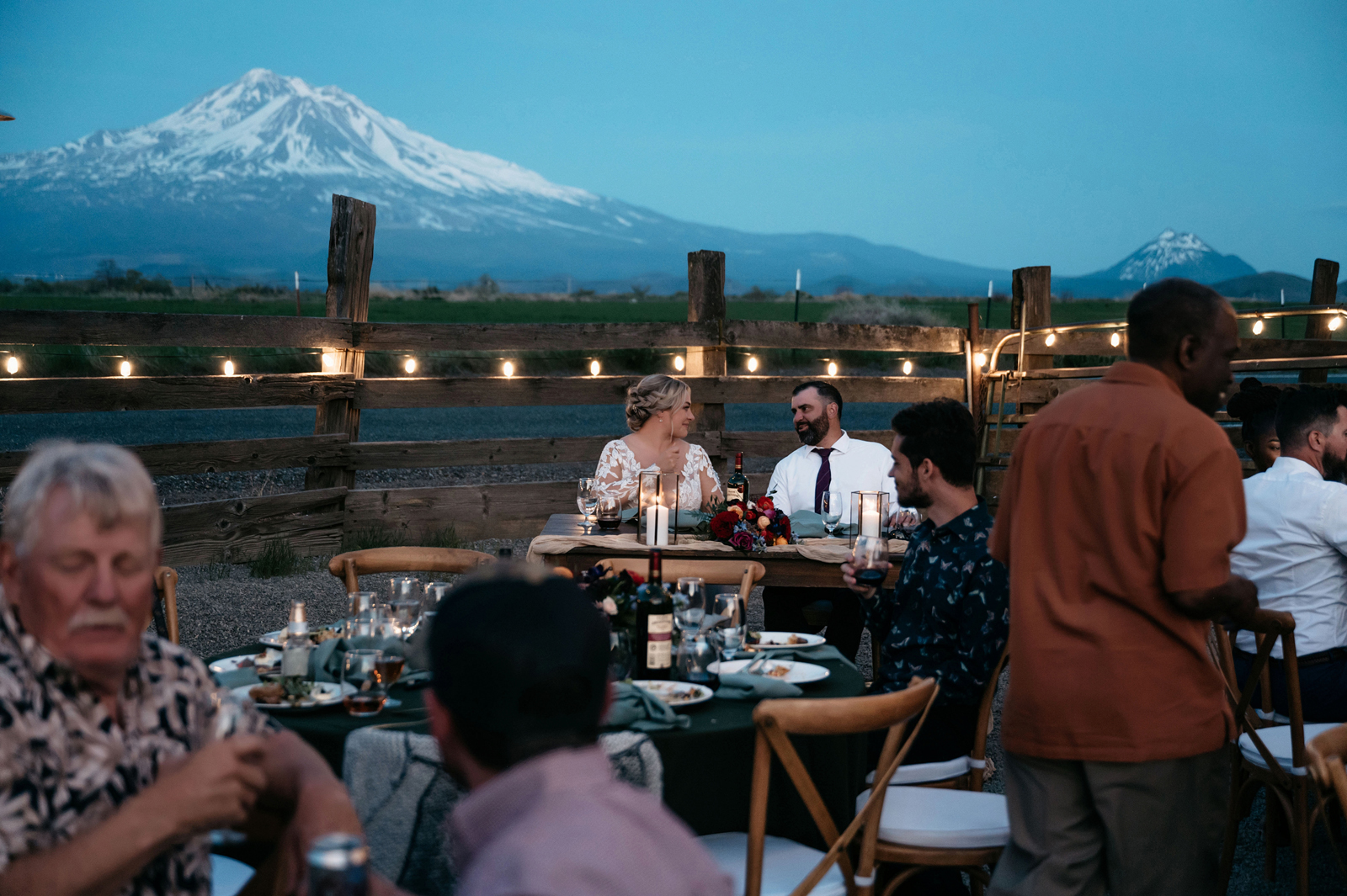 We really wanted everyone to feel immersed in the cozy, rustic setting with the scenic view of Mount Shasta. The entire day was planned around golden hour, and the sun setting casting a pink hue on Mount Shasta, leading into a candlelit, twinkle light-filled evening of dancing and dessert. We added 1,000 feet of string lights inside the barn and outside in the reception space, and it all went off without a hitch!