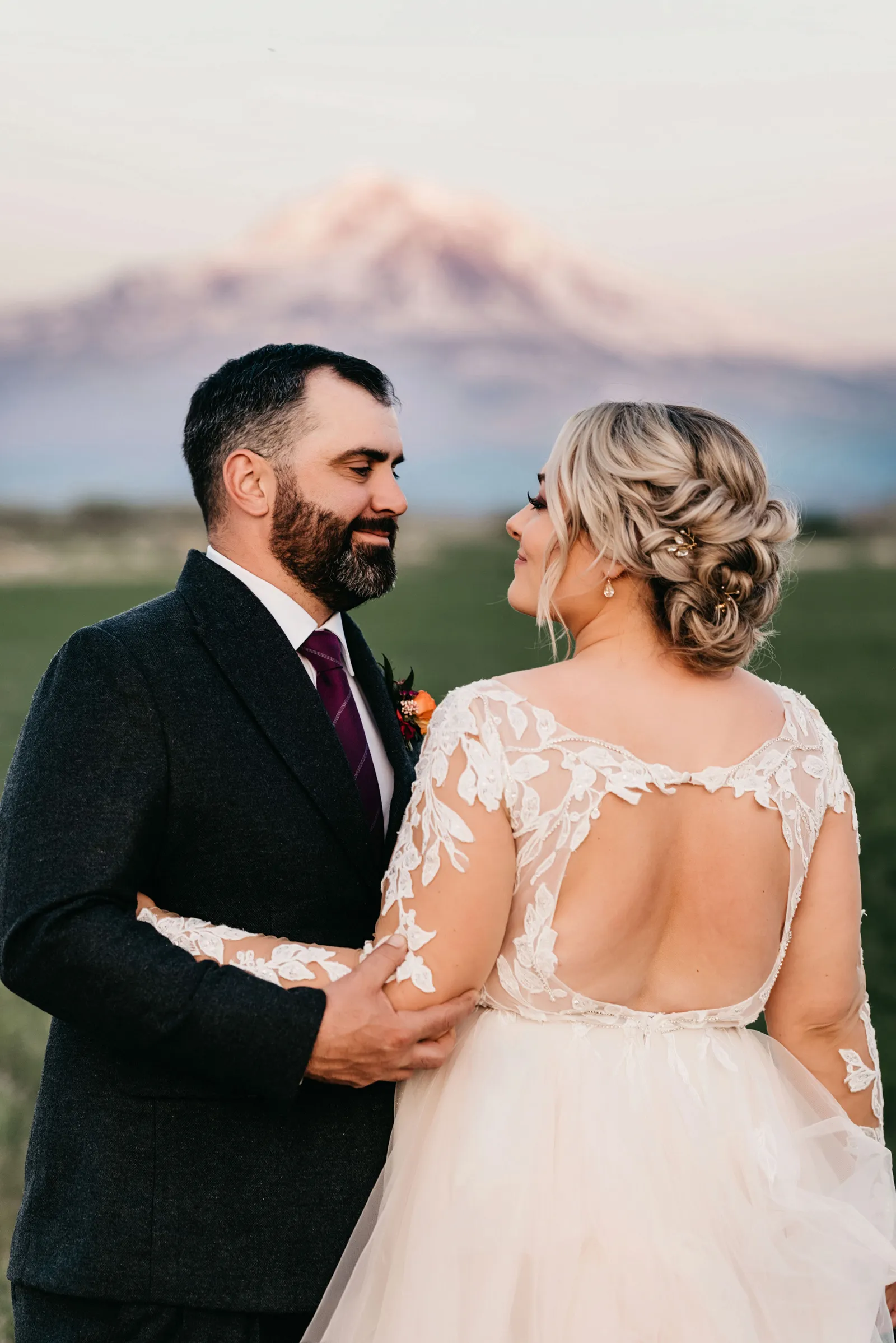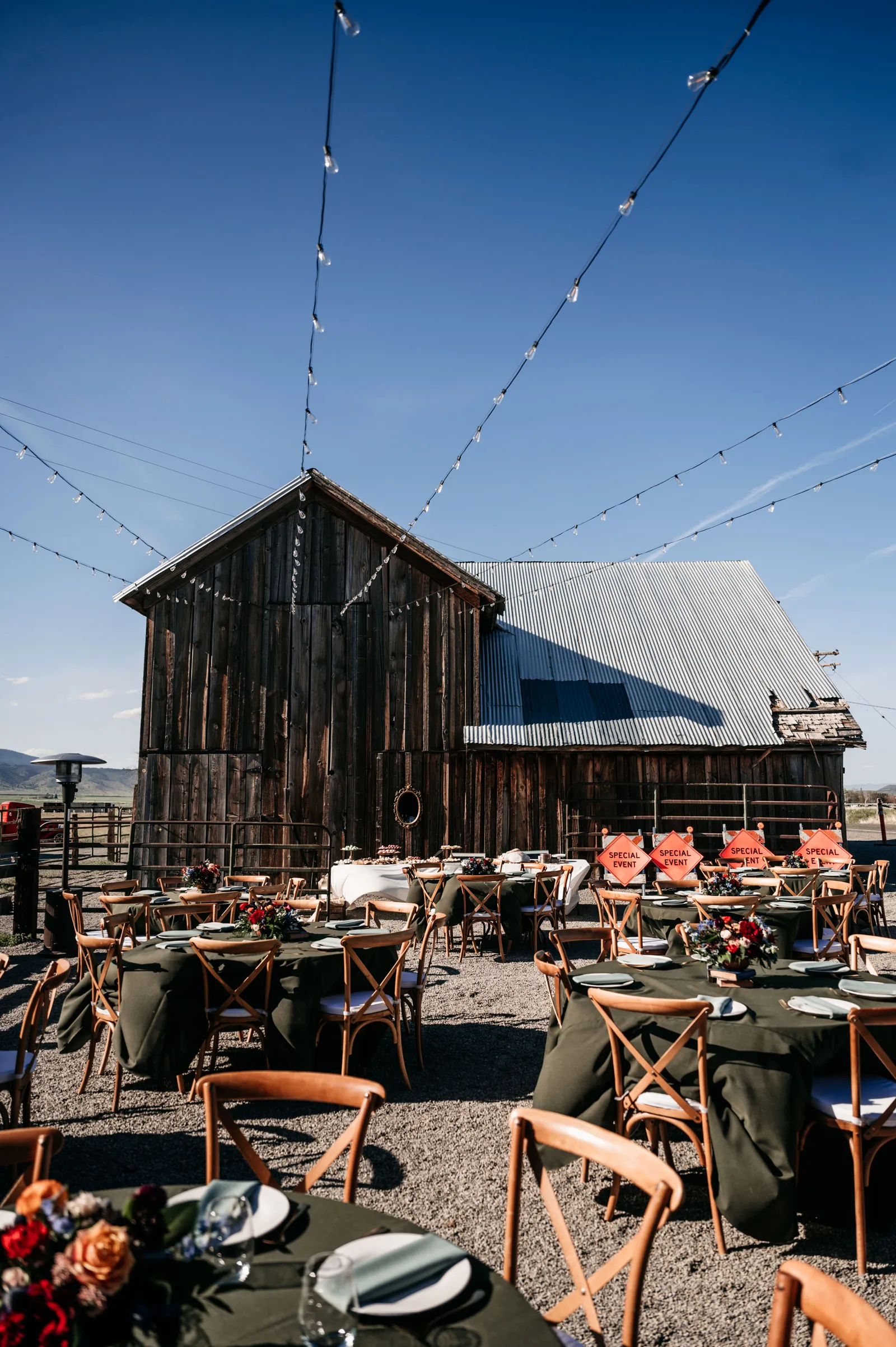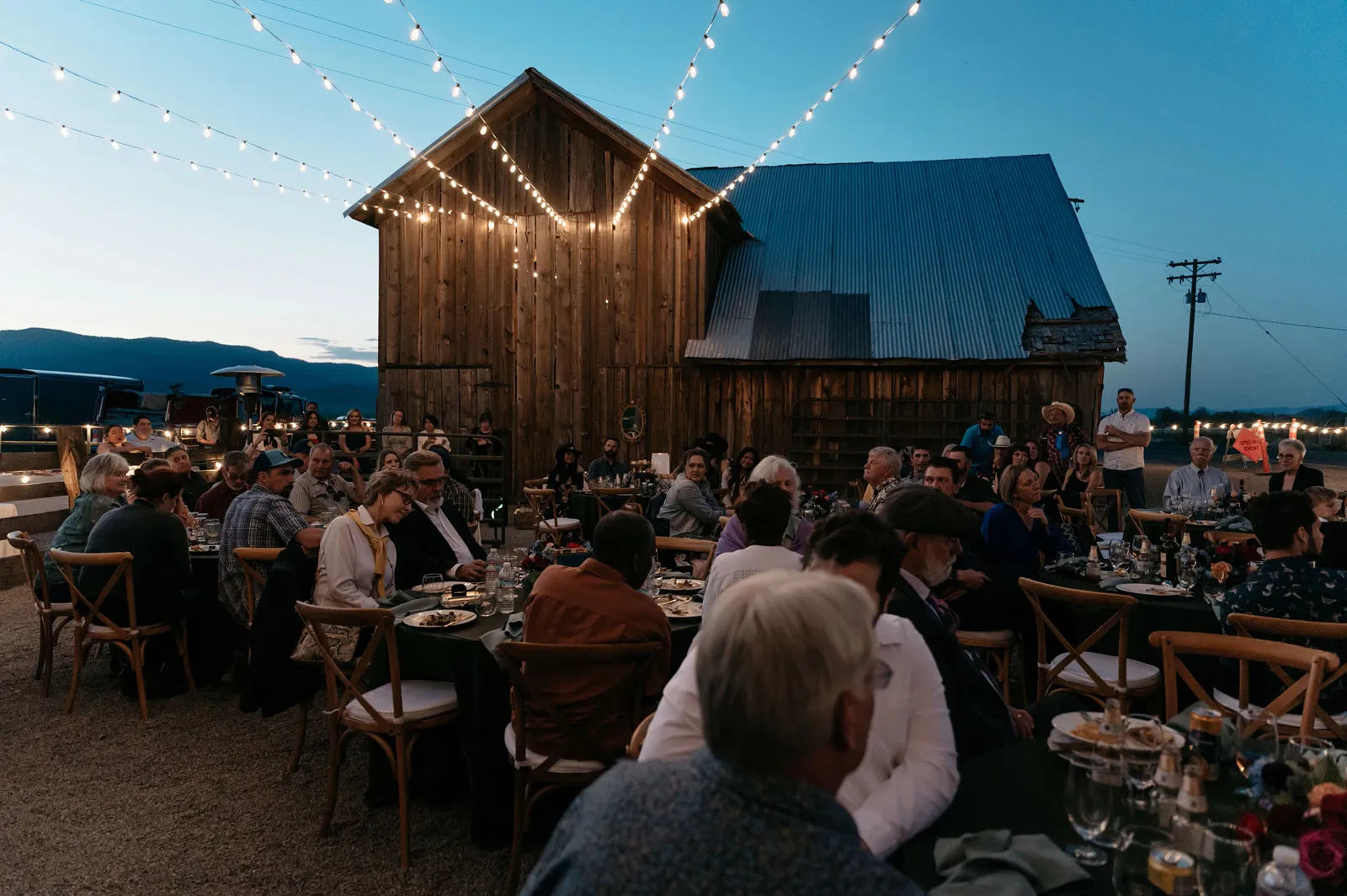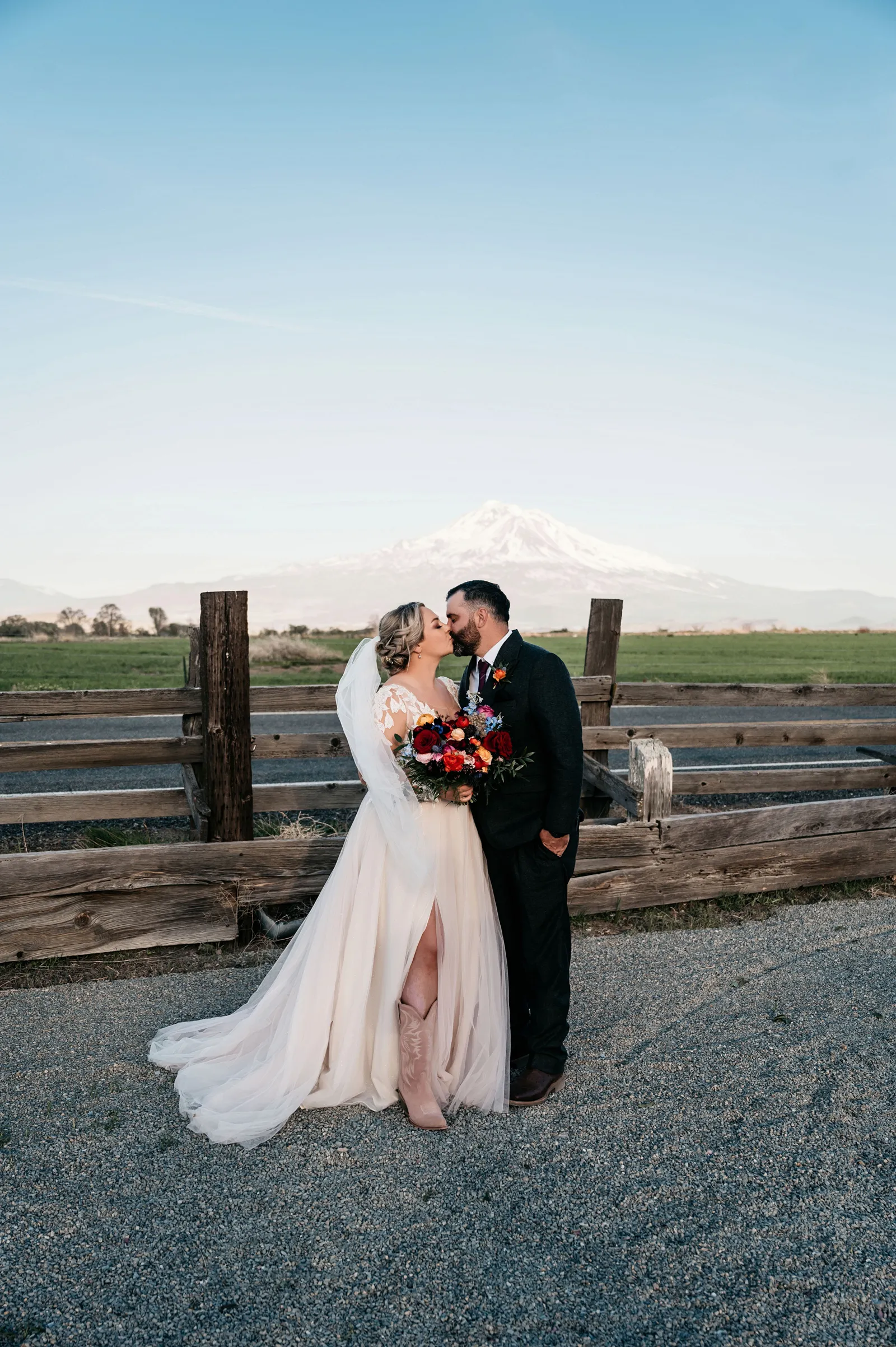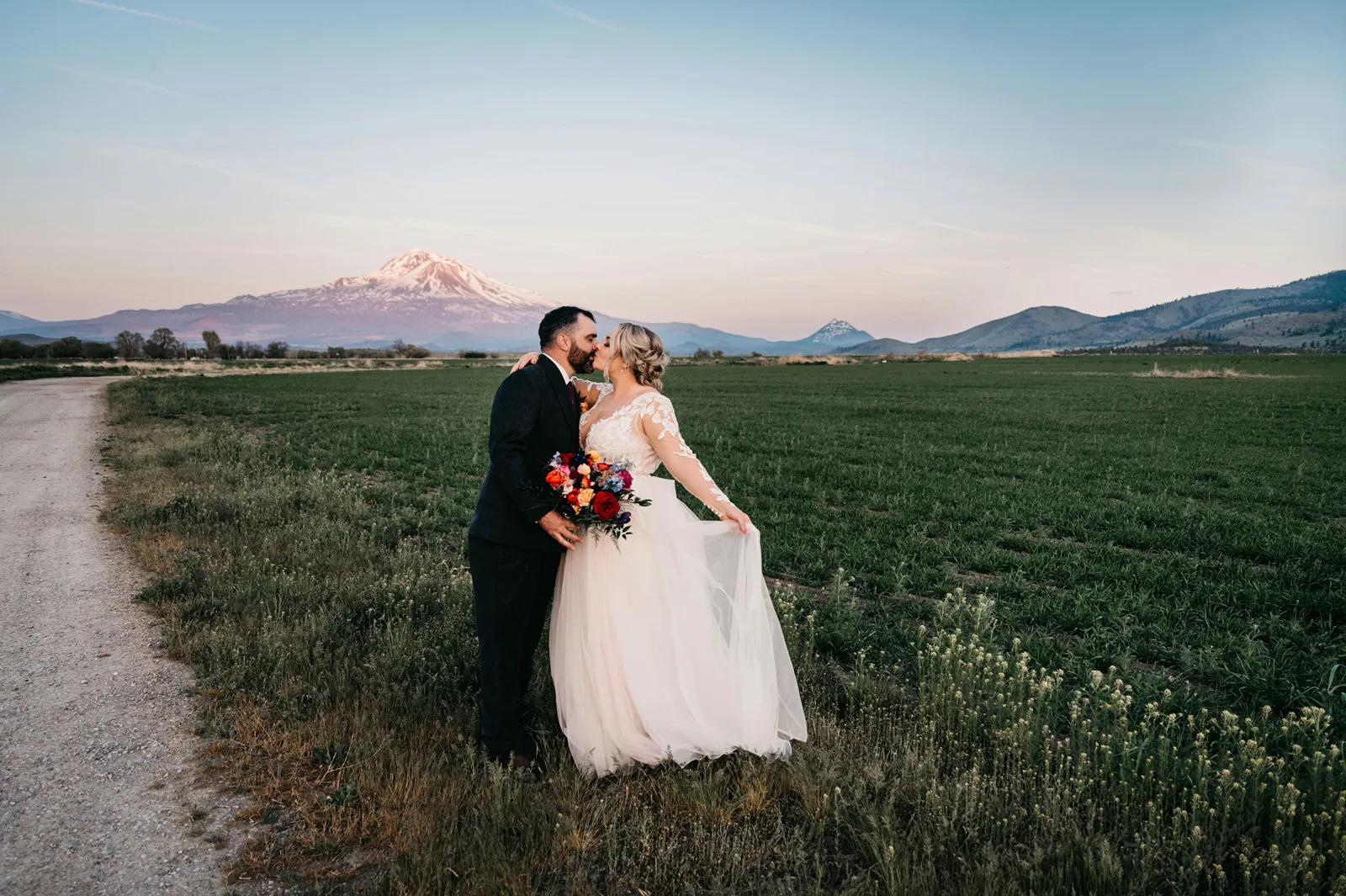 We really wanted everyone to feel immersed in the cozy, rustic setting with the scenic view of Mount Shasta. The entire day was planned around golden hour, and the sun setting casting a pink hue on Mount Shasta, leading into a candlelit, twinkle light-filled evening of dancing and dessert. We added 1,000 feet of string lights inside the barn and outside in the reception space, and it all went off without a hitch!