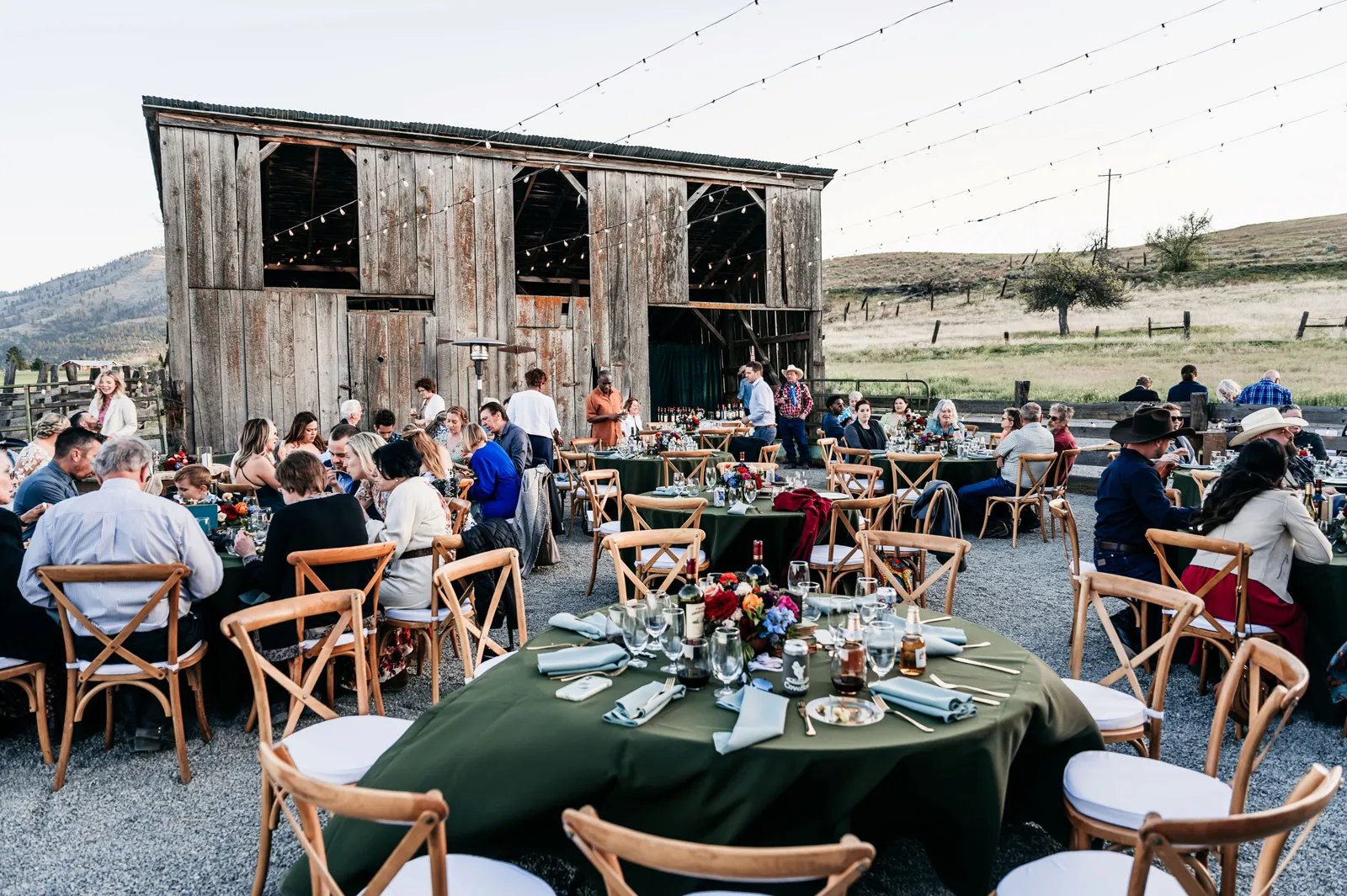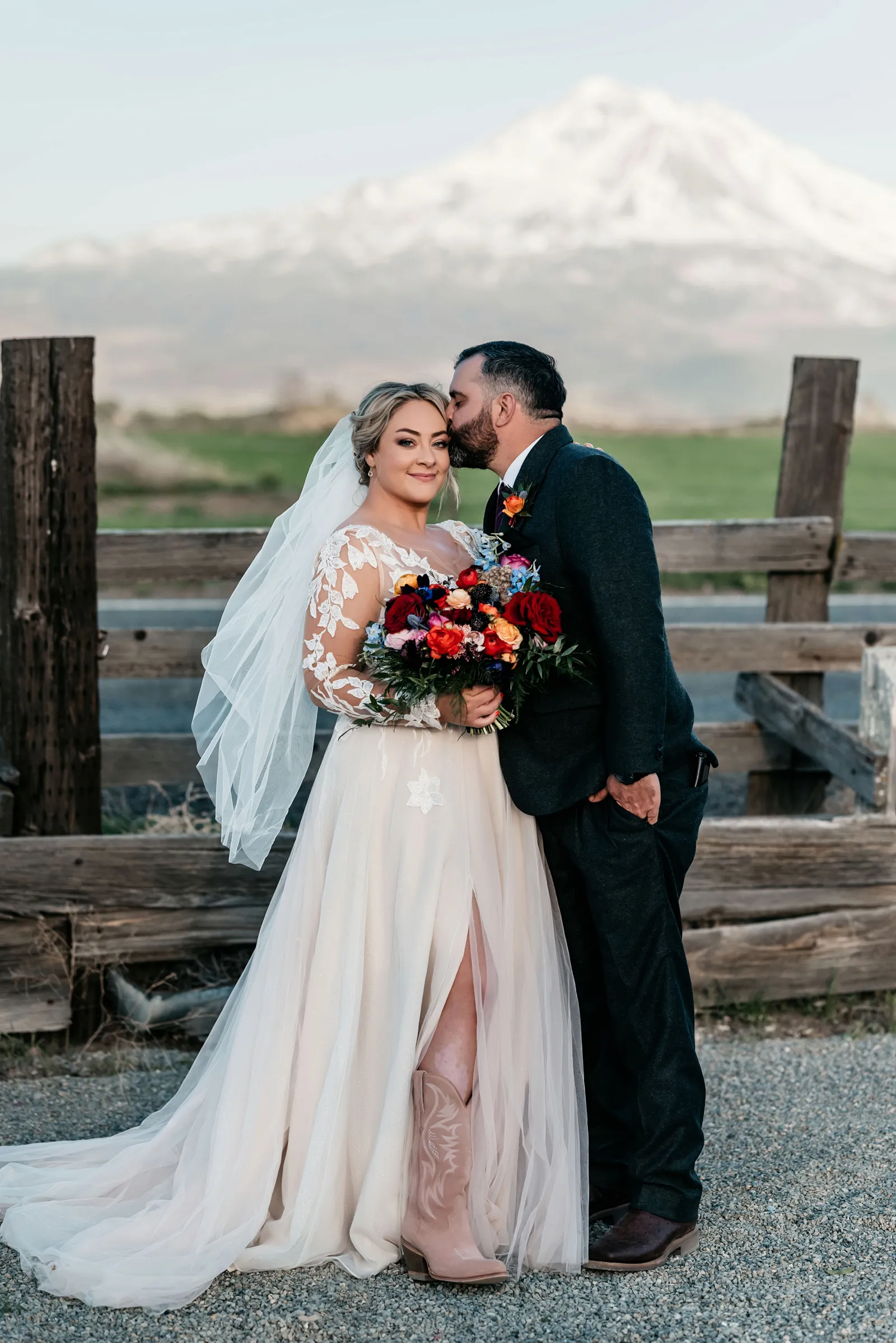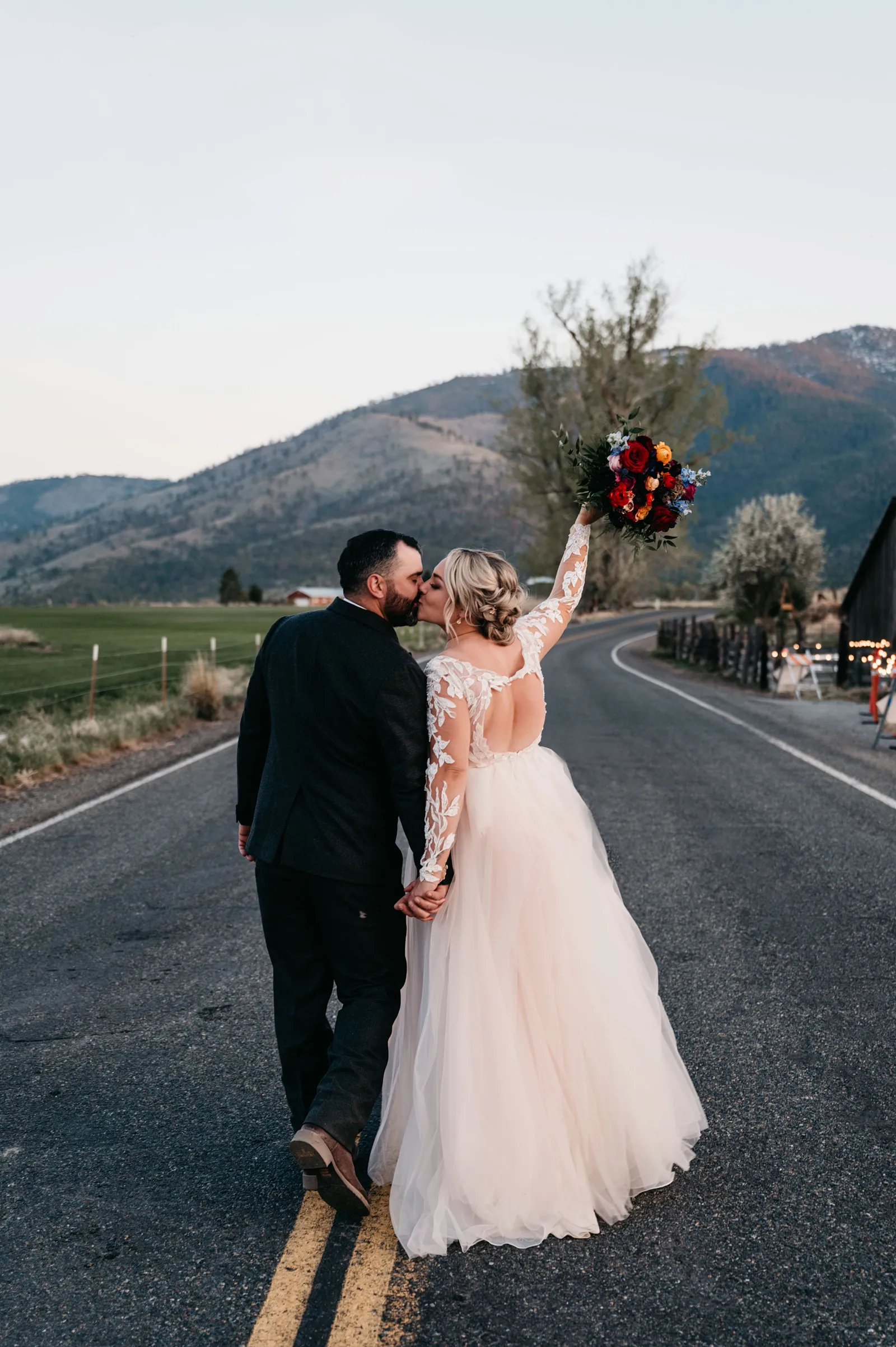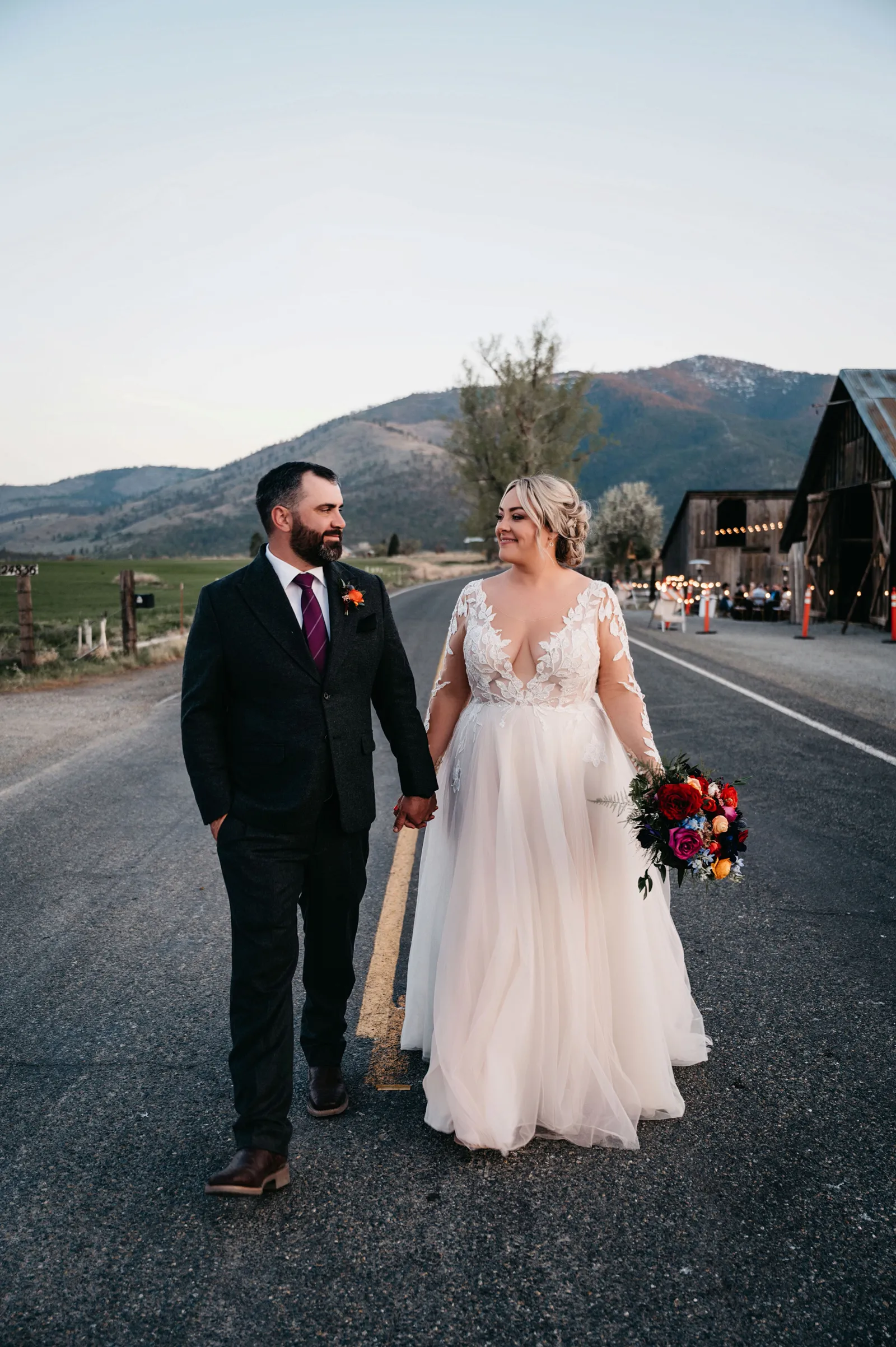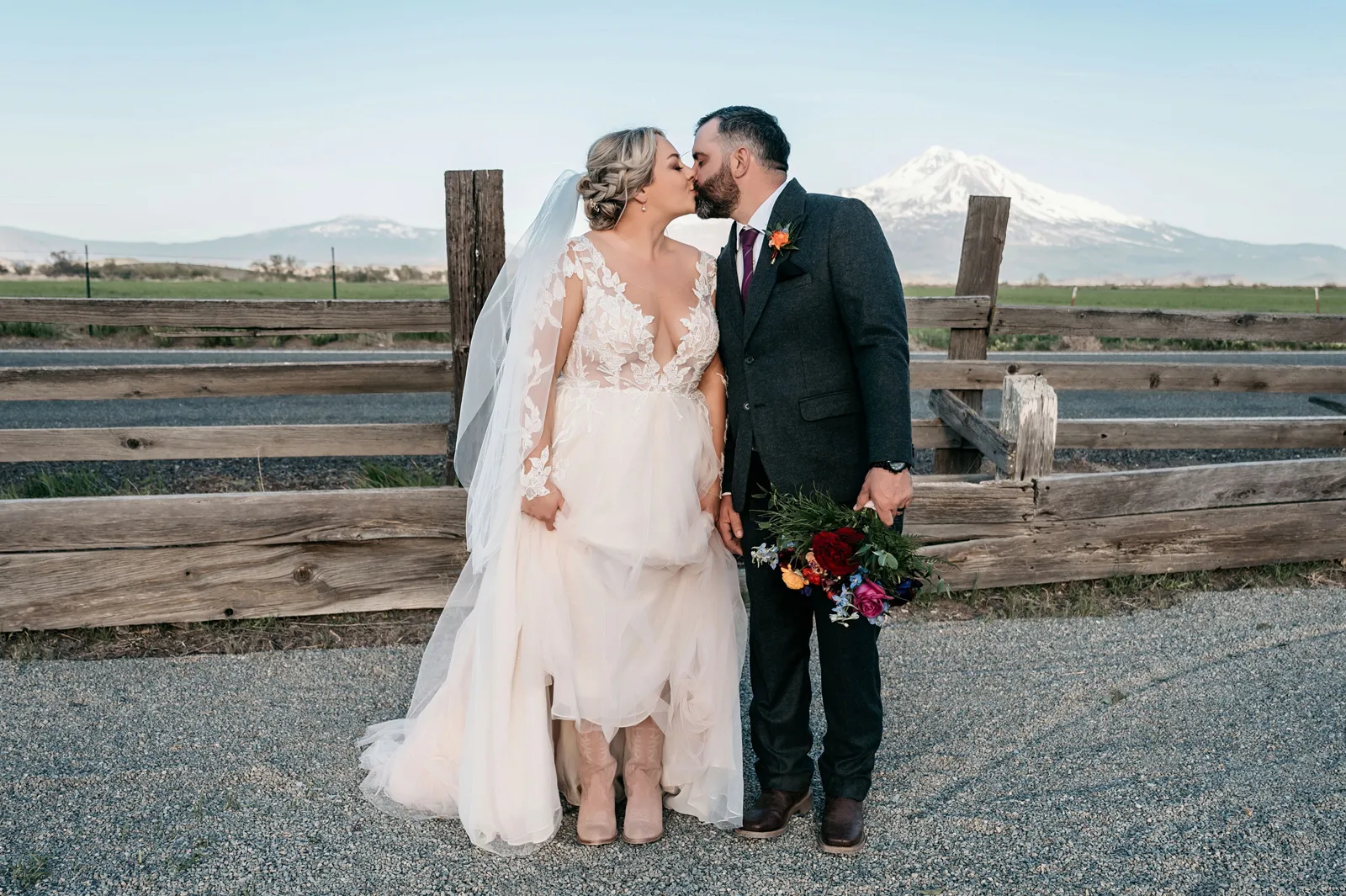 We really wanted everyone to feel immersed in the cozy, rustic setting with the scenic view of Mount Shasta. The entire day was planned around golden hour, and the sun setting casting a pink hue on Mount Shasta, leading into a candlelit, twinkle light-filled evening of dancing and dessert. We added 1,000 feet of string lights inside the barn and outside in the reception space, and it all went off without a hitch!