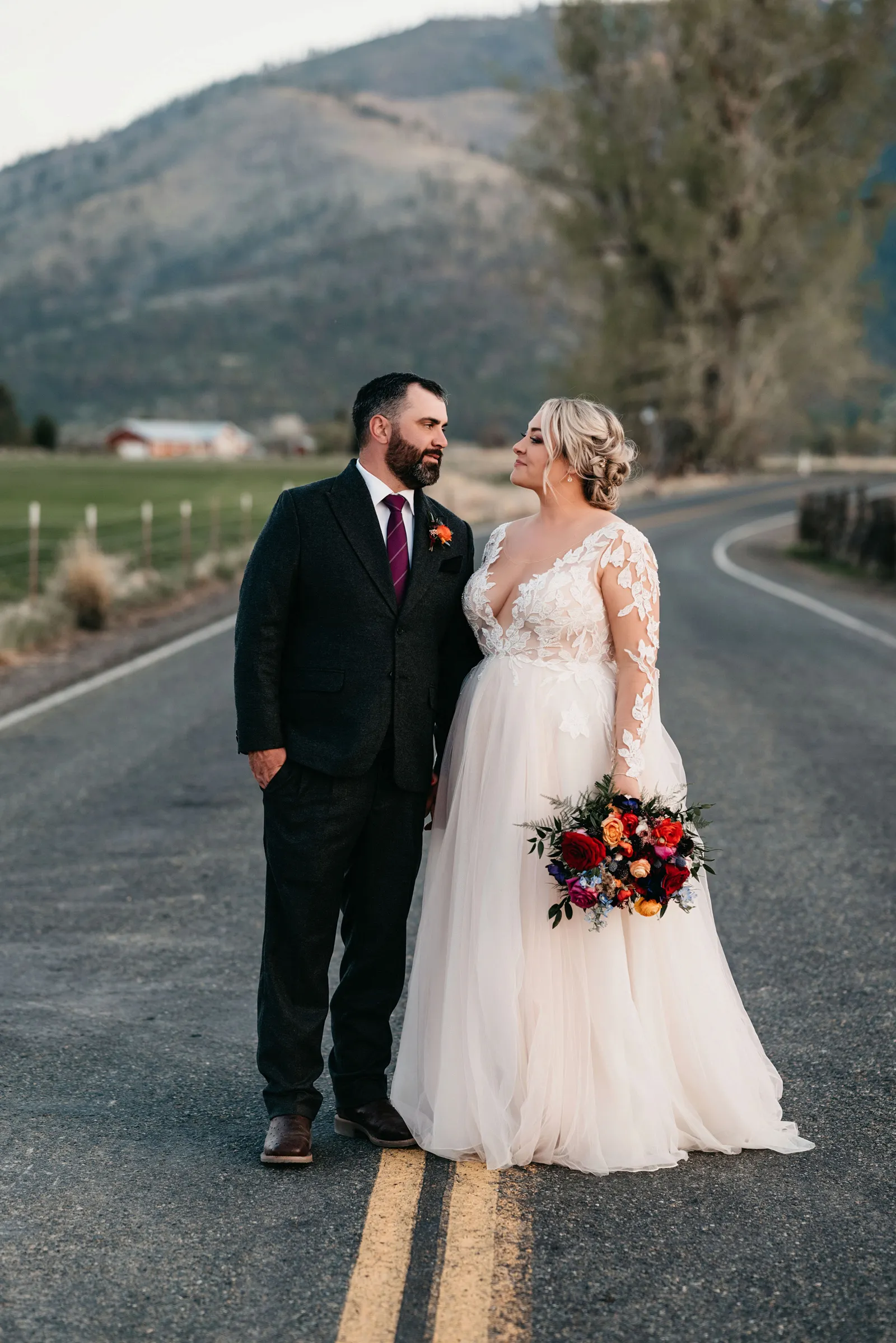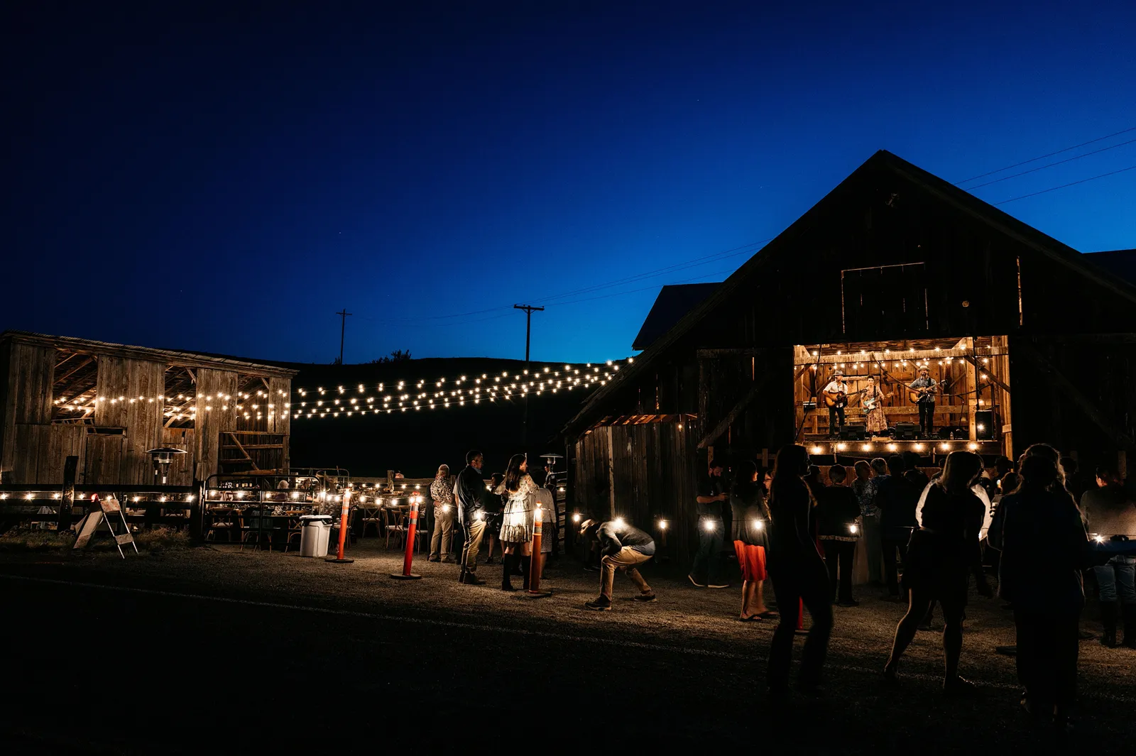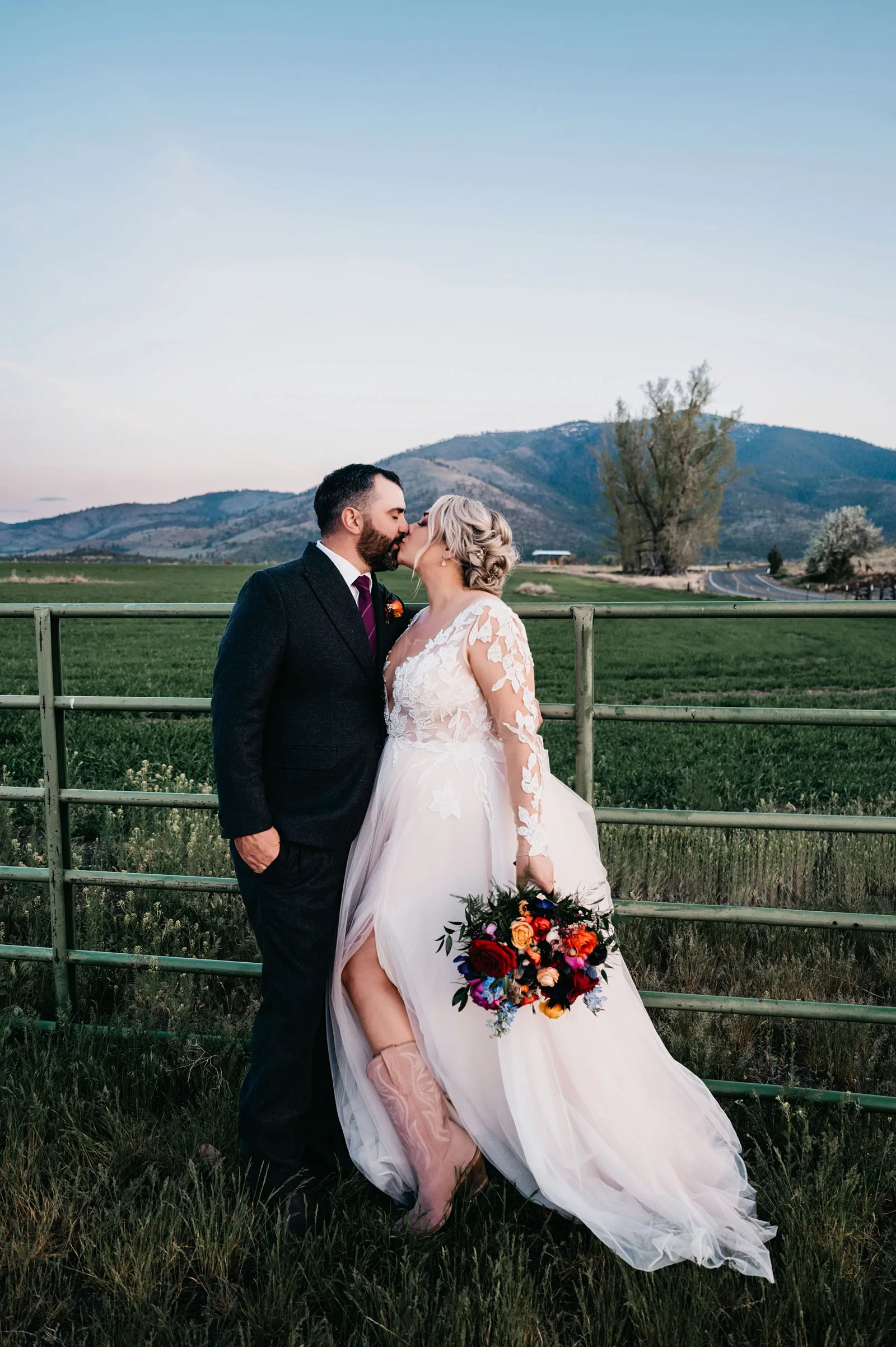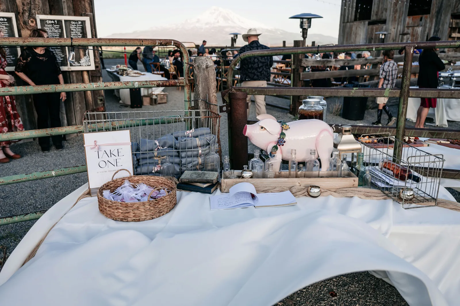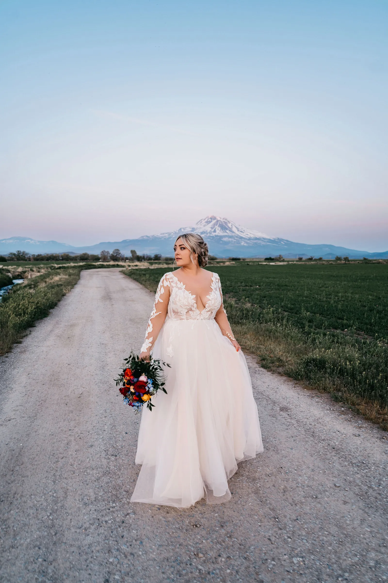 We really wanted everyone to feel immersed in the cozy, rustic setting with the scenic view of Mount Shasta. The entire day was planned around golden hour, and the sun setting casting a pink hue on Mount Shasta, leading into a candlelit, twinkle light-filled evening of dancing and dessert. We added 1,000 feet of string lights inside the barn and outside in the reception space, and it all went off without a hitch!