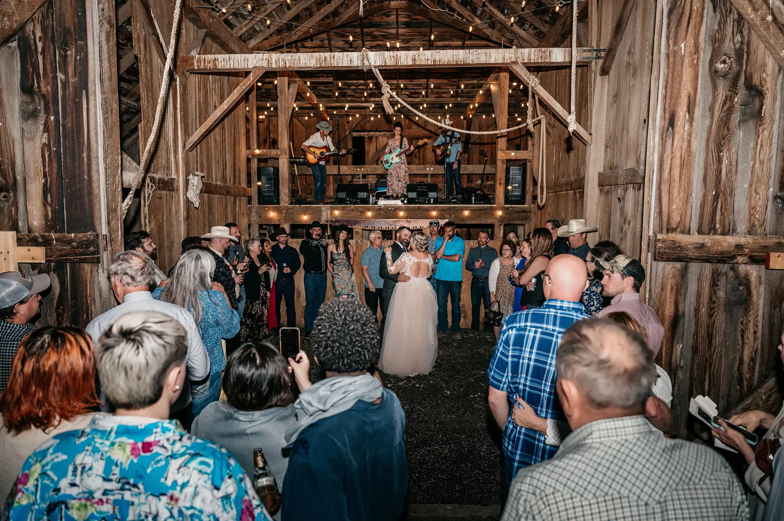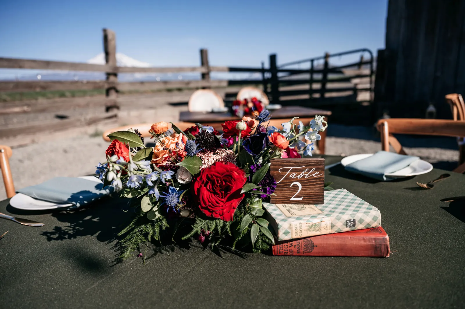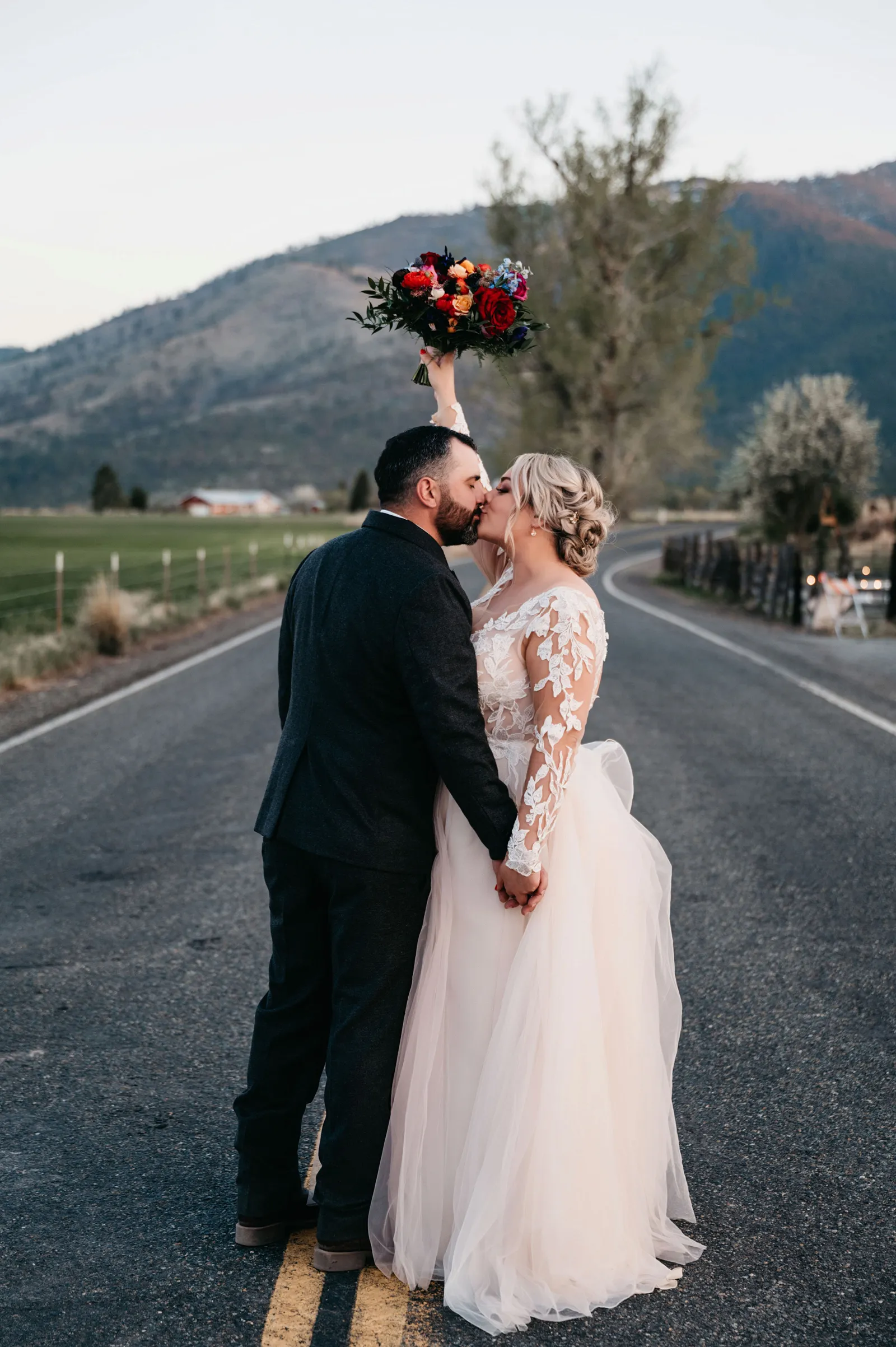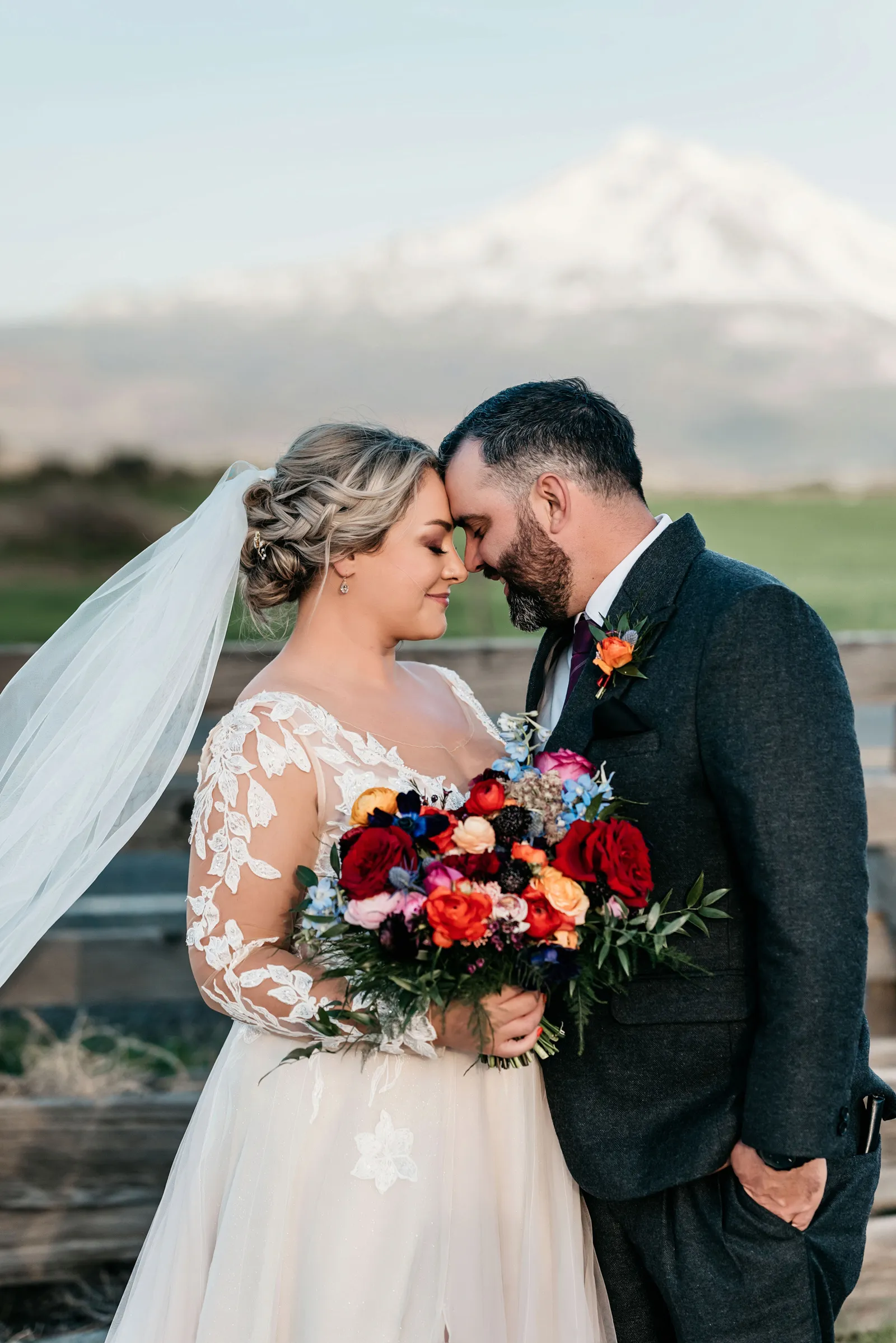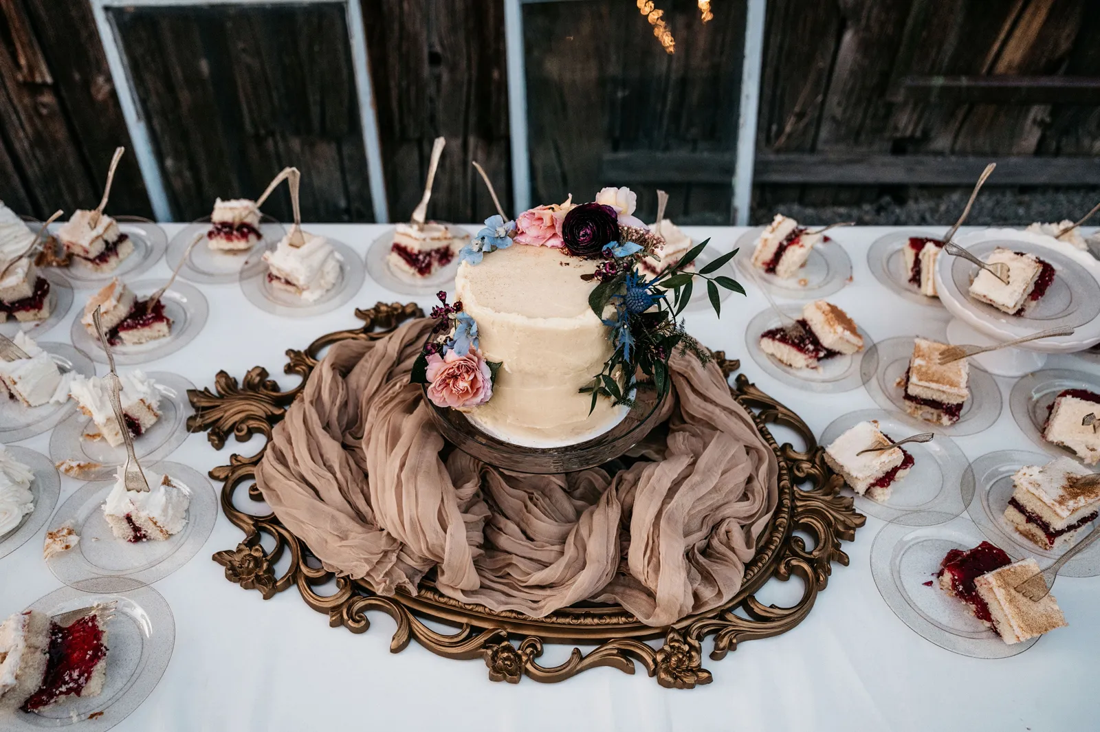 We really wanted everyone to feel immersed in the cozy, rustic setting with the scenic view of Mount Shasta. The entire day was planned around golden hour, and the sun setting casting a pink hue on Mount Shasta, leading into a candlelit, twinkle light-filled evening of dancing and dessert. We added 1,000 feet of string lights inside the barn and outside in the reception space, and it all went off without a hitch!