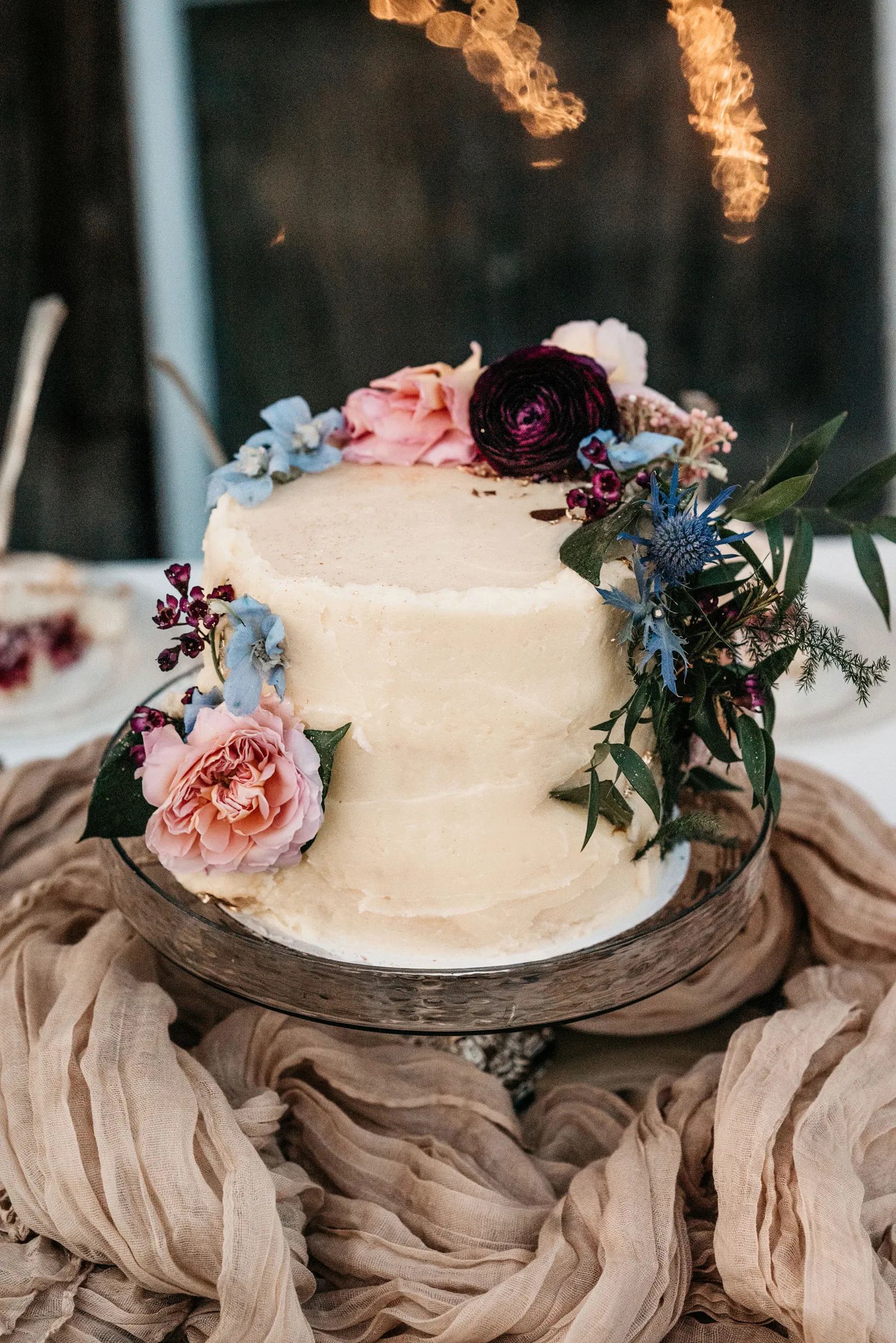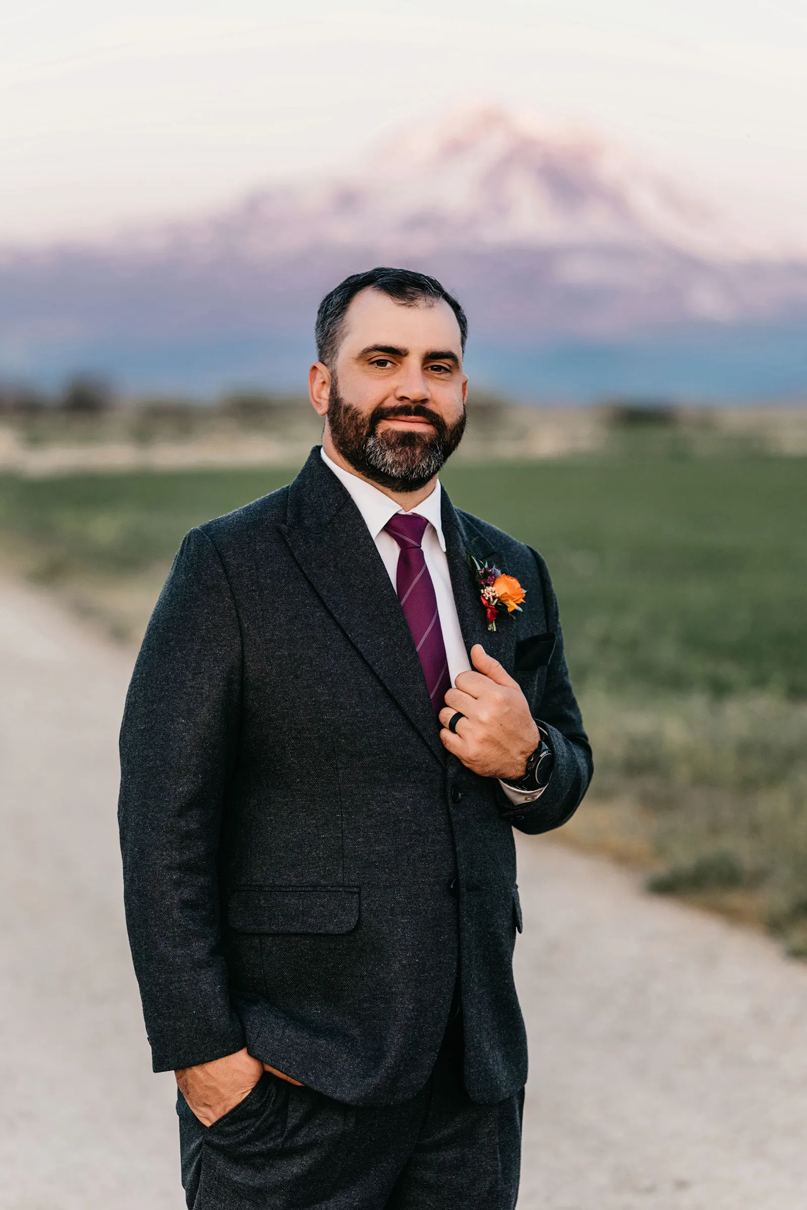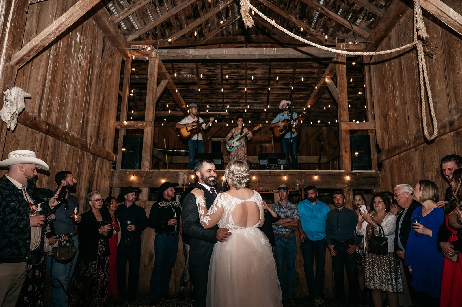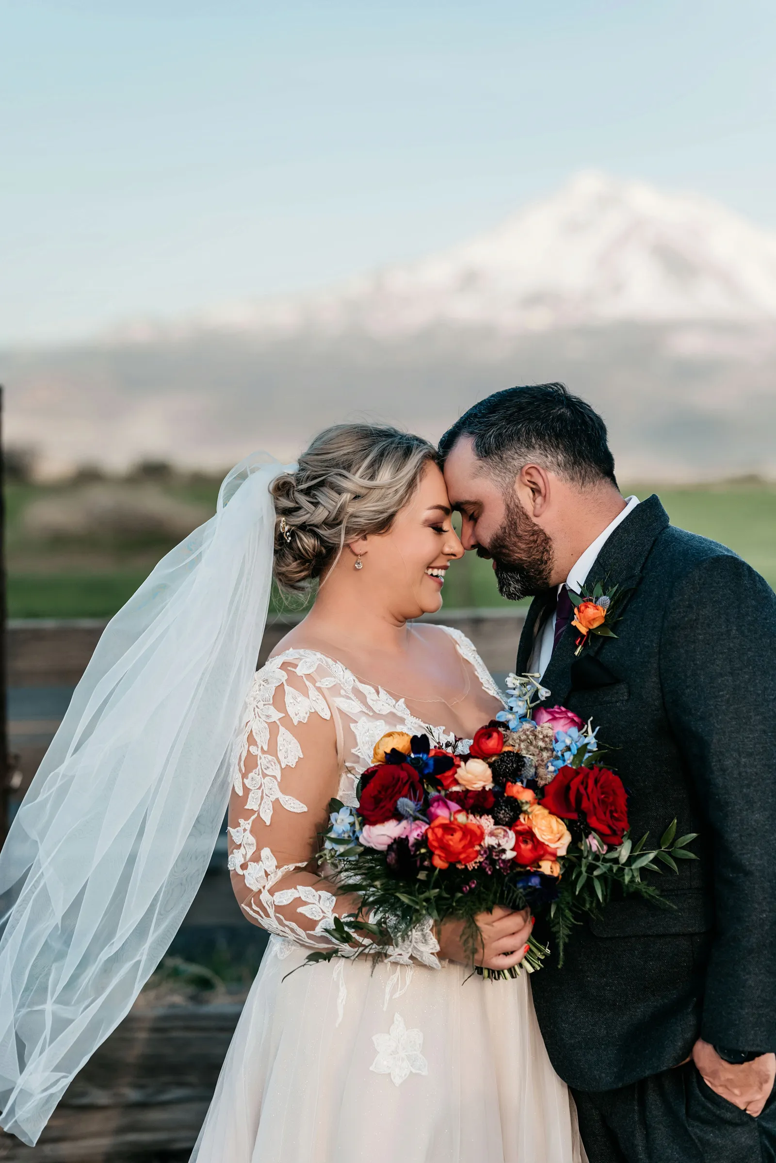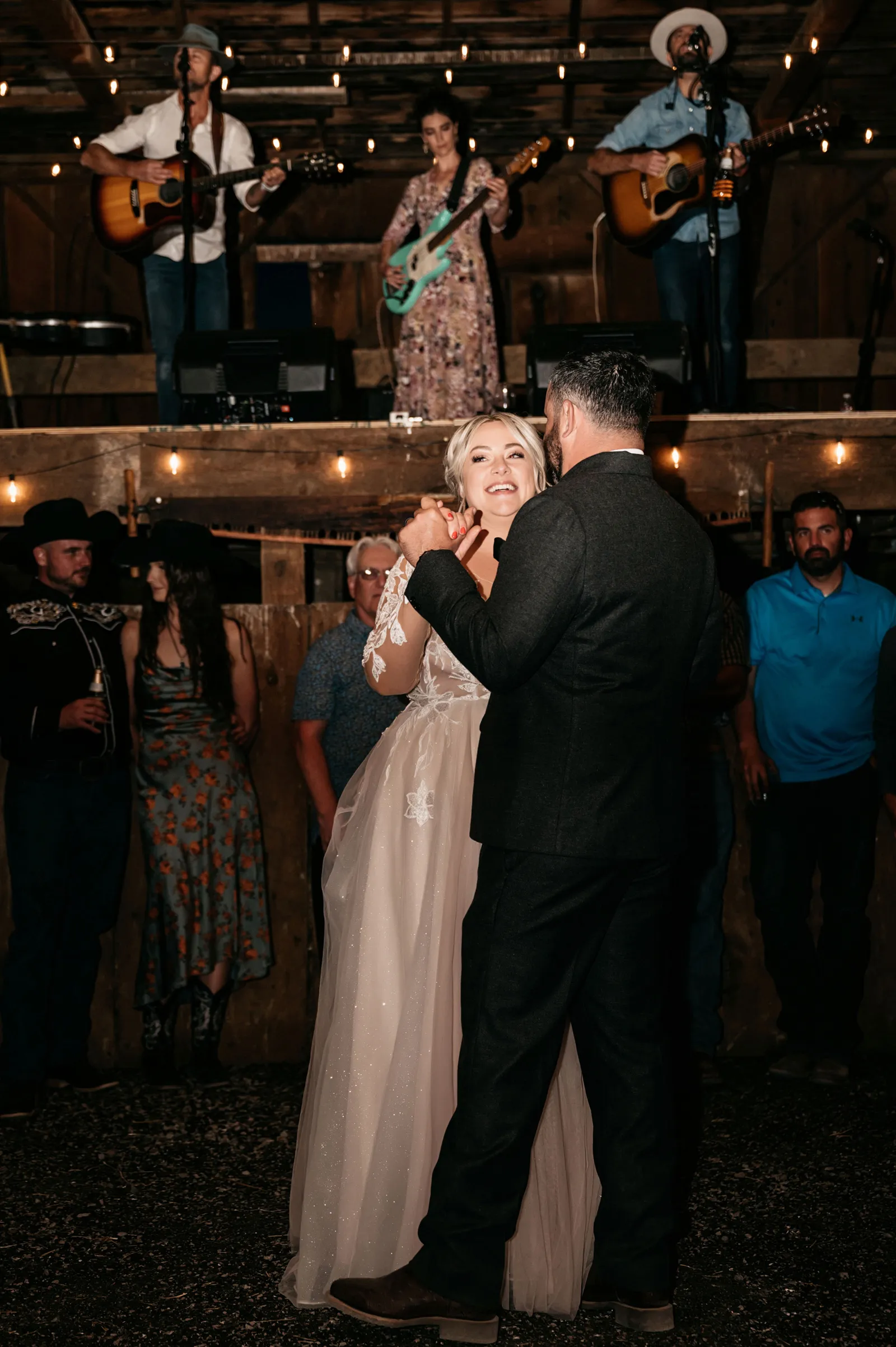We really wanted everyone to feel immersed in the cozy, rustic setting with the scenic view of Mount Shasta. The entire day was planned around golden hour, and the sun setting casting a pink hue on Mount Shasta, leading into a candlelit, twinkle light-filled evening of dancing and dessert. We added 1,000 feet of string lights inside the barn and outside in the reception space, and it all went off without a hitch!