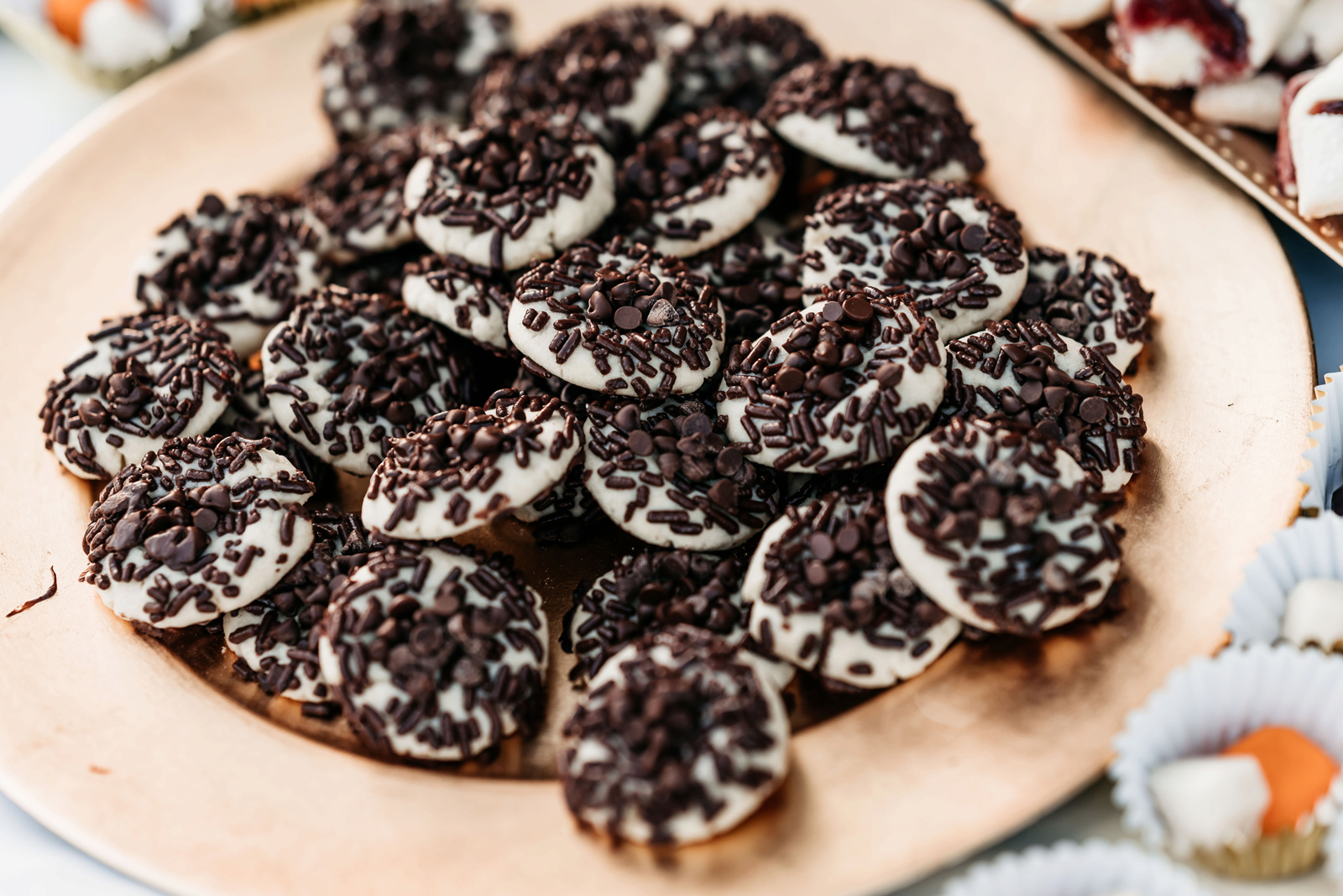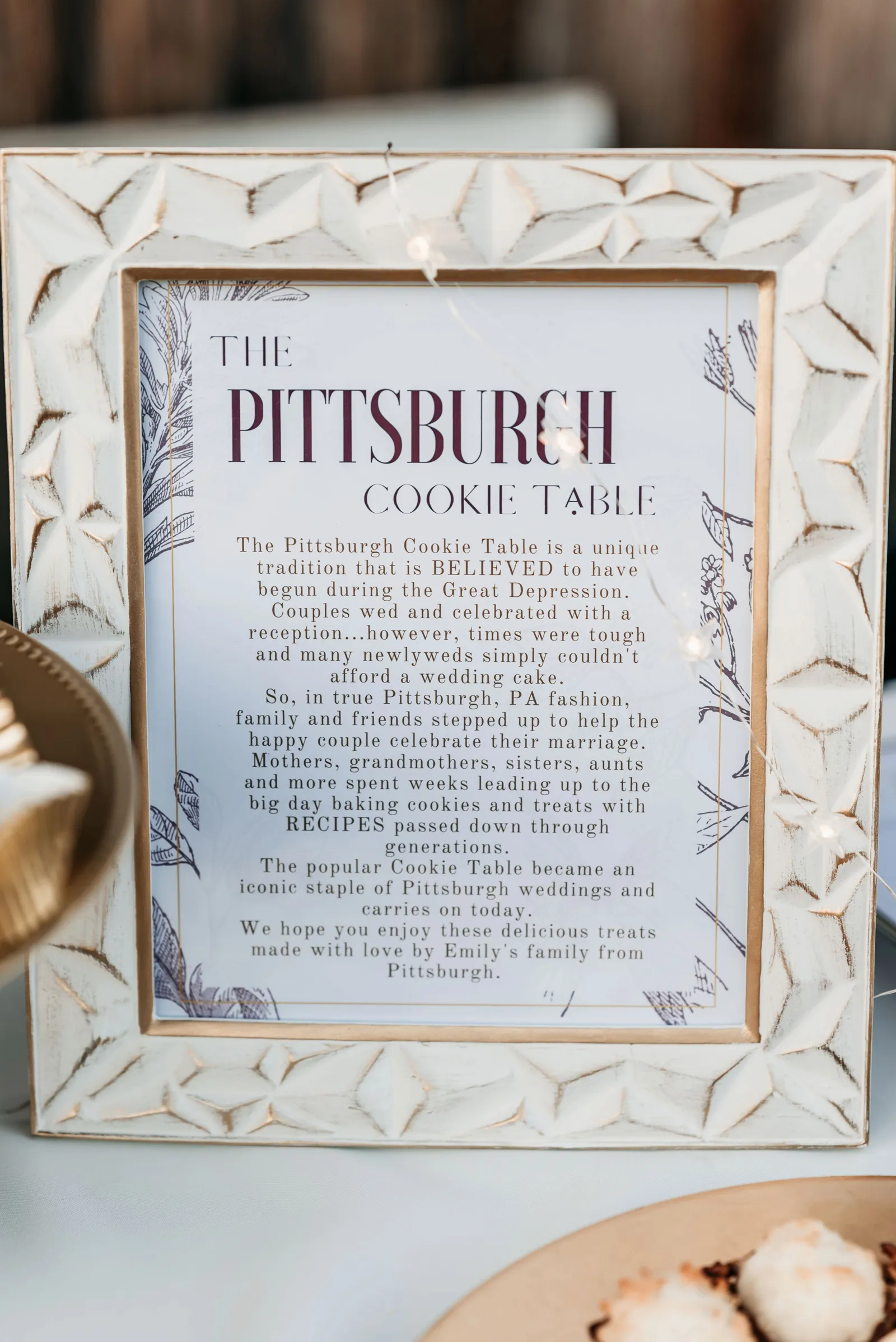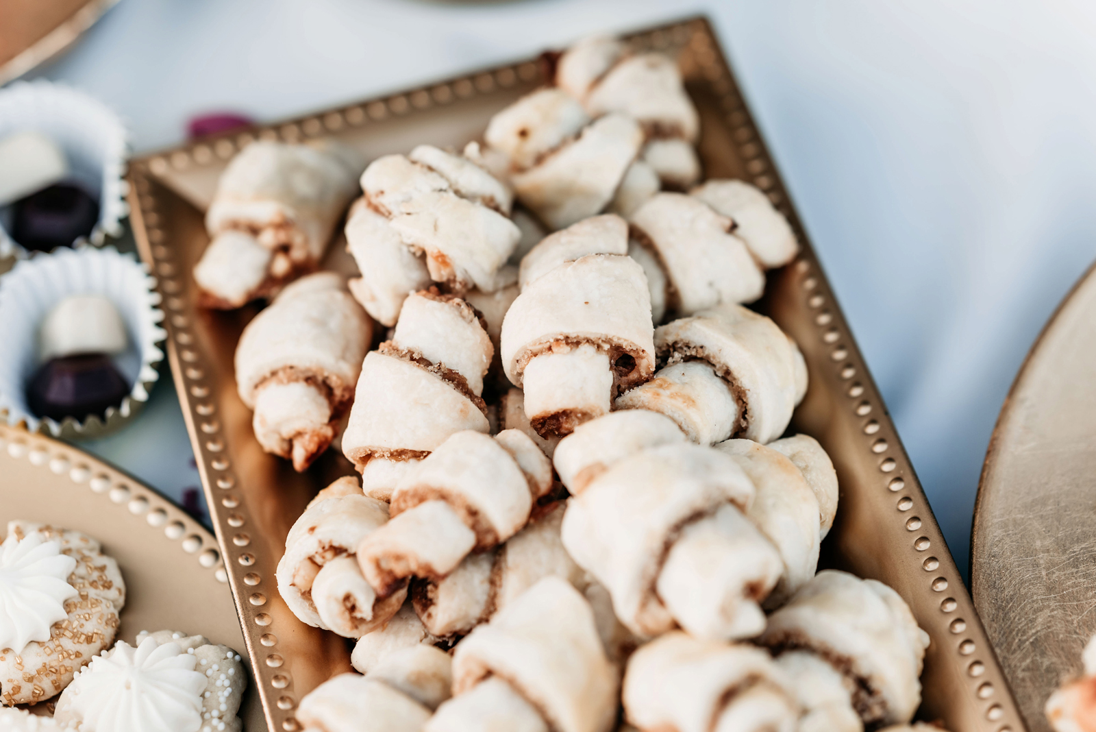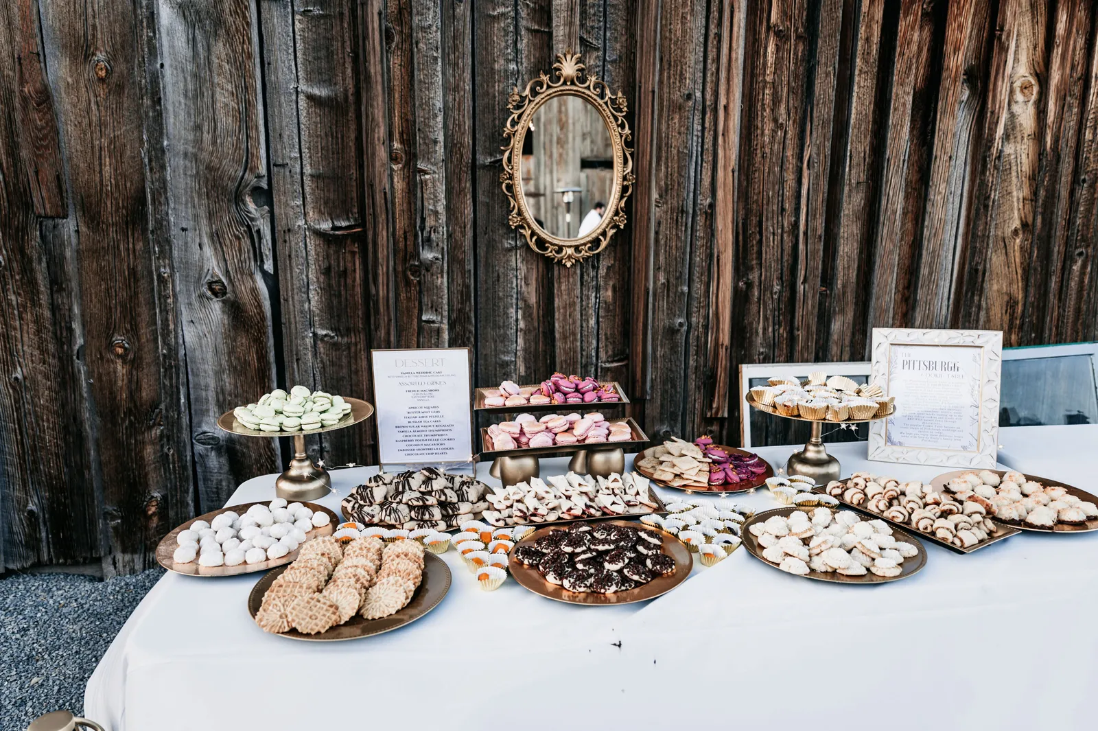The bride’s family is from Pittsburgh, PA, where there is a tradition to have a Cookie Table at wedding receptions. Guests bring homemade cookies to display on the table, and take-home containers are provided so everyone can take some home with them. The bride’s mom baked cookies for three weeks for our version of the “Pittsburgh Cookie Table” – it was a smashing success!