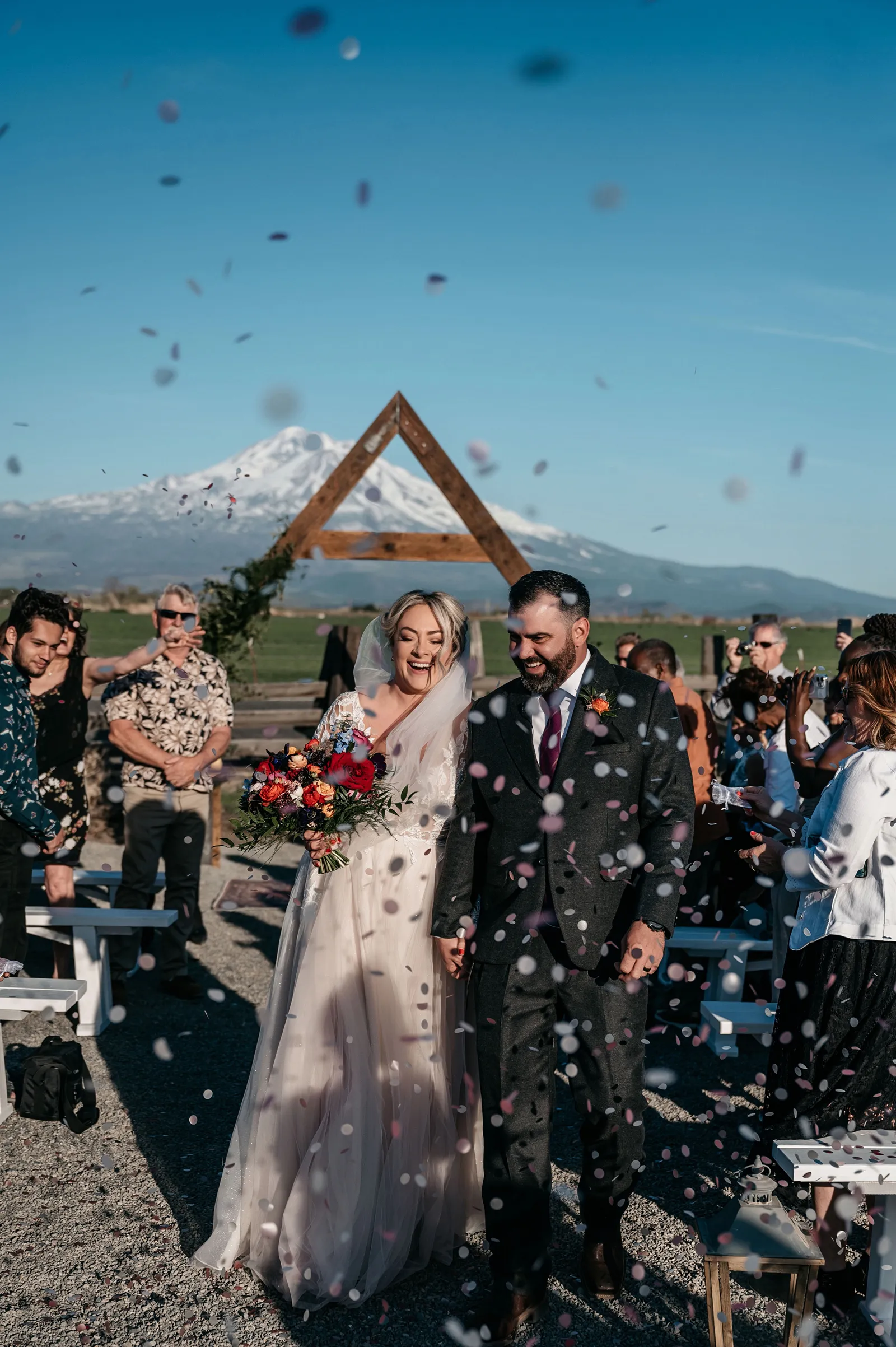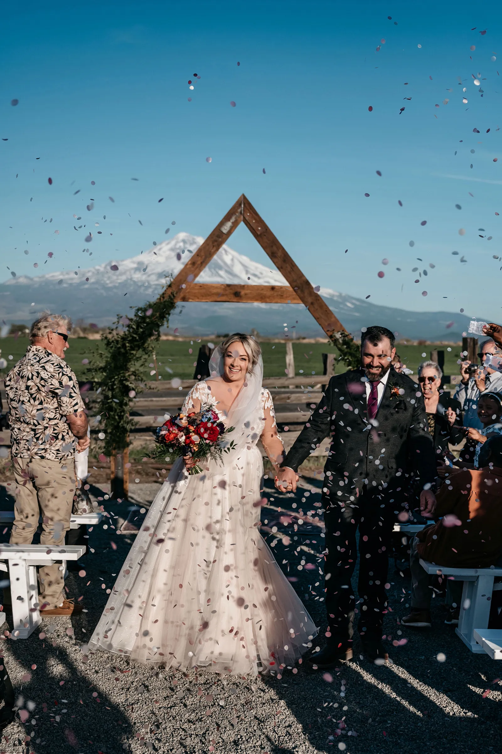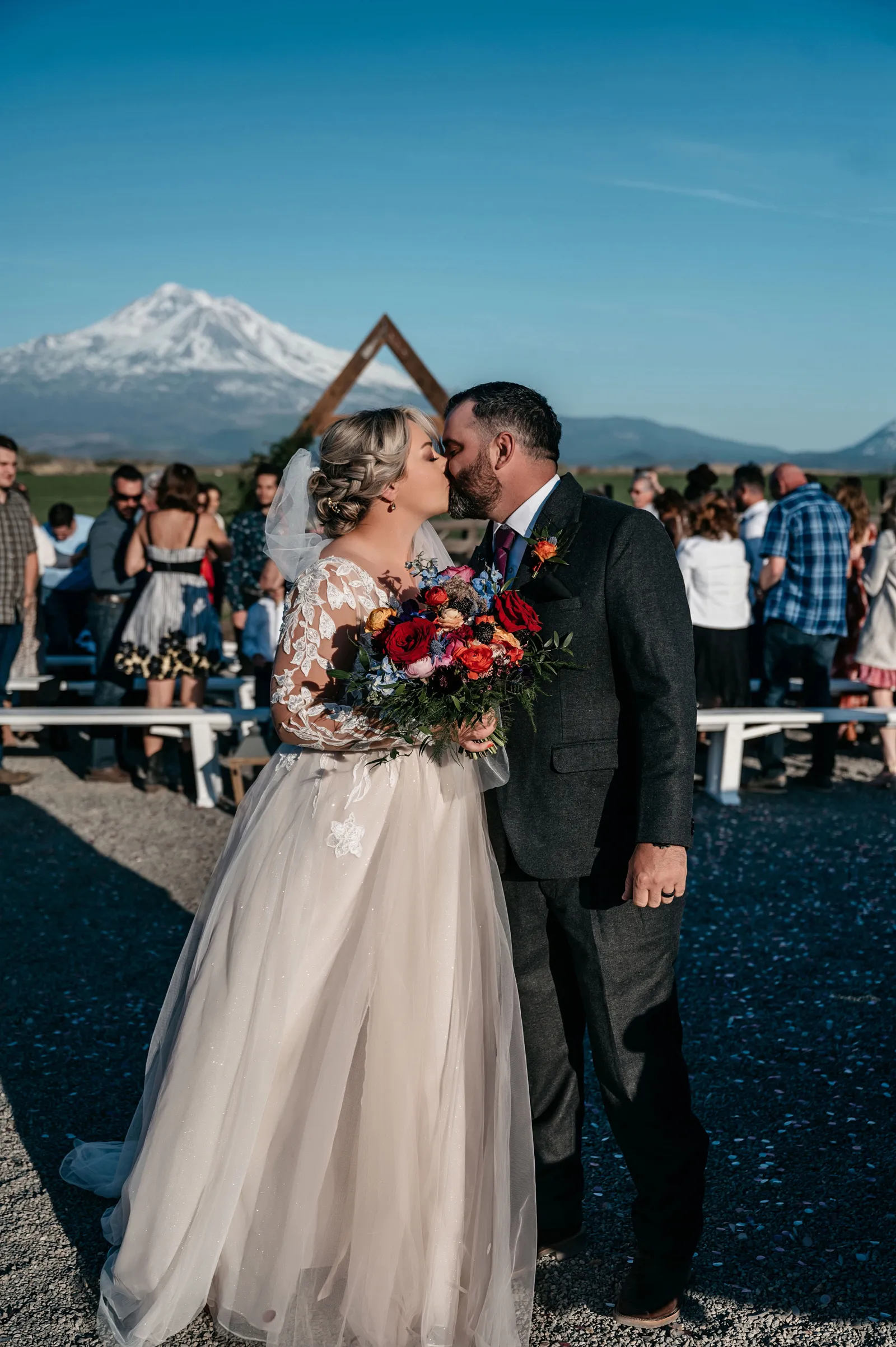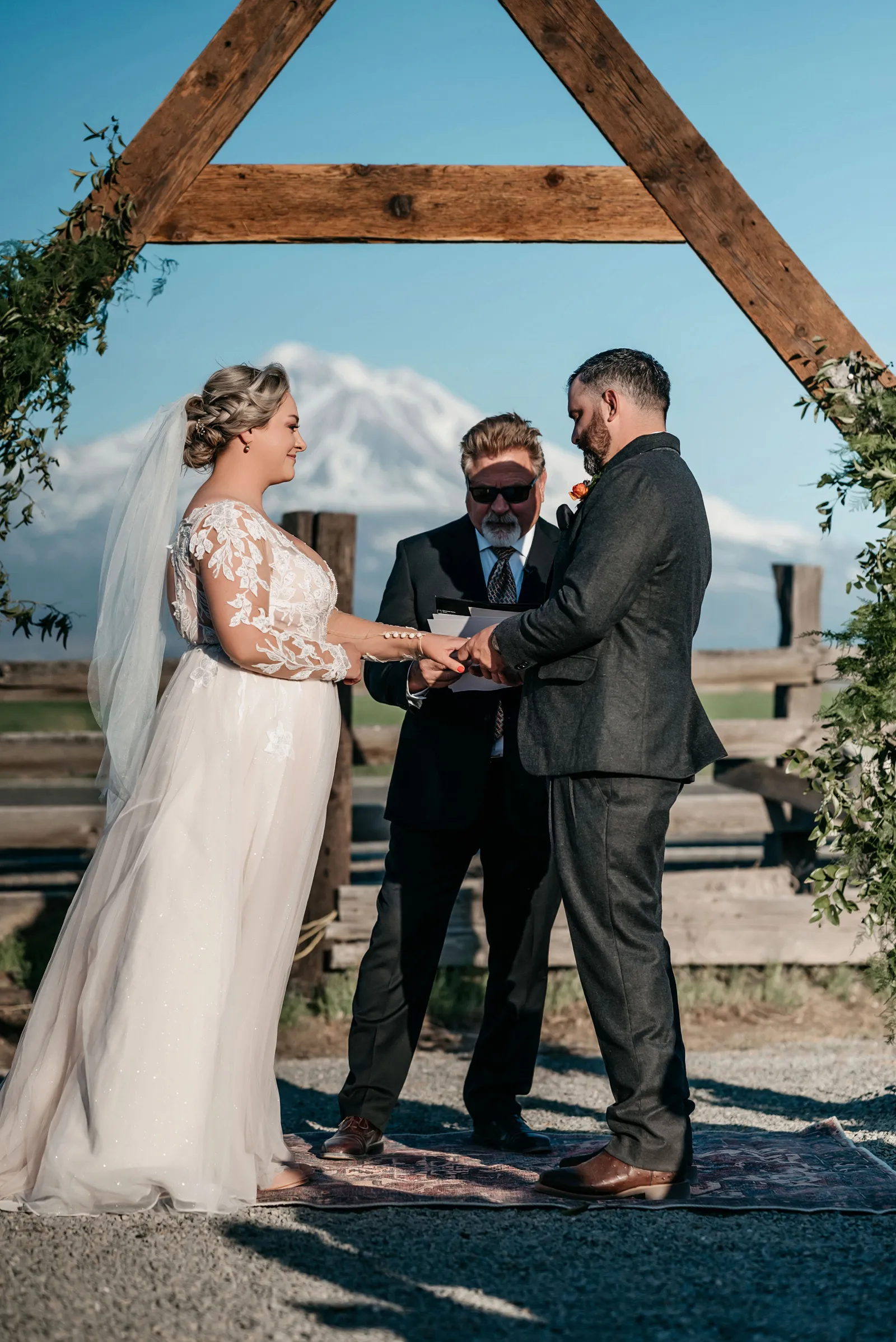 The ceremony was simple, yet special. We stood under an arch built by the groom, framing Mount Shasta in the background. Carl Lysgaard (the bride’s late father’s dear friend) performed the ceremony, and did so beautifully! We decided to forego a wedding party and just keep the main focus on us, as a couple. It was the best decision! It kept the ceremony short and sweet, but beautiful and meaningful.