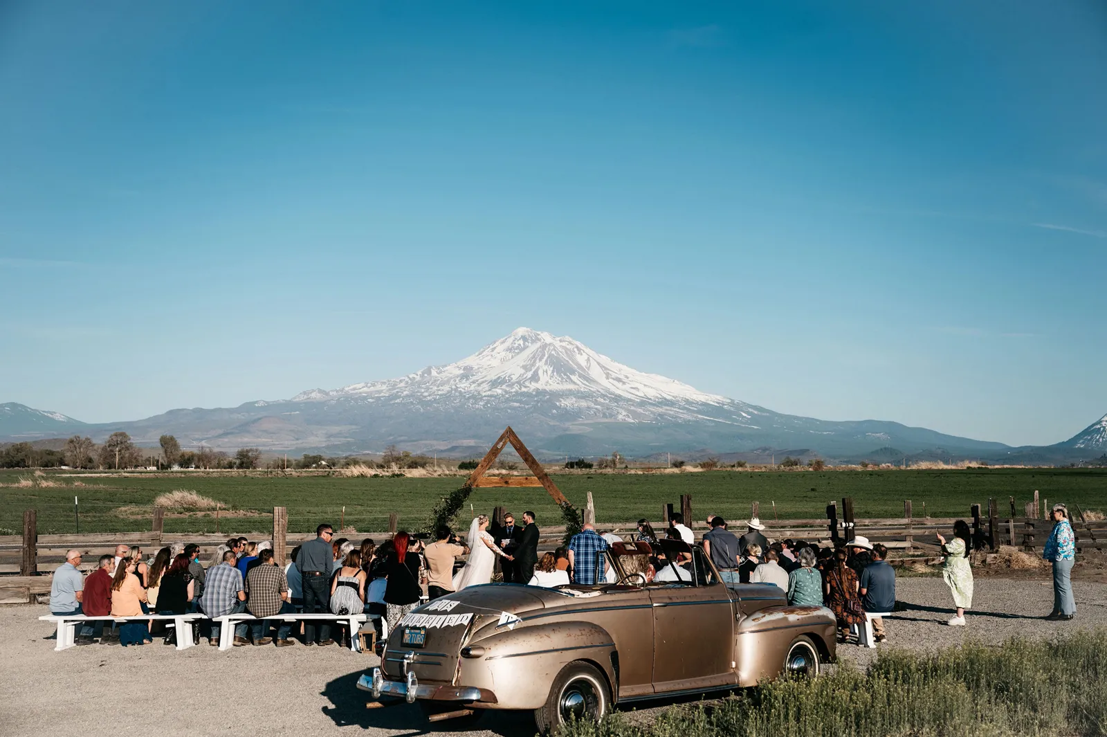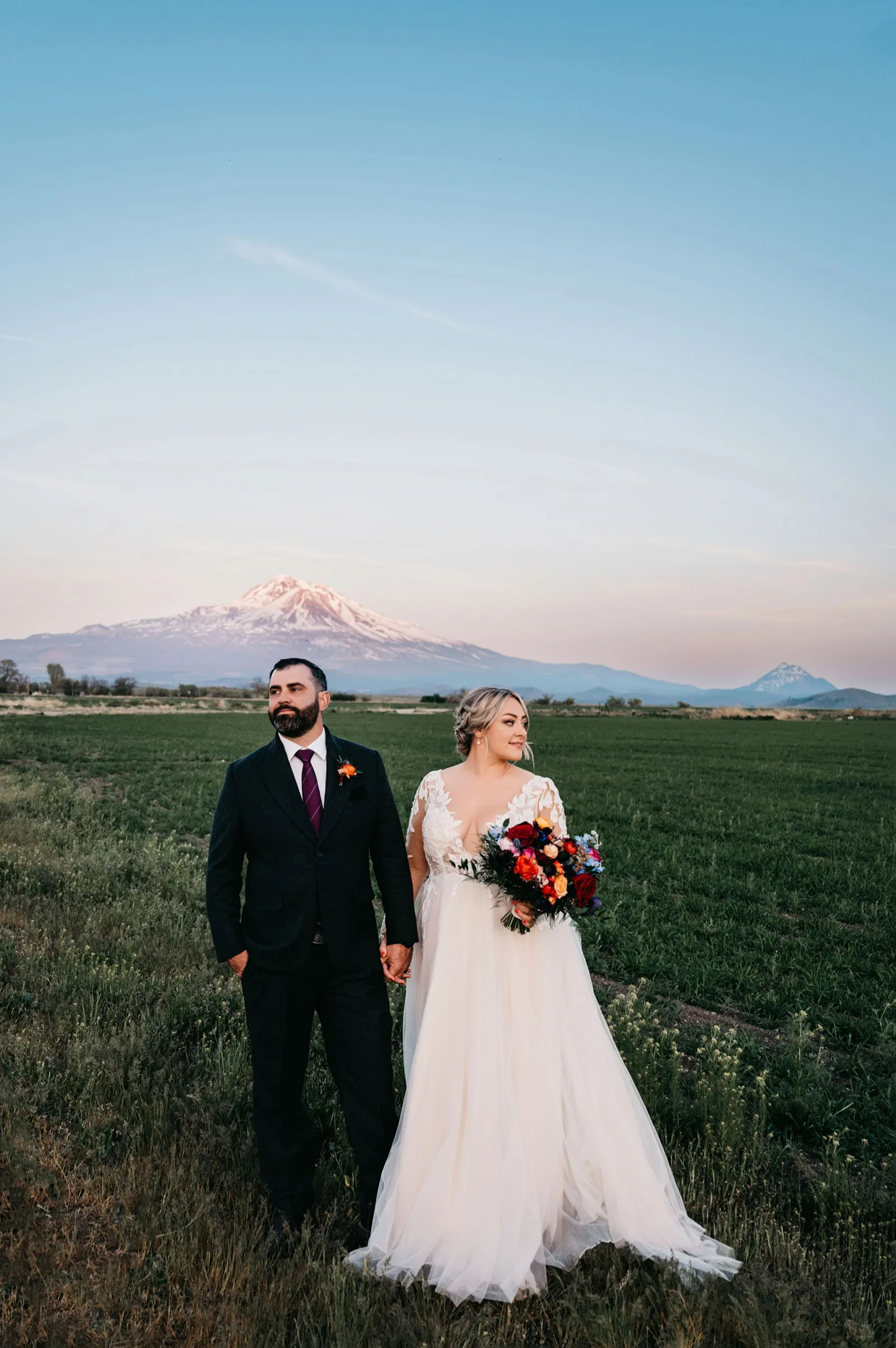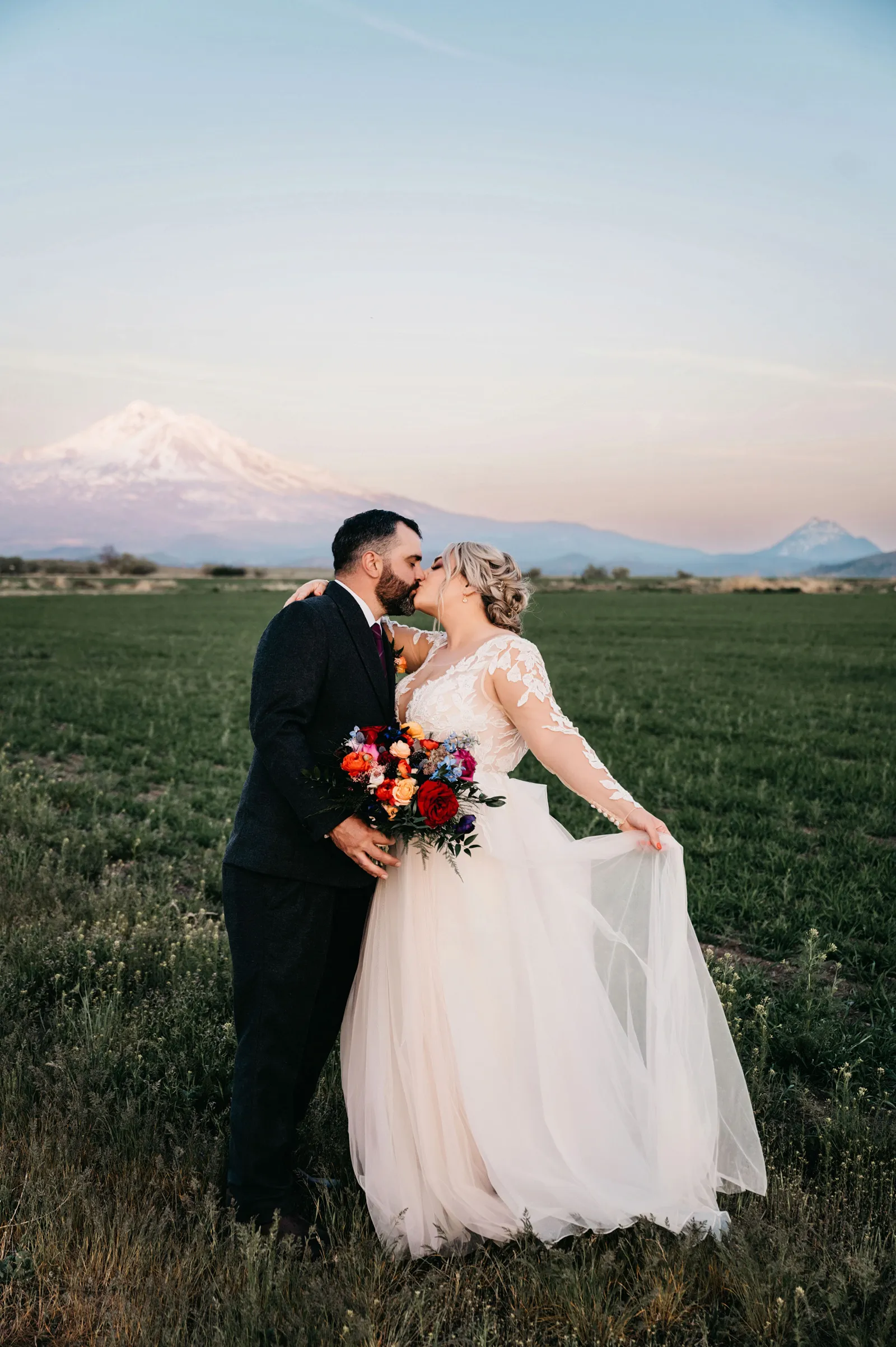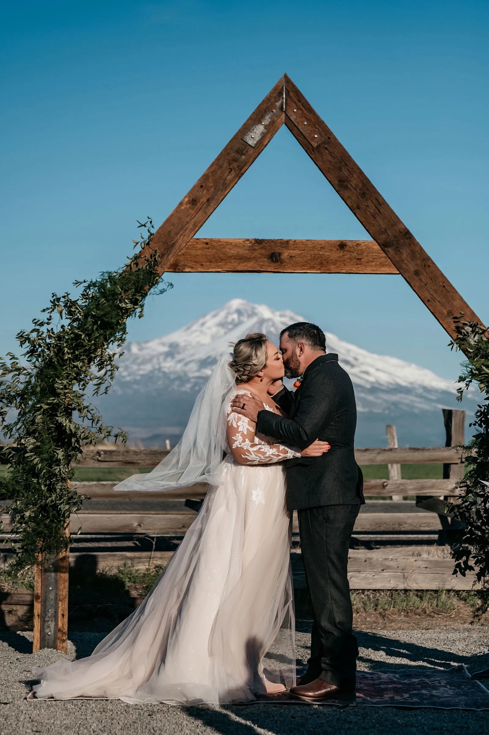 The ceremony was simple, yet special. We stood under an arch built by the groom, framing Mount Shasta in the background. Carl Lysgaard (the bride’s late father’s dear friend) performed the ceremony, and did so beautifully! We decided to forego a wedding party and just keep the main focus on us, as a couple. It was the best decision! It kept the ceremony short and sweet, but beautiful and meaningful.