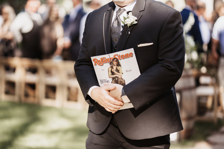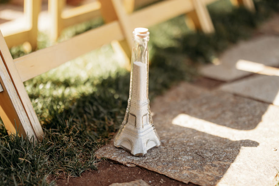 Our officiant was Jared’s best friend, Travis, so he made the ceremony super unique to u. Instead of reading from paper, he used a copy of Rolling Stone Magazine—his script was tailored perfectly for us. We also did a unity ceremony using sand that we poured from Eiffel Tower—shaped glasses.