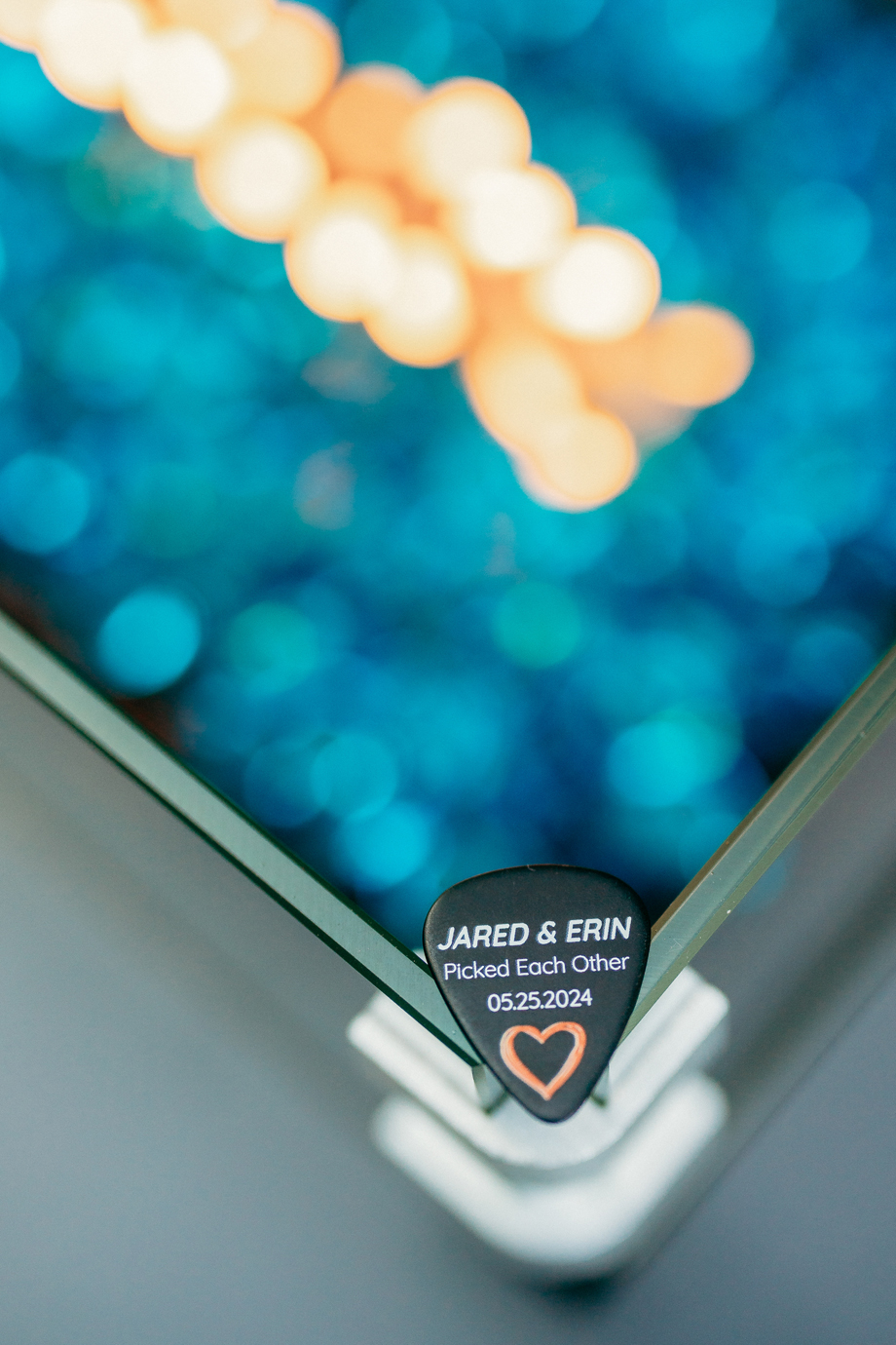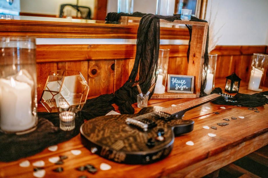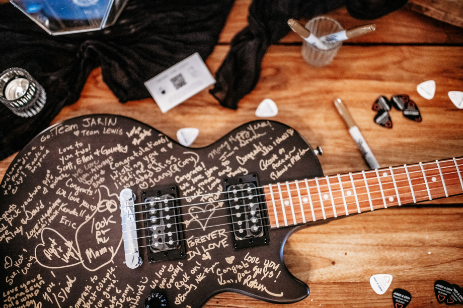 Our guestbook was an electric guitar! Everyone signed it, and we have it hanging in our home now—such a cool visual.