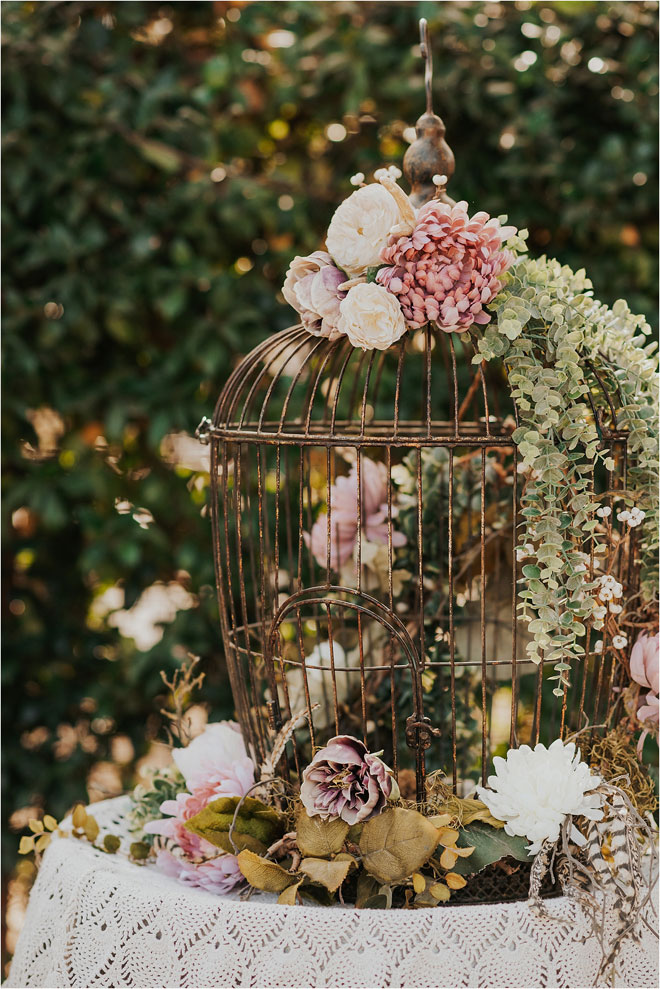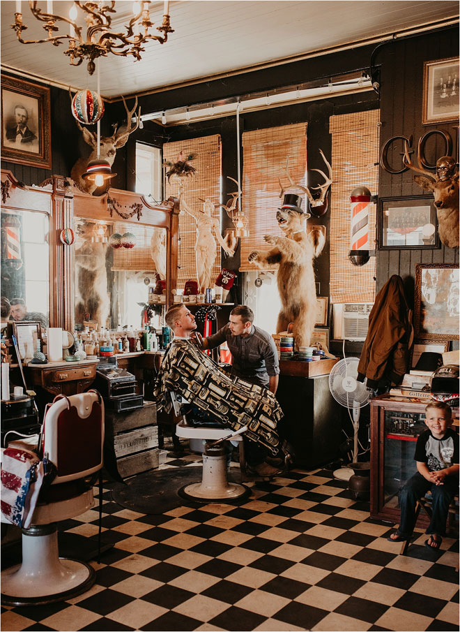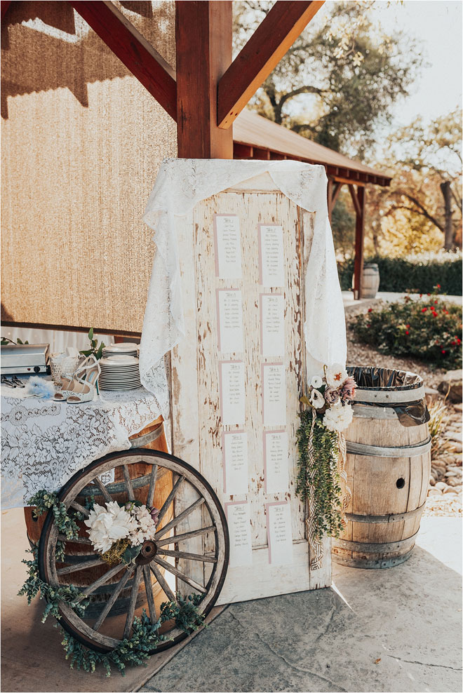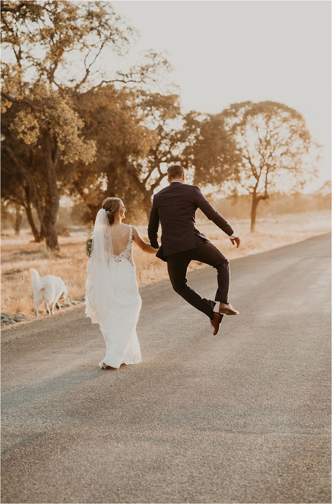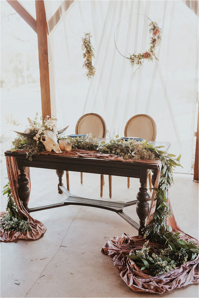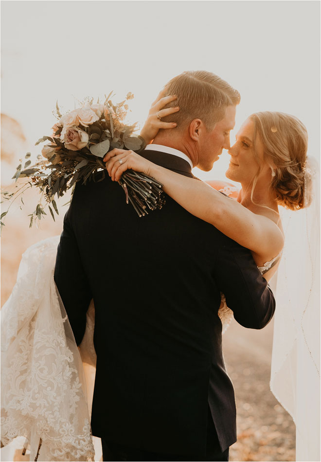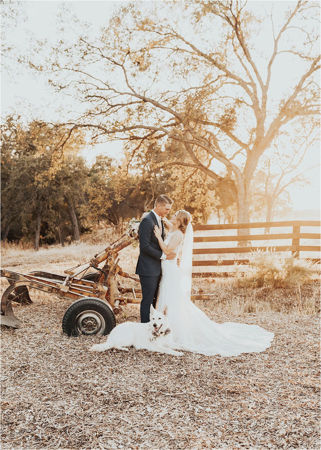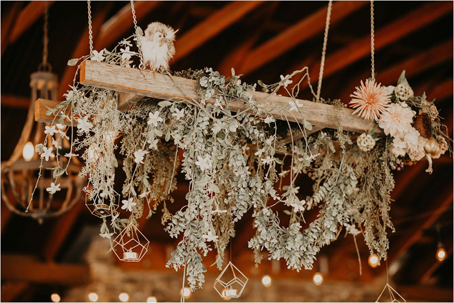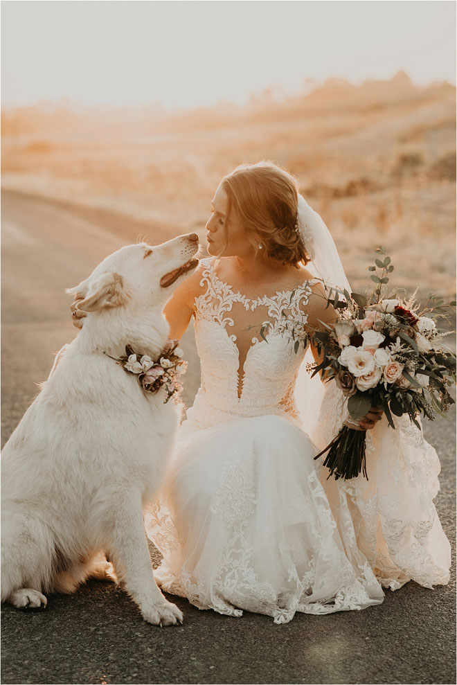 One particularly unique influence in their stylistic approach was the groom’s cultural heritage. “Kyle’s family is Celtic, and it is something he is very proud of,” Erin says, “so we tried to bring a touch of it into the wedding.” From custom rings to a whiskey barrel branded with the tree of life as a guest book, it was the little things that meant the most. Additionally, Kyle and Erin had a special guest in their wedding party. “My white German shepherd, Bismark, is a huge part of my life, and it was so important to me that he be involved in my big day,” Erin says. “He stayed in my cabin with me and laid right by my chair the entire time I got ready. And then he was, of course, in our pictures. Flower necklace and all!”