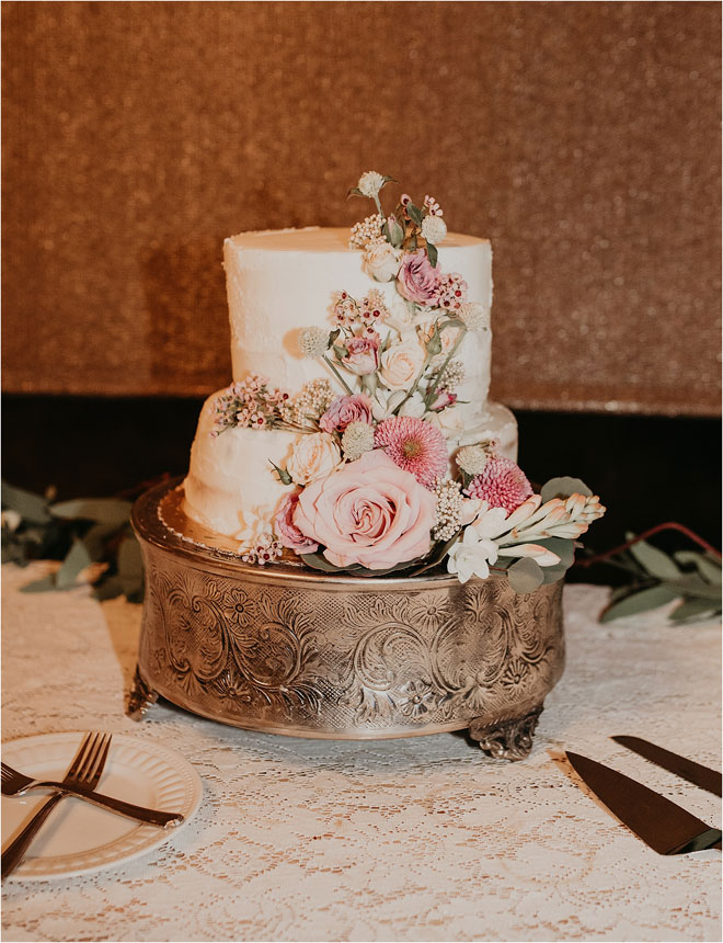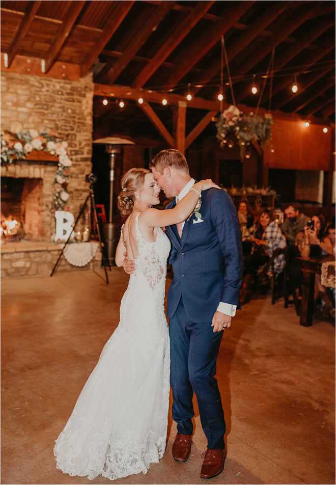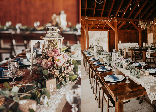 Kyle proposed to Erin on a quiet evening at home with paths of rose petals guiding Erin to Kyle who waited on one knee to ask her to be his wife. Over the course of the next year and a half, the couple planned their wedding with the help of their venue’s on-site coordinator. With an unconventional love story, they wanted their wedding to be as unique as them. Erin says, “We wanted the country feel but with a little bit of class. We had guests show up in nice jeans and cowboy hats, and some show up in suits.”