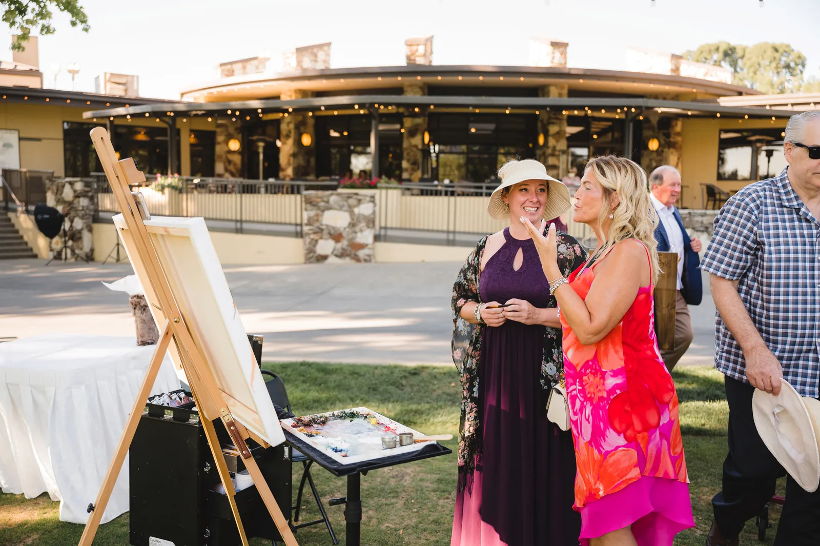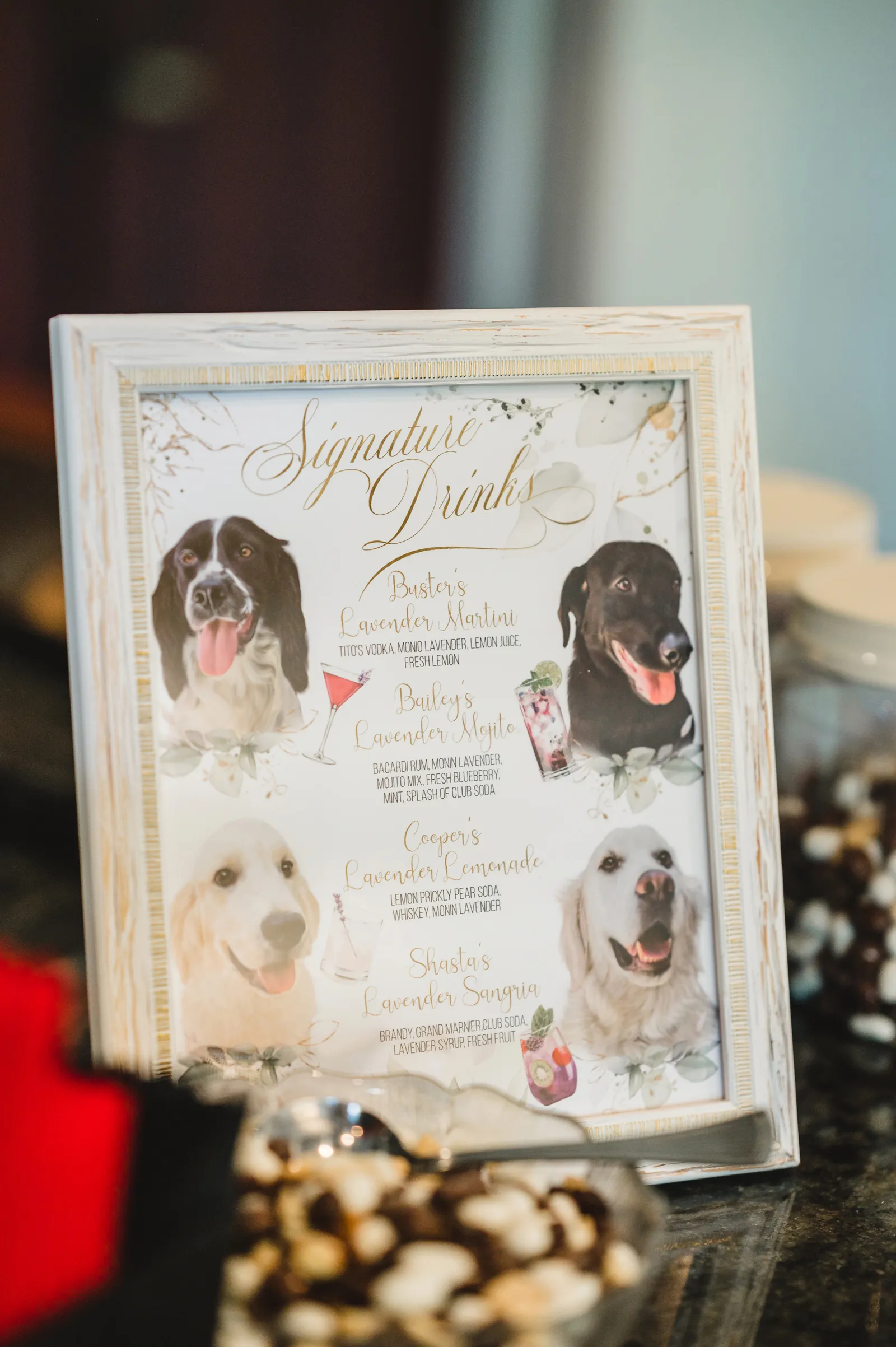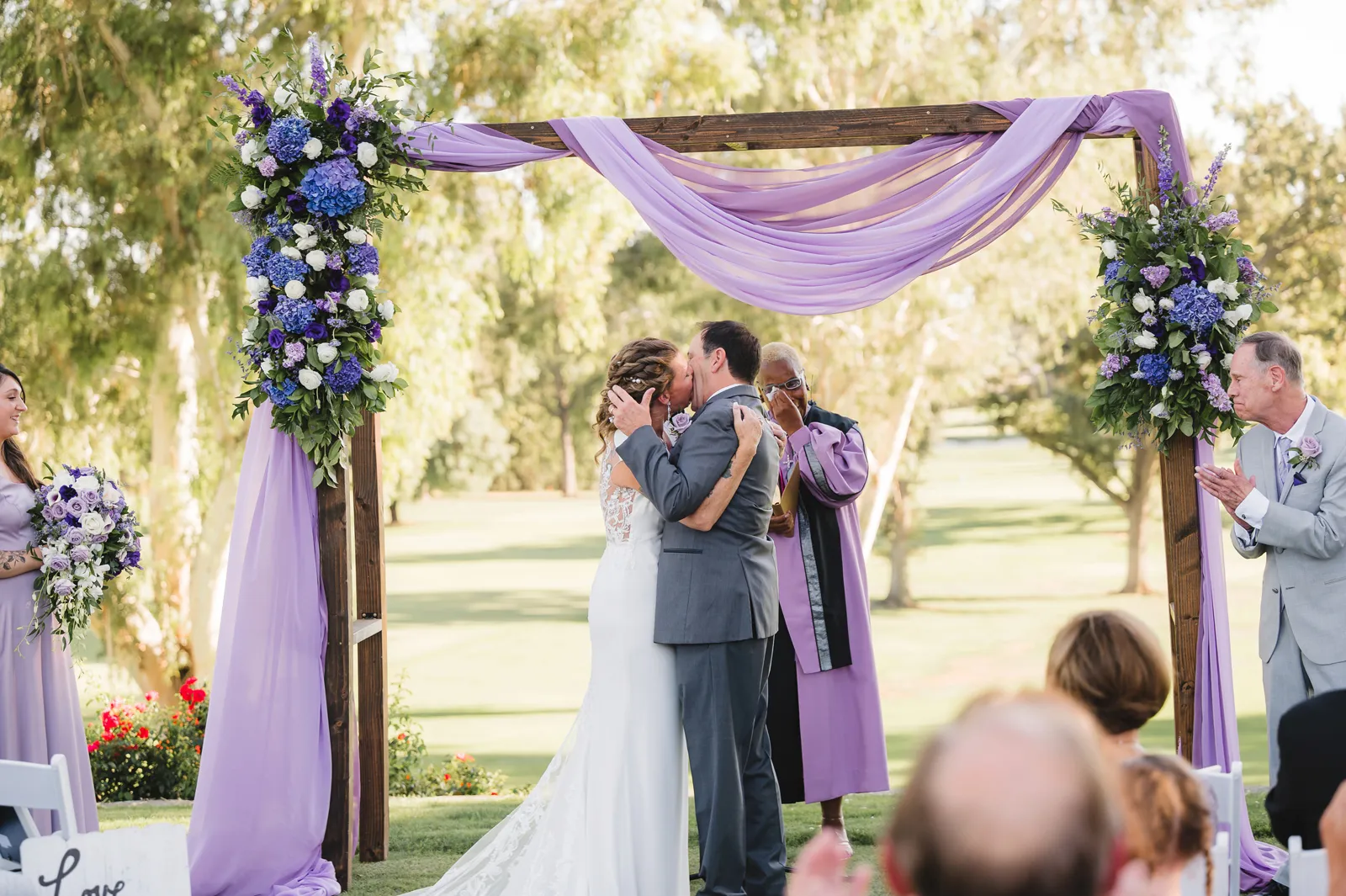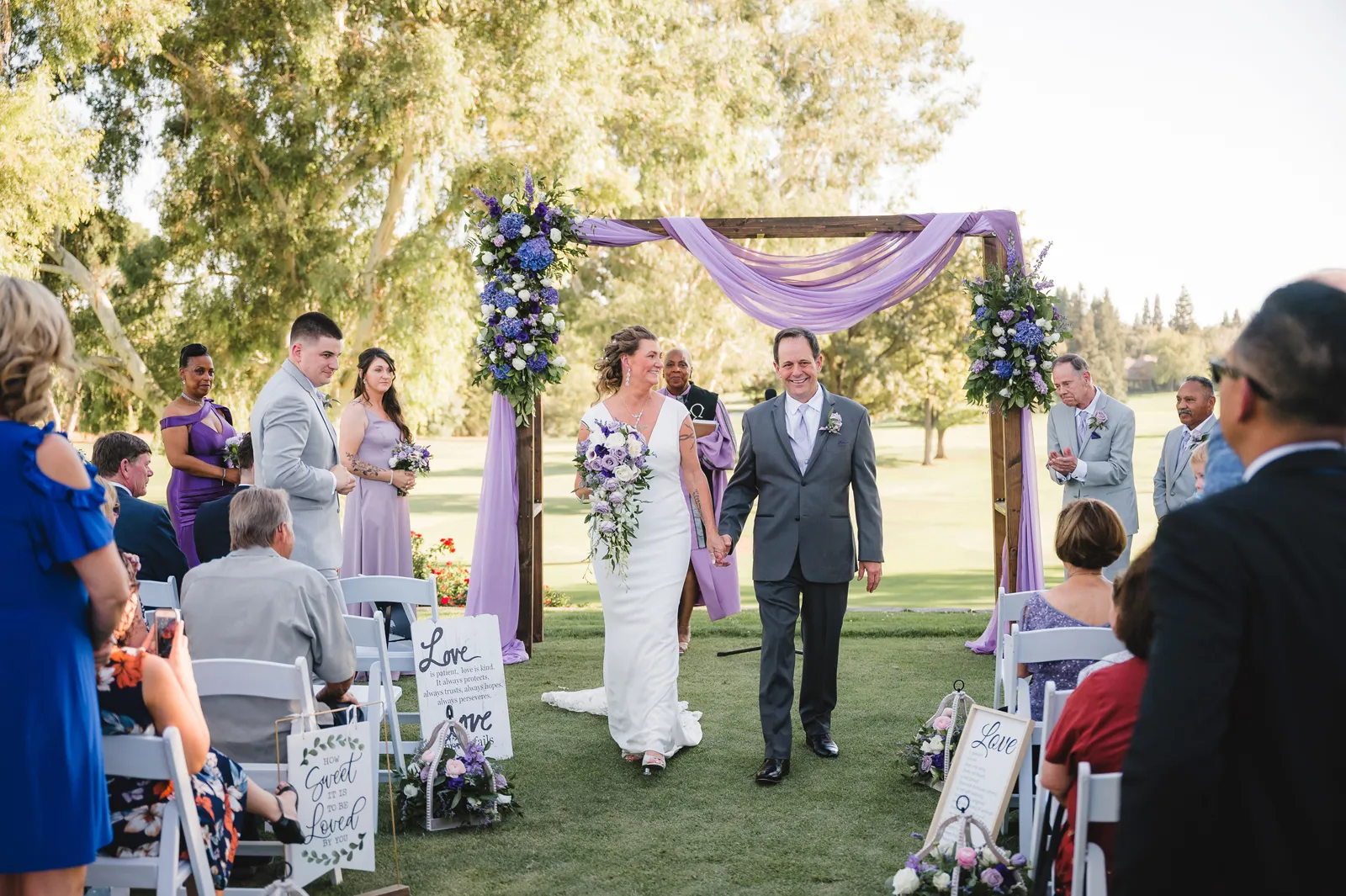 The ceremony was romantic and very us. Both my parents have passed away so it was very special to have my daughter in the wedding and my son give me away. Also, Shasta stole the show — he was so good. Our flowergirl was a former student of mine. Our minister was my best friend’s sister (and they are both like sisters to me). We got married on the first tee of our country club (Northridge Country Club) which is our happy place. Our painter painted our first kiss (that probably got the second most compliments, no one had seen that done before), and my daughter and I picked the music out together. I walked down the aisle to “How Long Will I Love You” by Ellie Goulding.