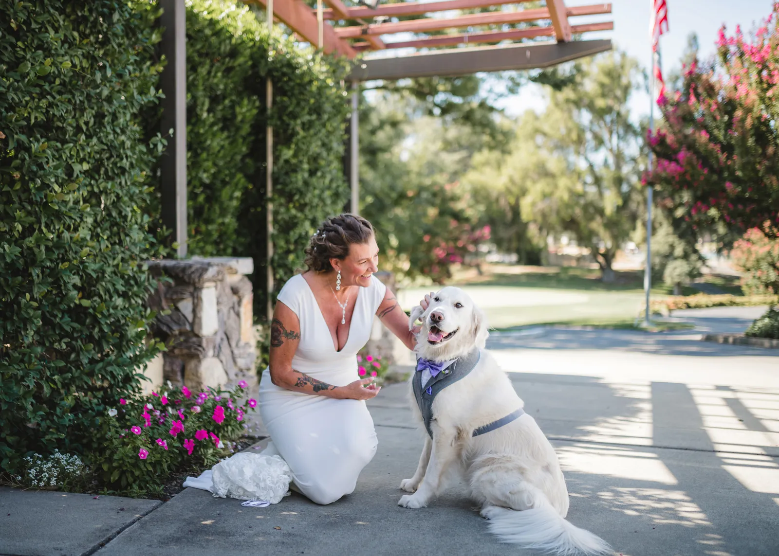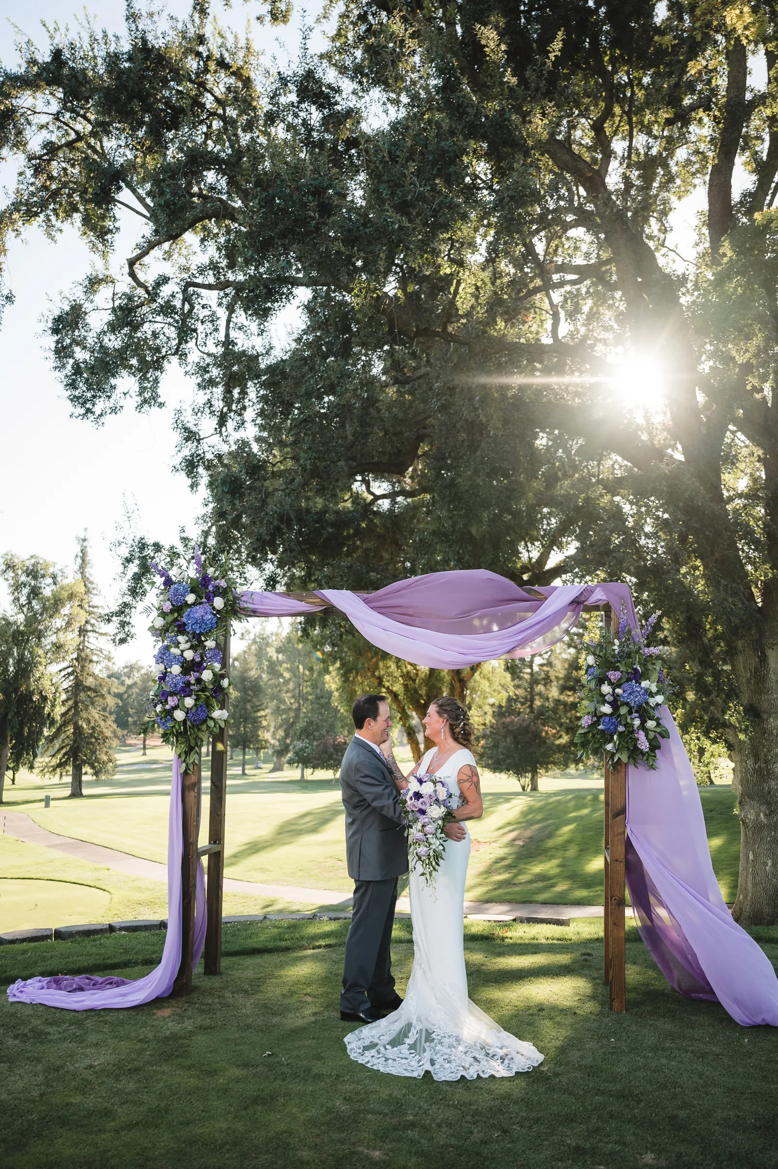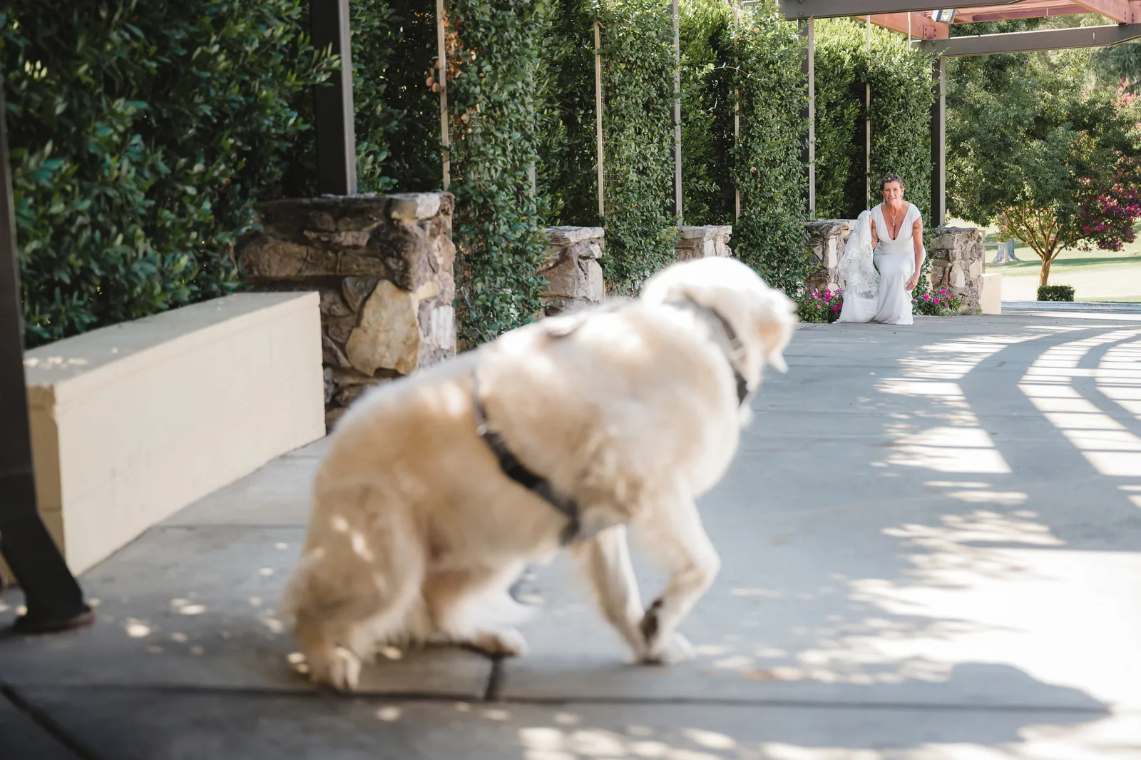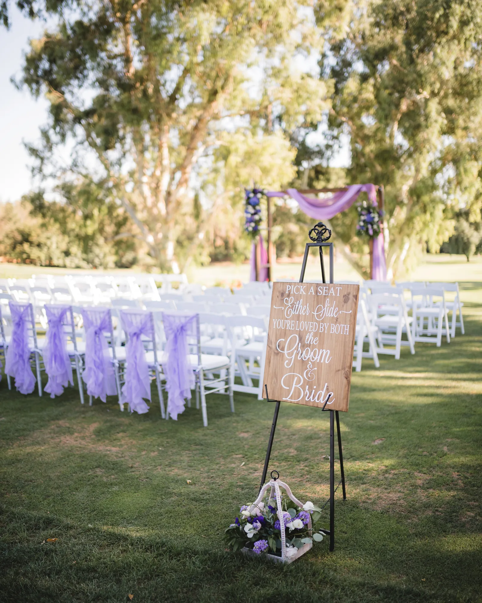 The ceremony was romantic and very us. Both my parents have passed away so it was very special to have my daughter in the wedding and my son give me away. Also, Shasta stole the show — he was so good. Our flowergirl was a former student of mine. Our minister was my best friend’s sister (and they are both like sisters to me). We got married on the first tee of our country club (Northridge Country Club) which is our happy place. Our painter painted our first kiss (that probably got the second most compliments, no one had seen that done before), and my daughter and I picked the music out together. I walked down the aisle to “How Long Will I Love You” by Ellie Goulding.
