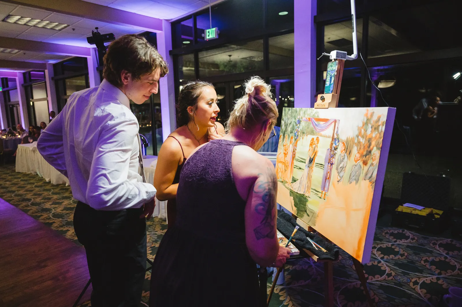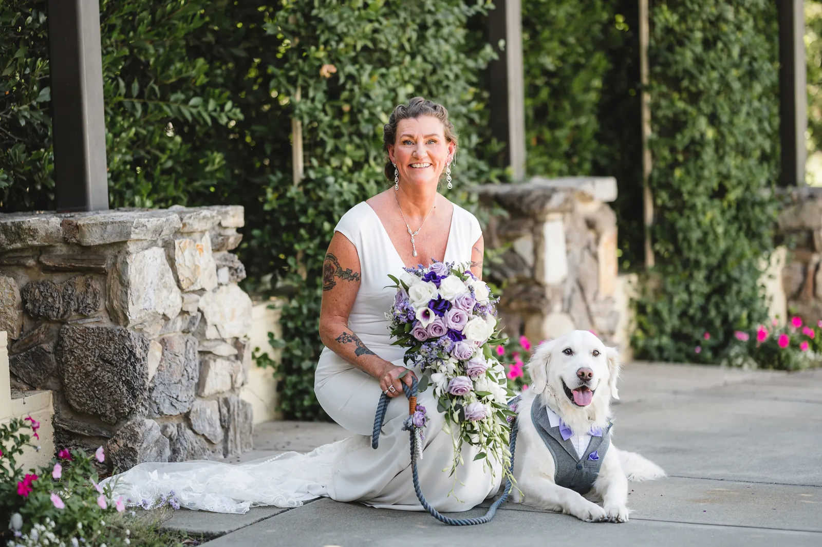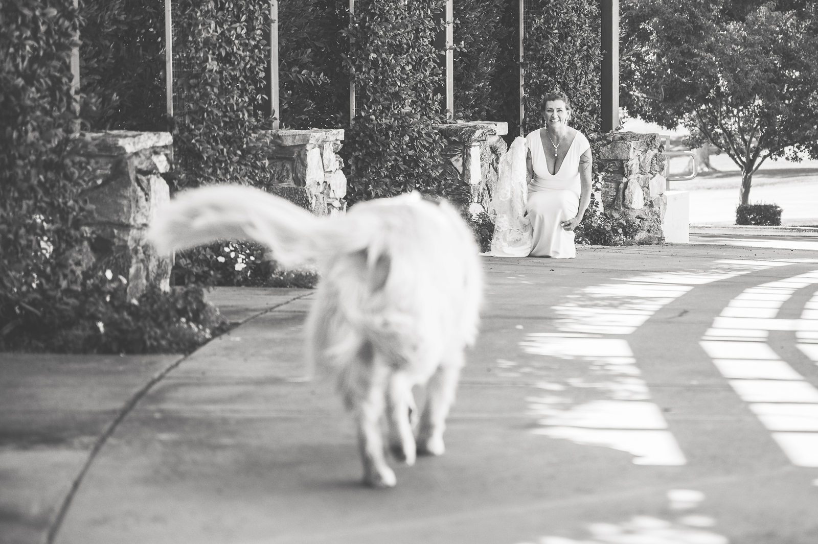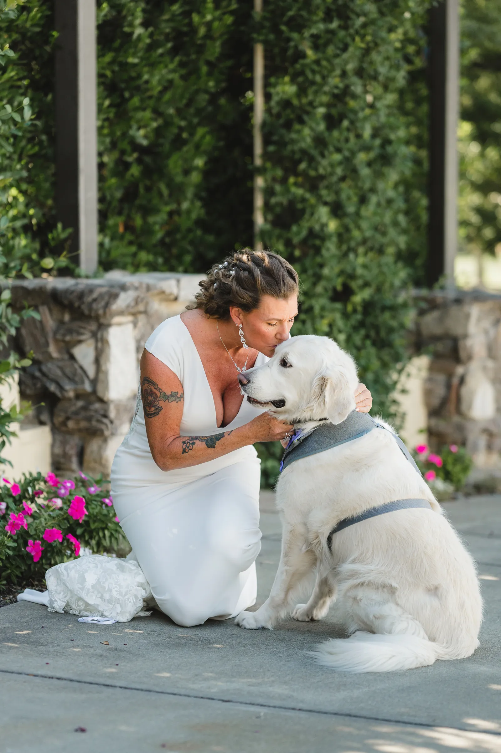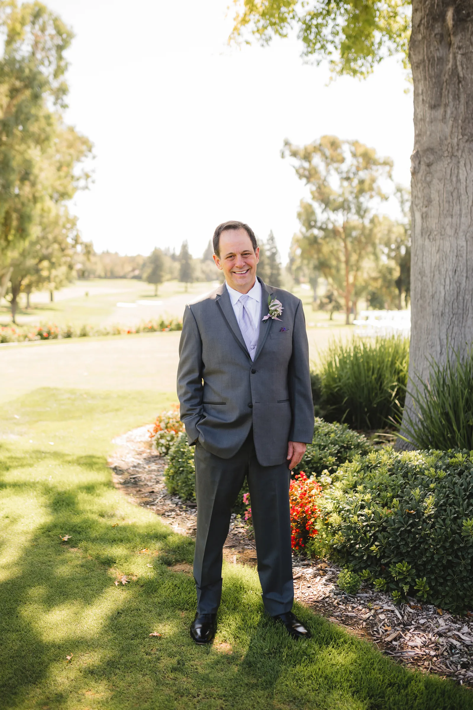 The ceremony was romantic and very us. Both my parents have passed away so it was very special to have my daughter in the wedding and my son give me away. Also, Shasta stole the show — he was so good. Our flowergirl was a former student of mine. Our minister was my best friend’s sister (and they are both like sisters to me). We got married on the first tee of our country club (Northridge Country Club) which is our happy place. Our painter painted our first kiss (that probably got the second most compliments, no one had seen that done before), and my daughter and I picked the music out together. I walked down the aisle to “How Long Will I Love You” by Ellie Goulding.