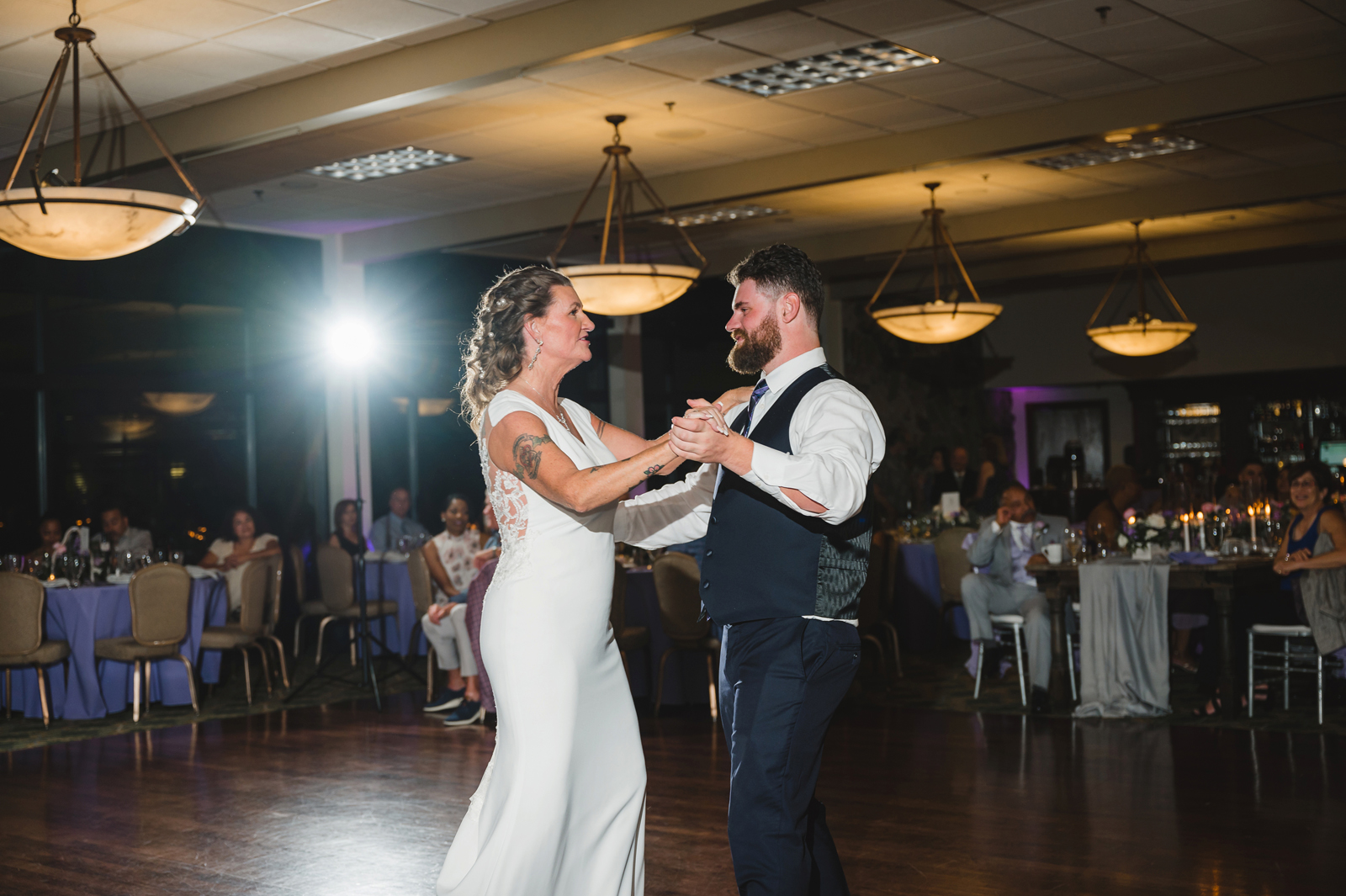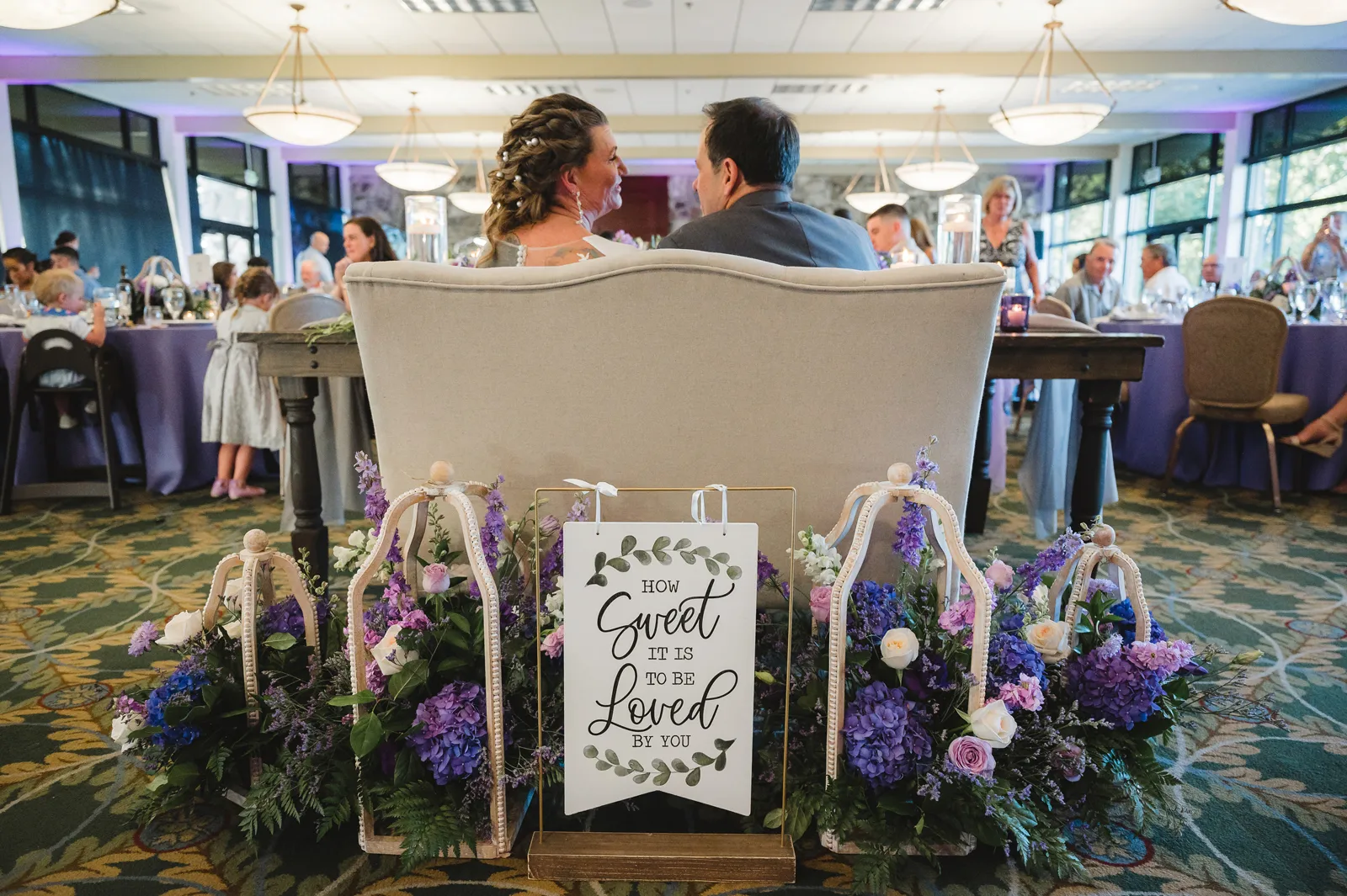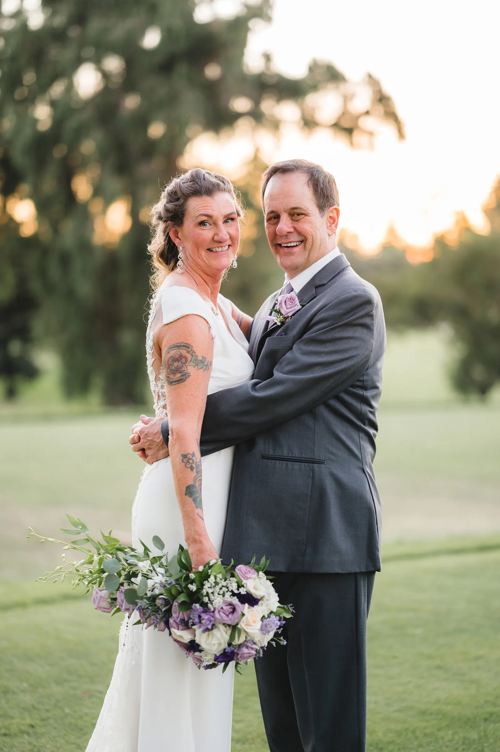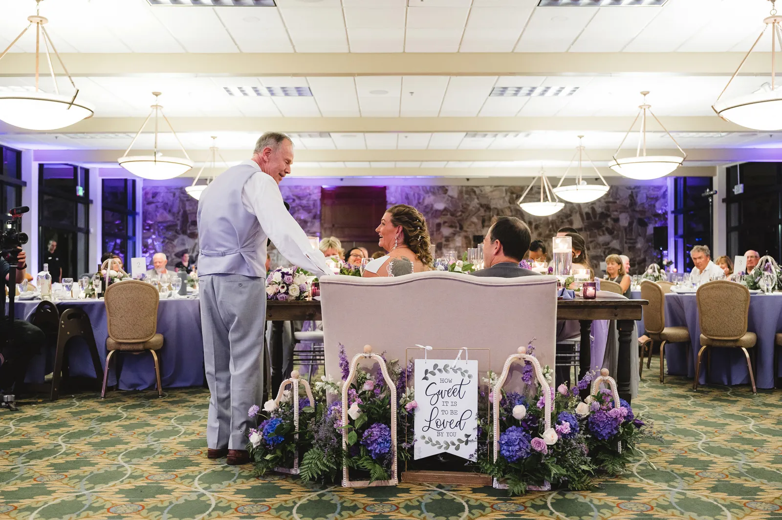 The ceremony was romantic and very us. Both my parents have passed away so it was very special to have my daughter in the wedding and my son give me away. Also, Shasta stole the show — he was so good. Our flowergirl was a former student of mine. Our minister was my best friend’s sister (and they are both like sisters to me). We got married on the first tee of our country club (Northridge Country Club) which is our happy place. Our painter painted our first kiss (that probably got the second most compliments, no one had seen that done before), and my daughter and I picked the music out together. I walked down the aisle to “How Long Will I Love You” by Ellie Goulding.