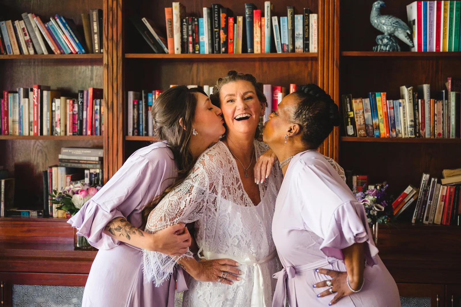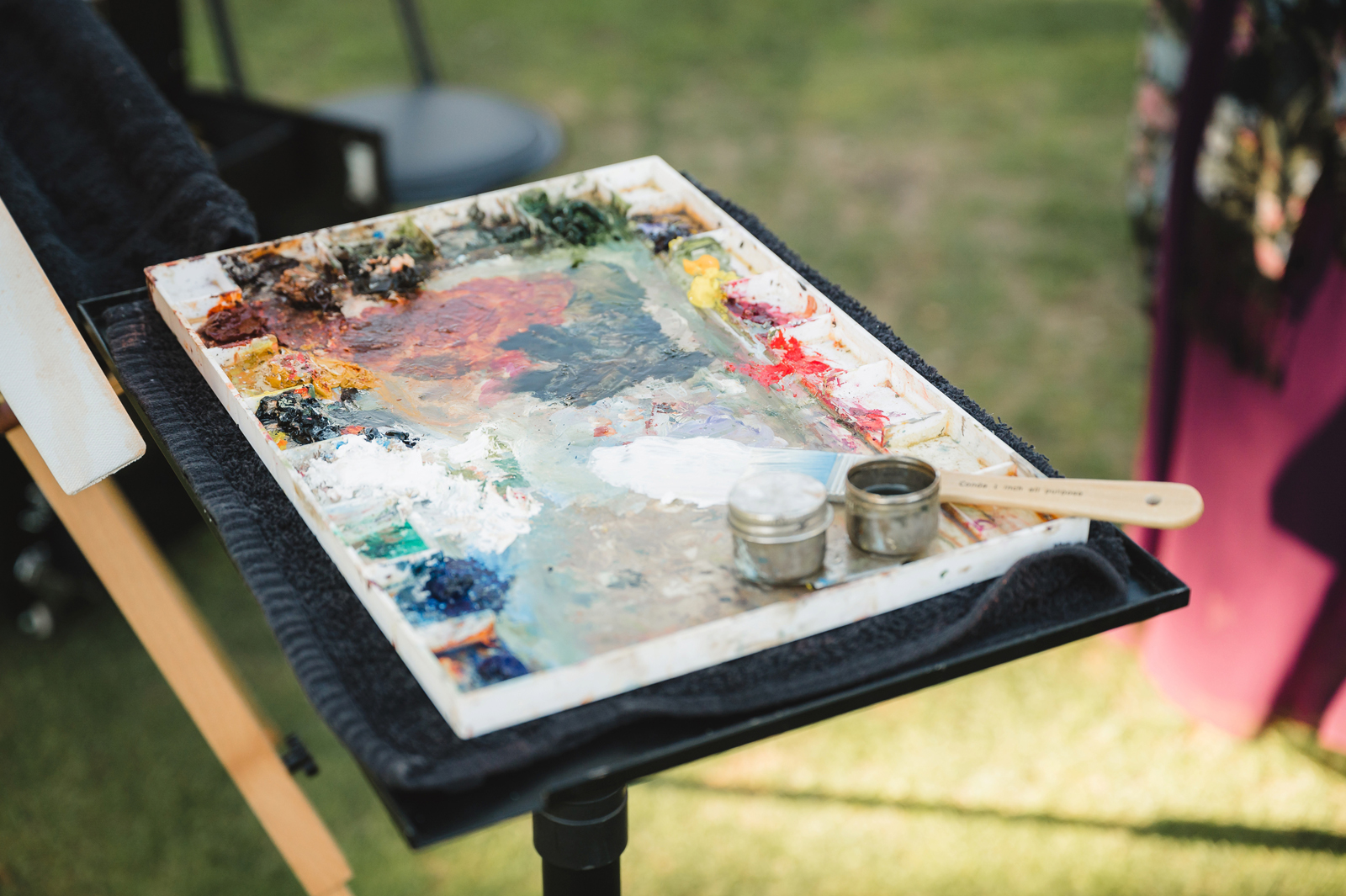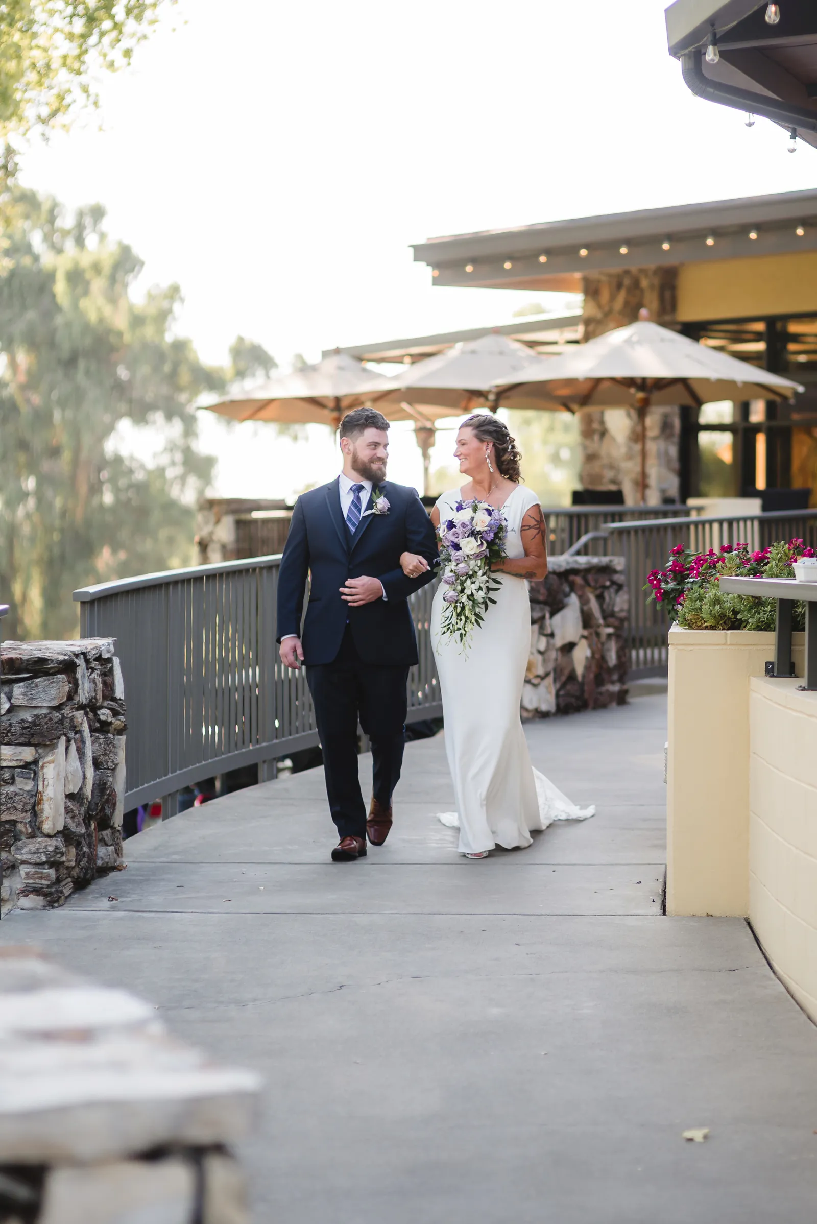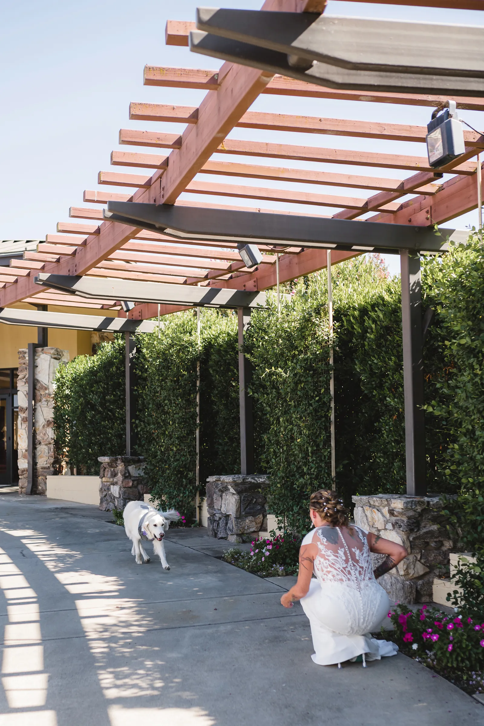 The ceremony was romantic and very us. Both my parents have passed away so it was very special to have my daughter in the wedding and my son give me away. Also, Shasta stole the show — he was so good. Our flowergirl was a former student of mine. Our minister was my best friend’s sister (and they are both like sisters to me). We got married on the first tee of our country club (Northridge Country Club) which is our happy place. Our painter painted our first kiss (that probably got the second most compliments, no one had seen that done before), and my daughter and I picked the music out together. I walked down the aisle to “How Long Will I Love You” by Ellie Goulding.