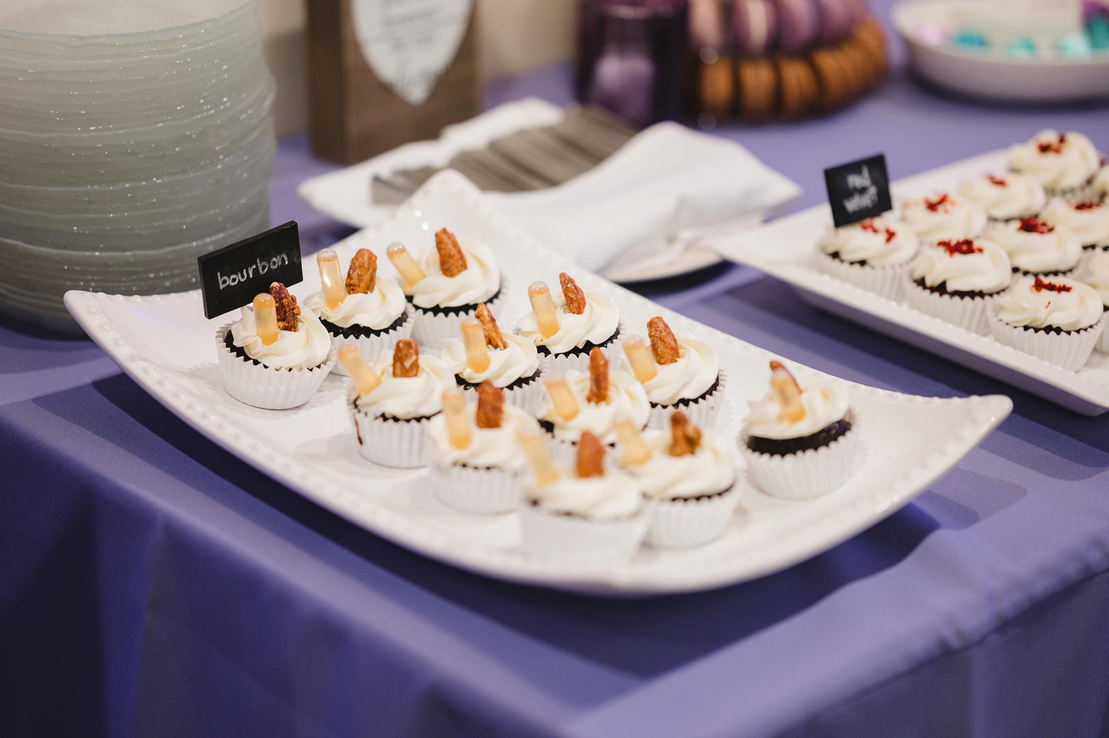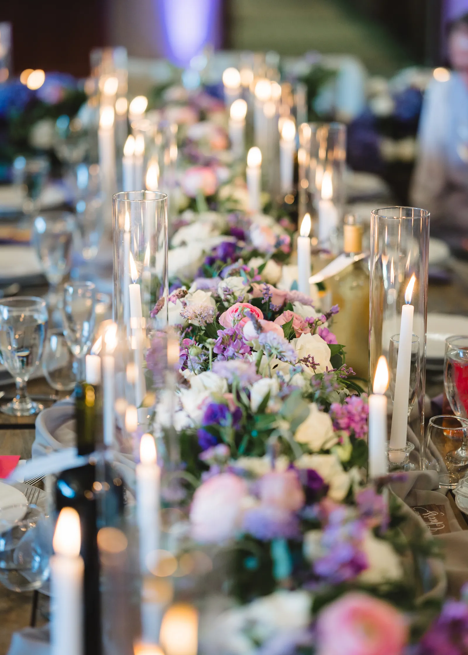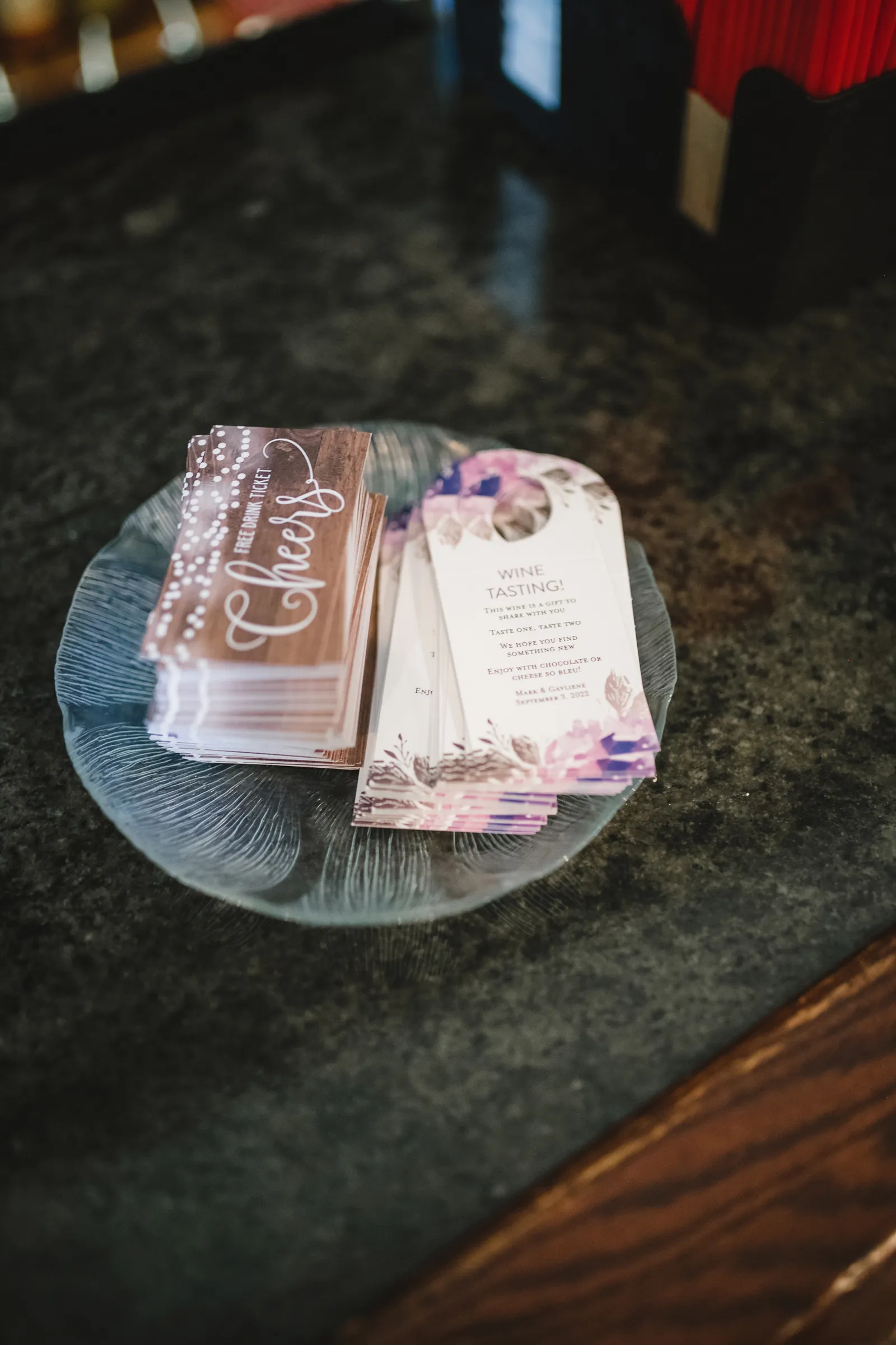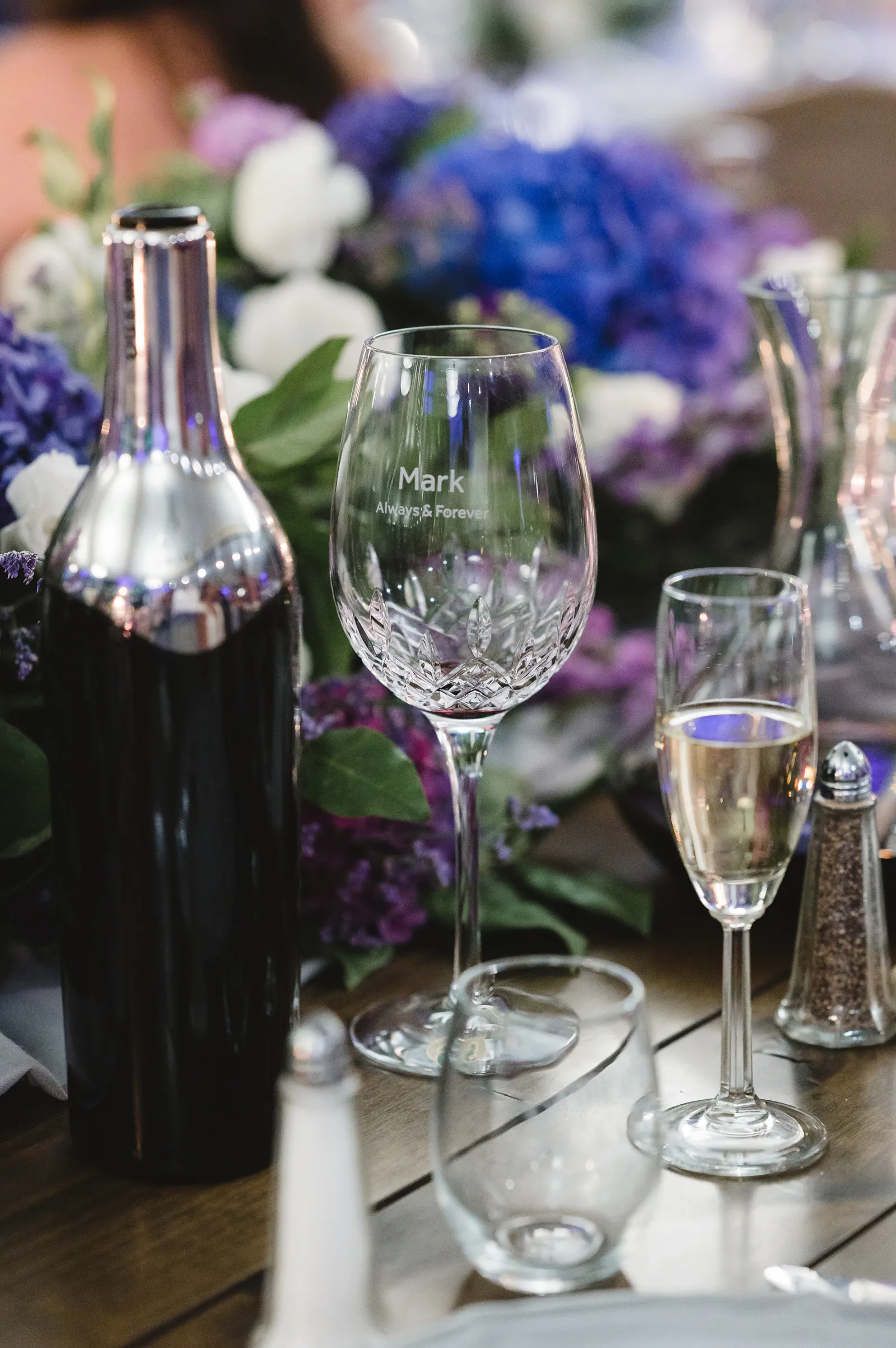 We put wine on each table from our collection with a poem I wrote hung on each bottle; and our favor was a small wine glass. We told our guests hat one of our favorite things to do is go wine tasting, so we wanted to share some of our favorites with them, hoping they would find something they love as much as we do.