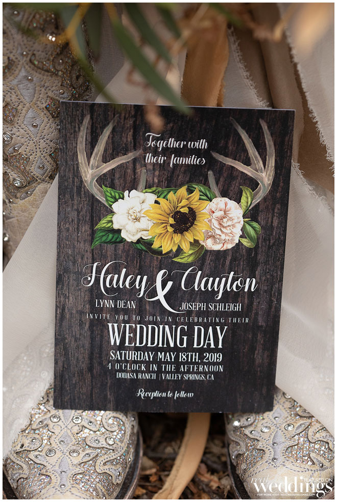 Their invitations reflected the couple’s respective tastes, as well, deer antlers for Clayton since he’s a hunter and sunflowers for Haley.