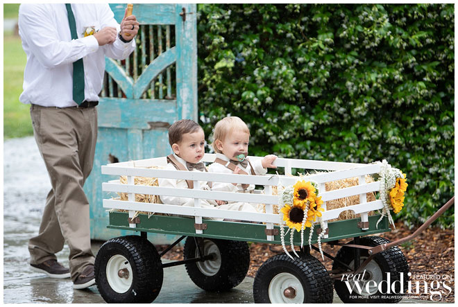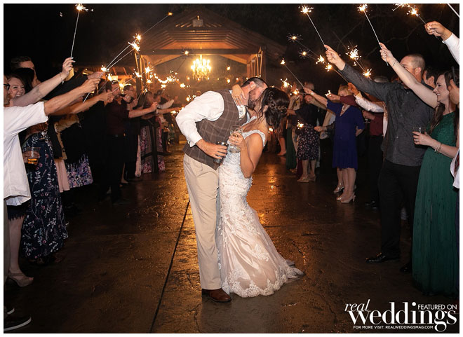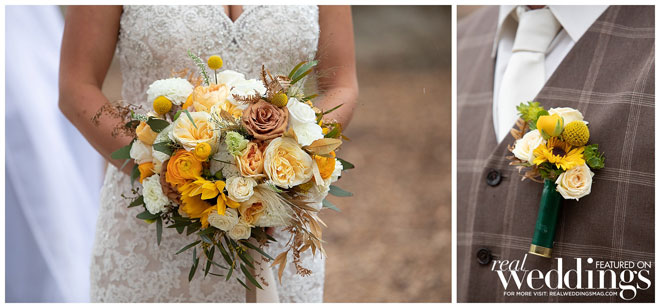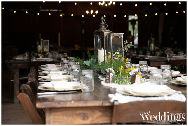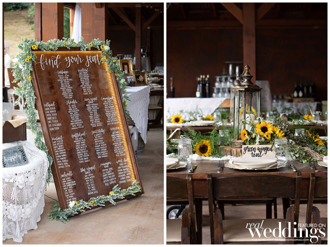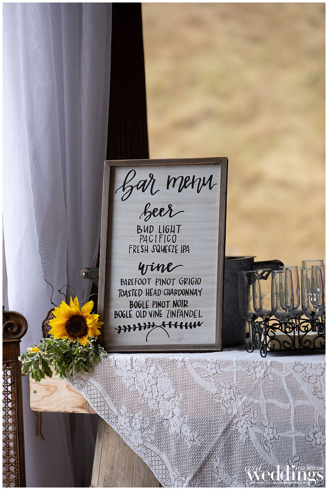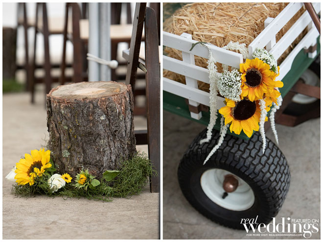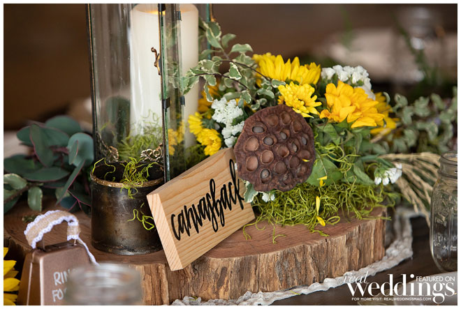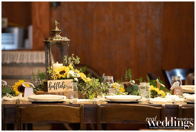 They chose a rustic chic theme since they both love the outdoors, barns and rustic landscape. Their green and yellow color scheme fit the couple perfectly. Green is one of the bride’s favorite colors and it was a great color for their spring wedding. They used sunflowers—Haley’s favorite bloom—for a pop of yellow and rustic charm. An added bonus? Clayton loves green and yellow because those are the colors of his favorite baseball team, the Oakland A’s.