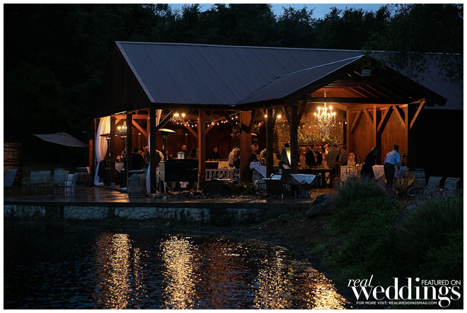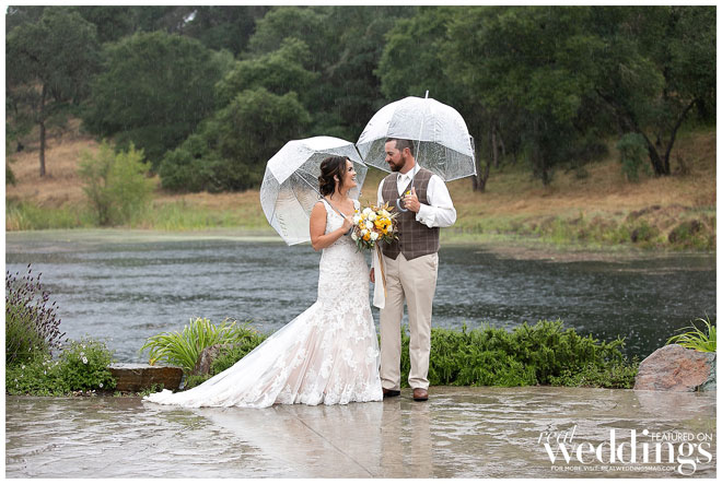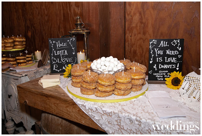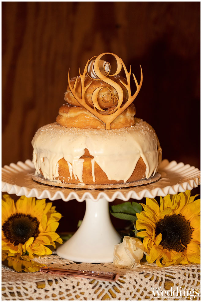 Their reception was held in a covered pavilion, along a pond at the venue. Following a chicken and tri-tip dinner, they and their 140 guests enjoyed a three-tiered donut cake.