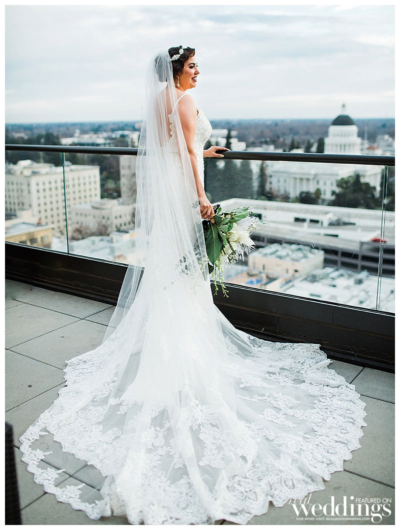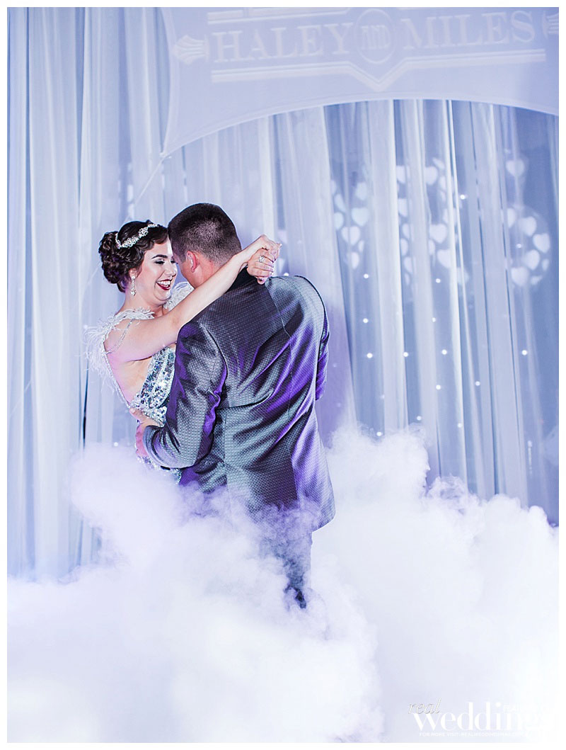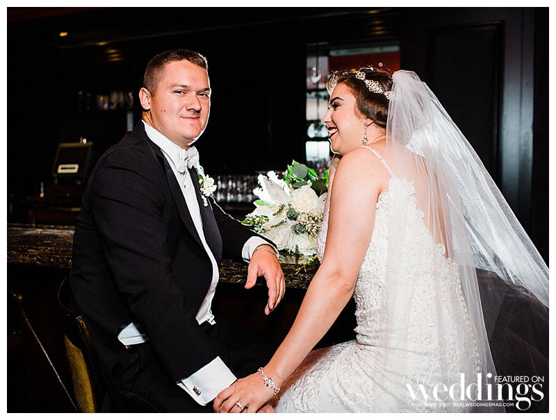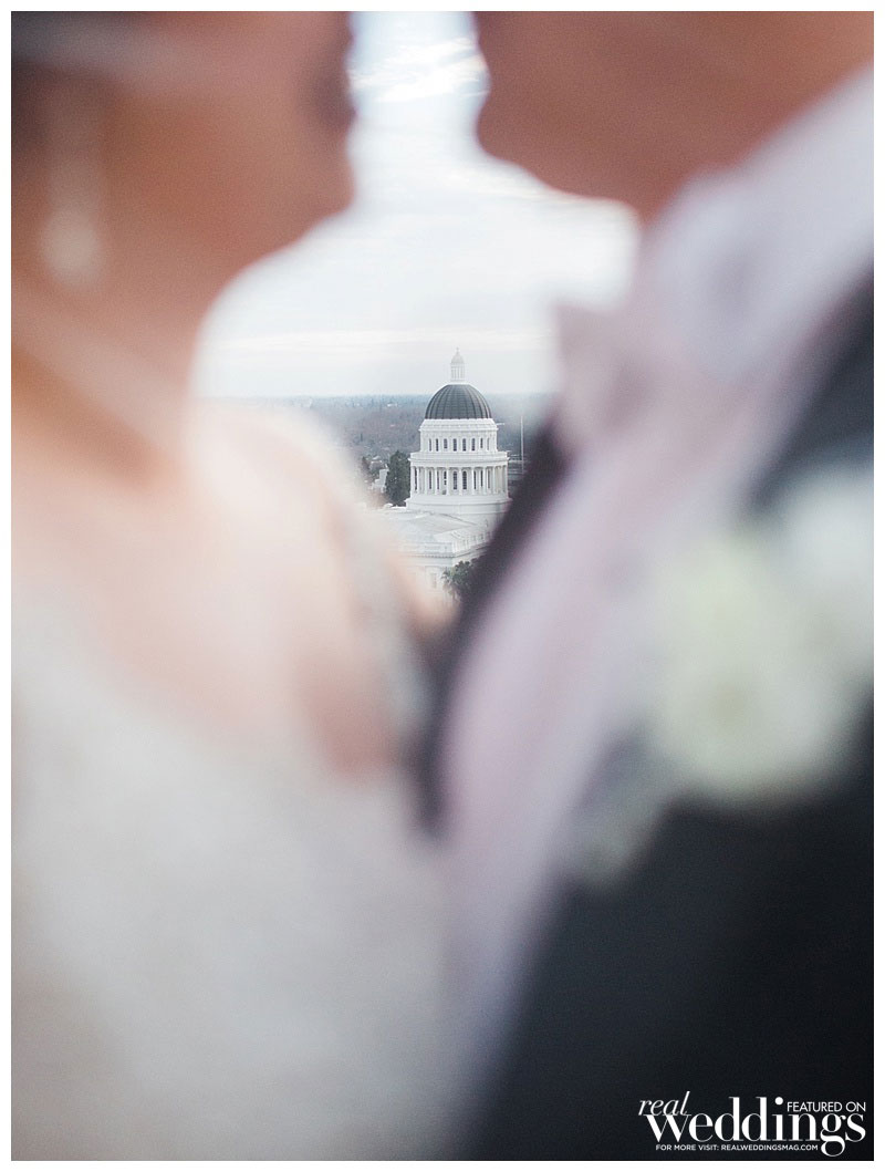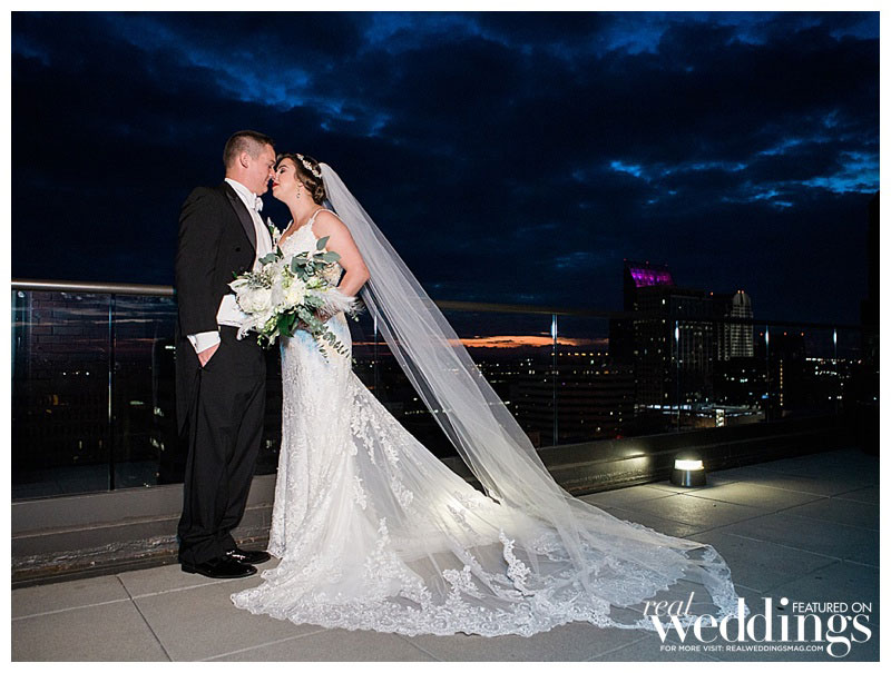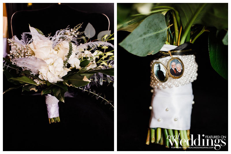 With the Capitol in full view, the couple exchanged vows in a simple but beautiful ceremony at The Citizen Hotel. “We added in little personal touches to make the ceremony feel like us,” says Haley. “From the custom aisle runner with our initials to the snow falling after our first kiss as husband and wife and dancing on the clouds during our reception (courtesy of the snow and fog machines from Mike at Creative Memories Entertainment), it was all just so magical. I even had a locket connected to my bouquet that had a photo of my great-grandmother, great-grandfather and grandfather on the inside. It really made me feel like they were there with us.”