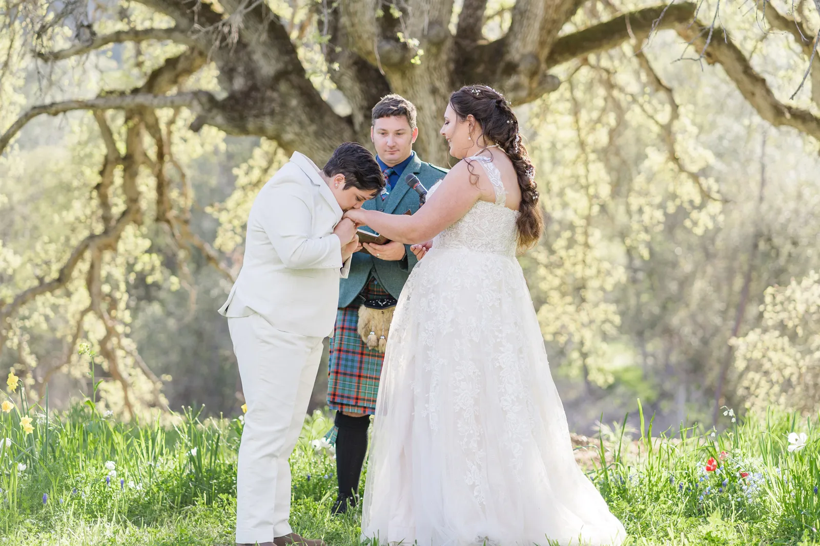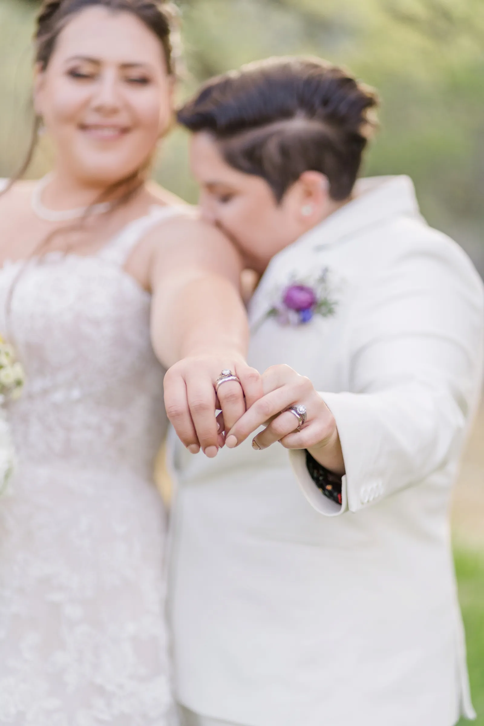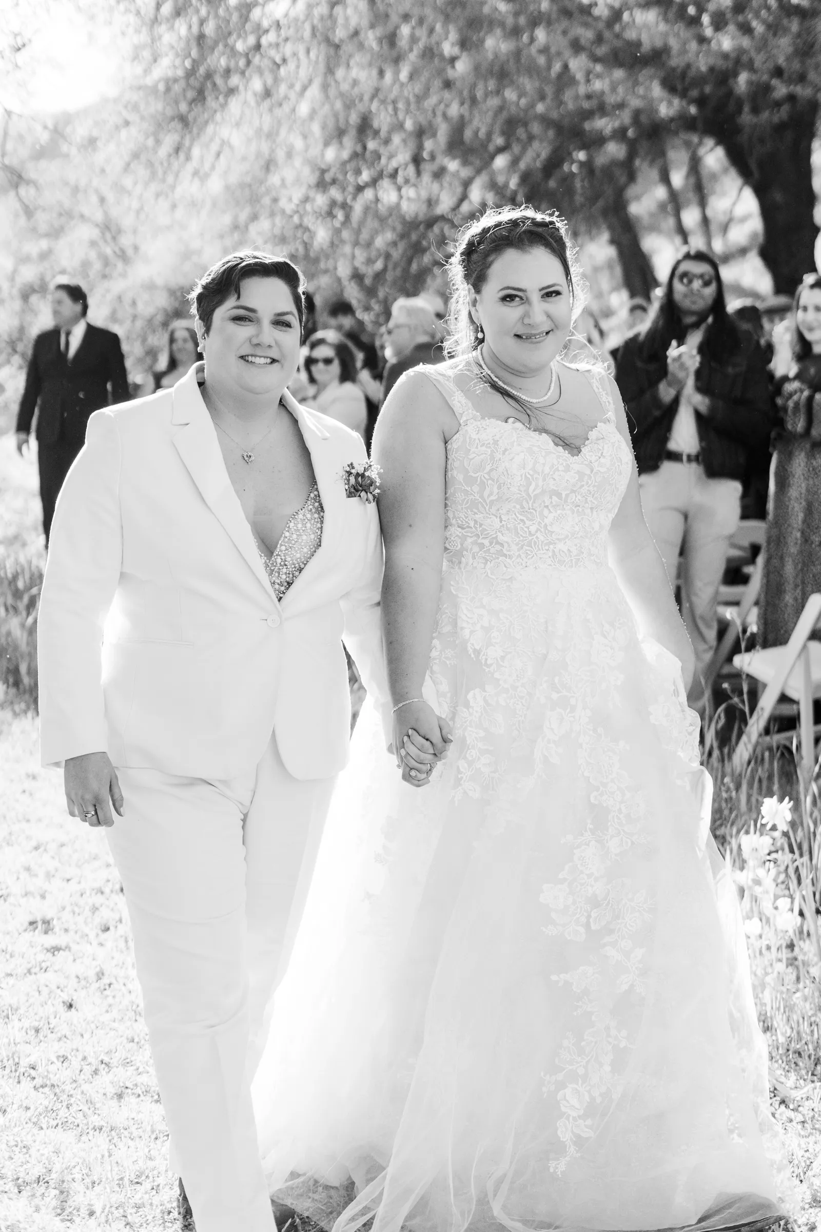 We wanted the ceremony to be short and sweet. One thing that people still comment on was how much they loved our vows! In truth, we wrote them 24 hours before the wedding and we kept them private until we shared them with each other and our loved ones during our ceremony. A unique aspect of our ceremony is that we gave ourselves away—we walked each other down the aisle. And for our reception, we forwent the gendered garter toss, bouquet toss and money dance. For every aspect of our wedding, we went with what felt right for us.