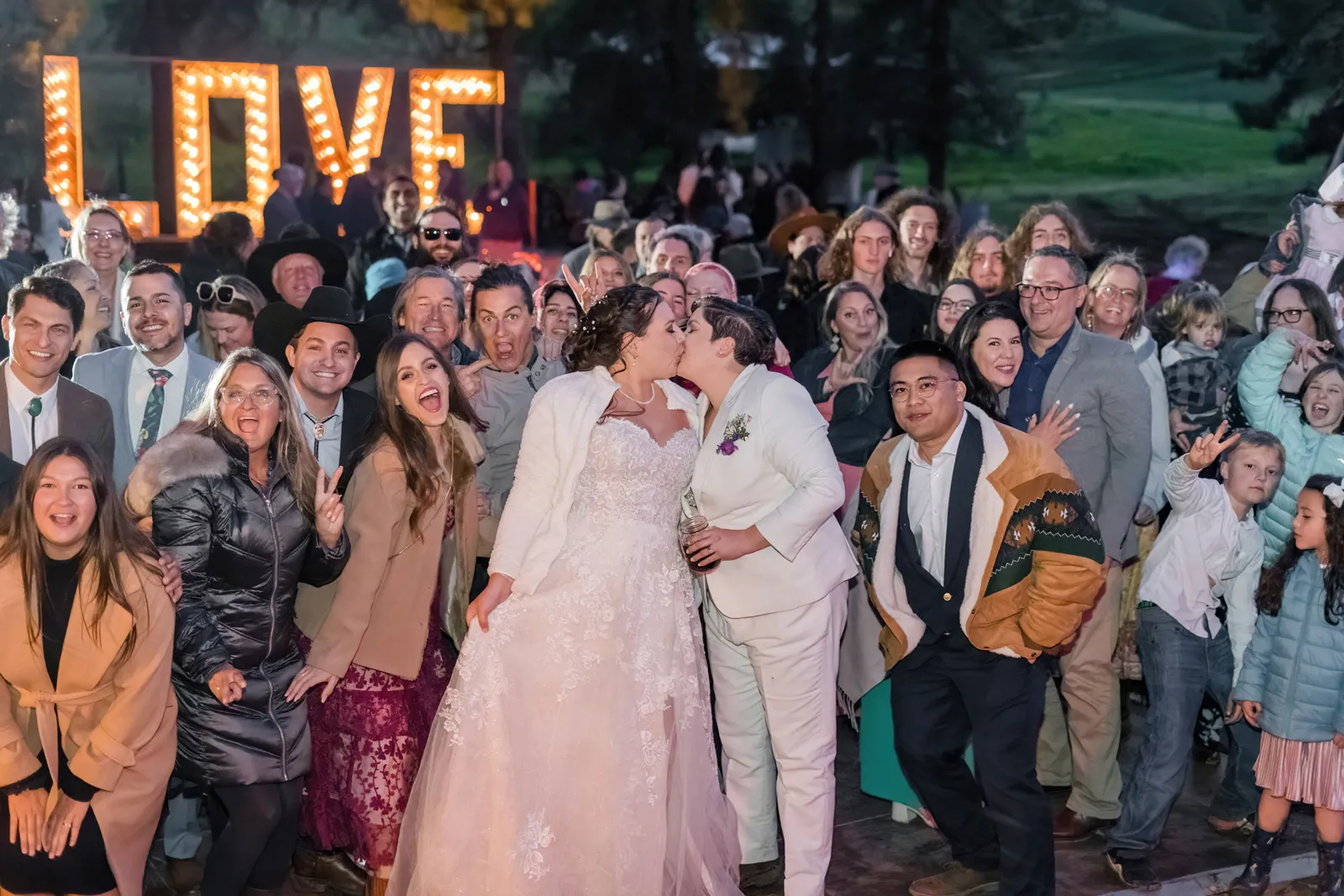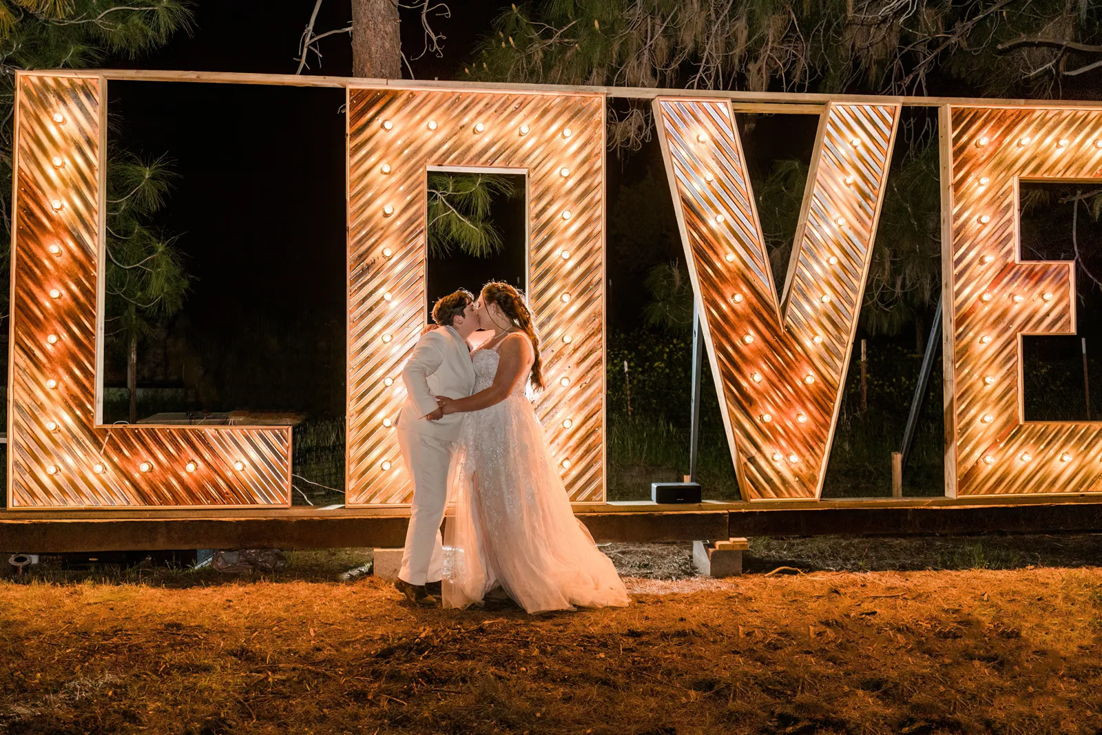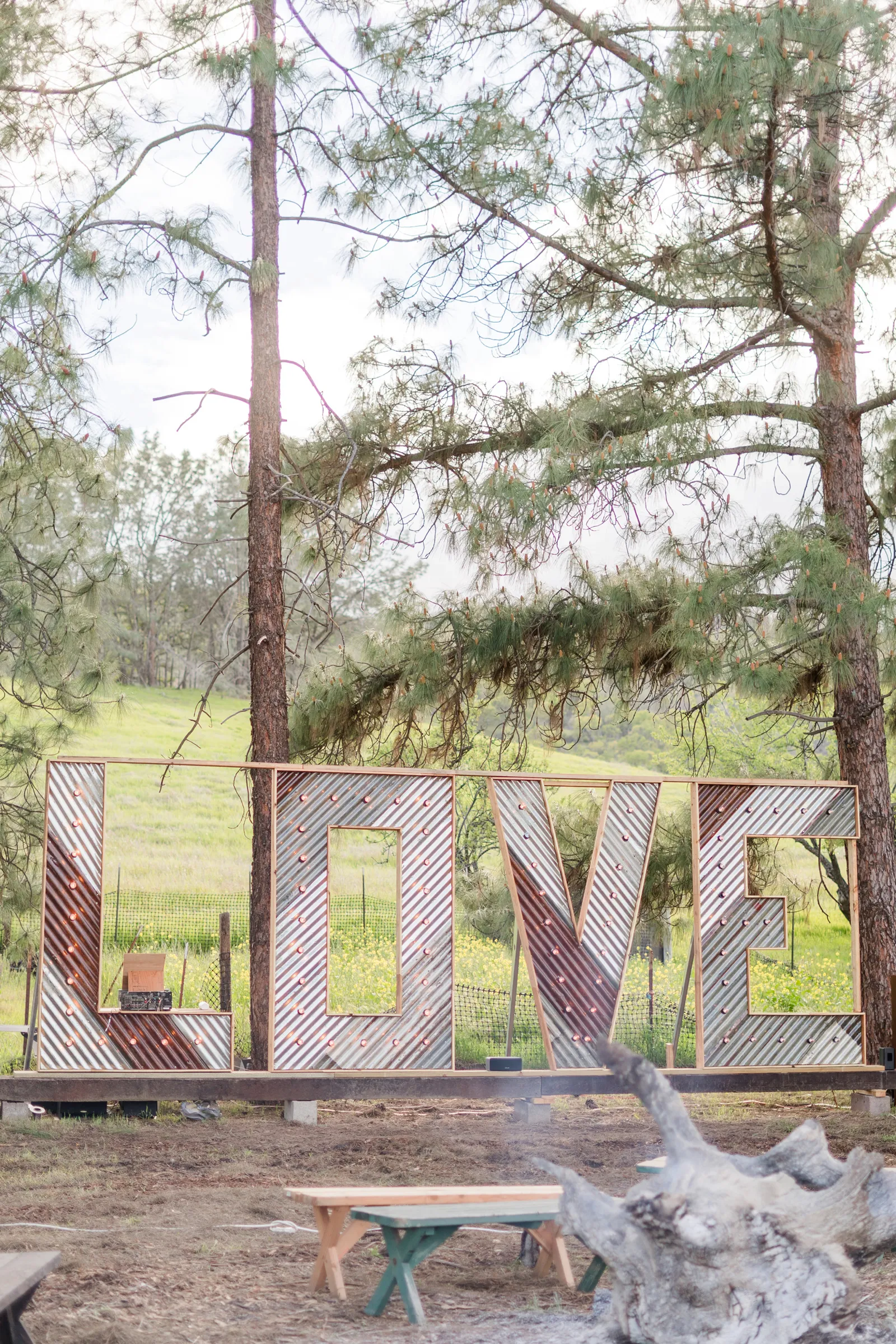 The biggest challenge of wedding planning was picturing what a space would look like before it was ever put together for the first time. We were working with a space that was originally a rundown mobile home and turned it into a pine tree-edged magical square with a 200-person tent, a bar, a stage and dance-floor, a LOVE sign with 20-foot letters, luxury portable trailers, a charcuterie table, cake table, gift table, a bonfire, and lighting to light the place up. Going with an experienced venue and team would have made this seamless but the way we did this has never been done before and was unique to our personal desires. We wanted no noise curfew, no additional time fees, and basically no rules. We hired inclusive security to make sure there were no problems and we really enjoyed having a layer of security to create a safe and inclusive place for ourselves and our guests.