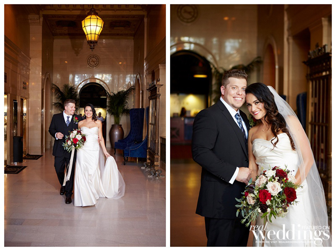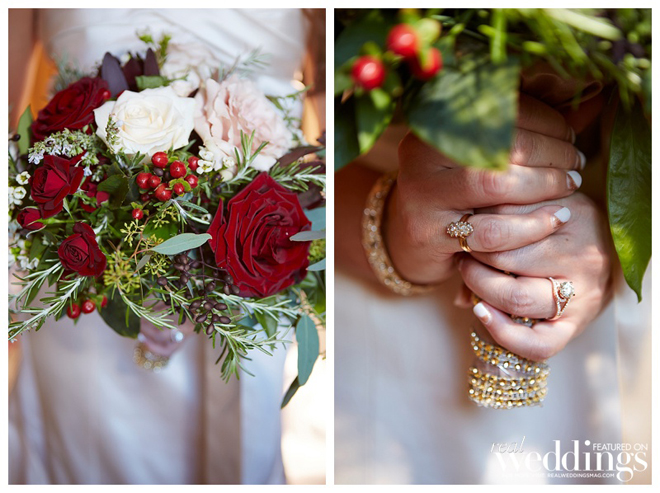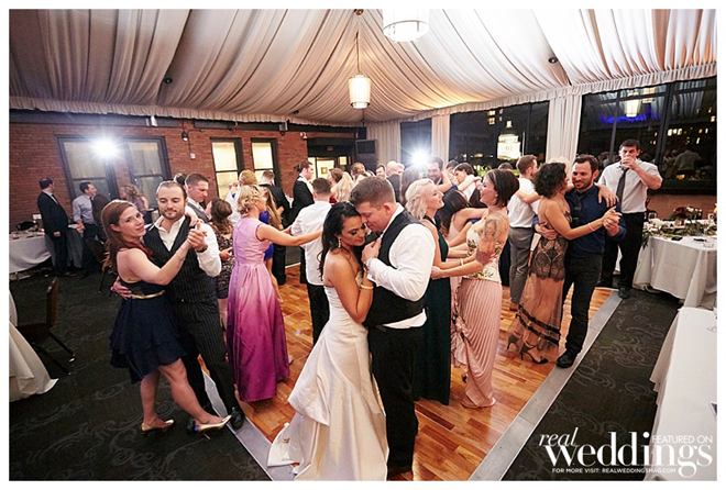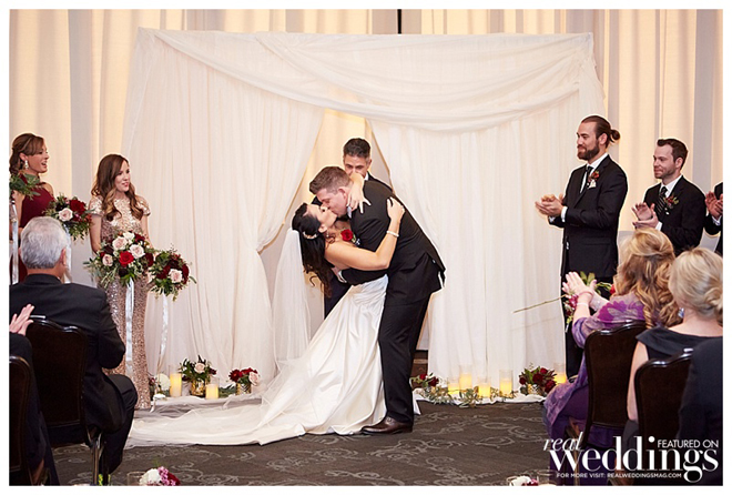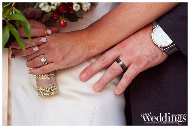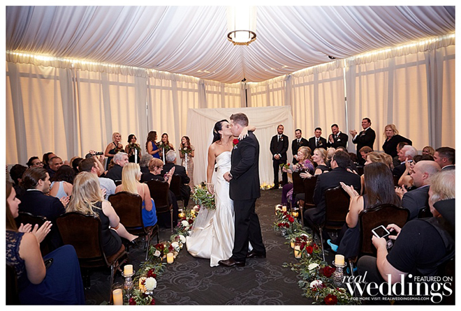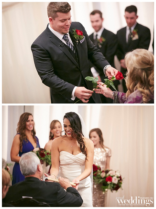 When planning the wedding, the couple chose to focus on the experience of heightened senses (sight, smell, touch and taste). “We wanted the ceremony to feel light and romantic, the cocktail hour to feel warmer and the reception to be full throttle sexy,” says the bride. “We tried to accomplish this through particular foods, lighting, drinks and florals.”