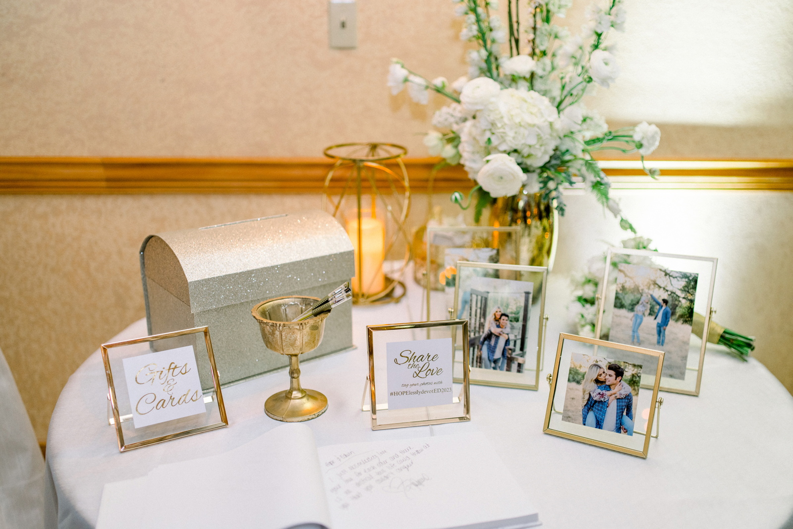 Hope: I had lost my stepdad a year ago so we had a table set up with pictures and vases for my dads who passed away. Both my real dad, who died when I was 12, and then stepdad. Also you will never get that many of your friends and family in the same room again which was so awesome. [It was] very emotional. We had a rough stretch in our relationship in the year leading up to the wedding but to work through it and finally get there was very emotional. When we said our vows there weren’t a lot of dry eyes in the chapel.