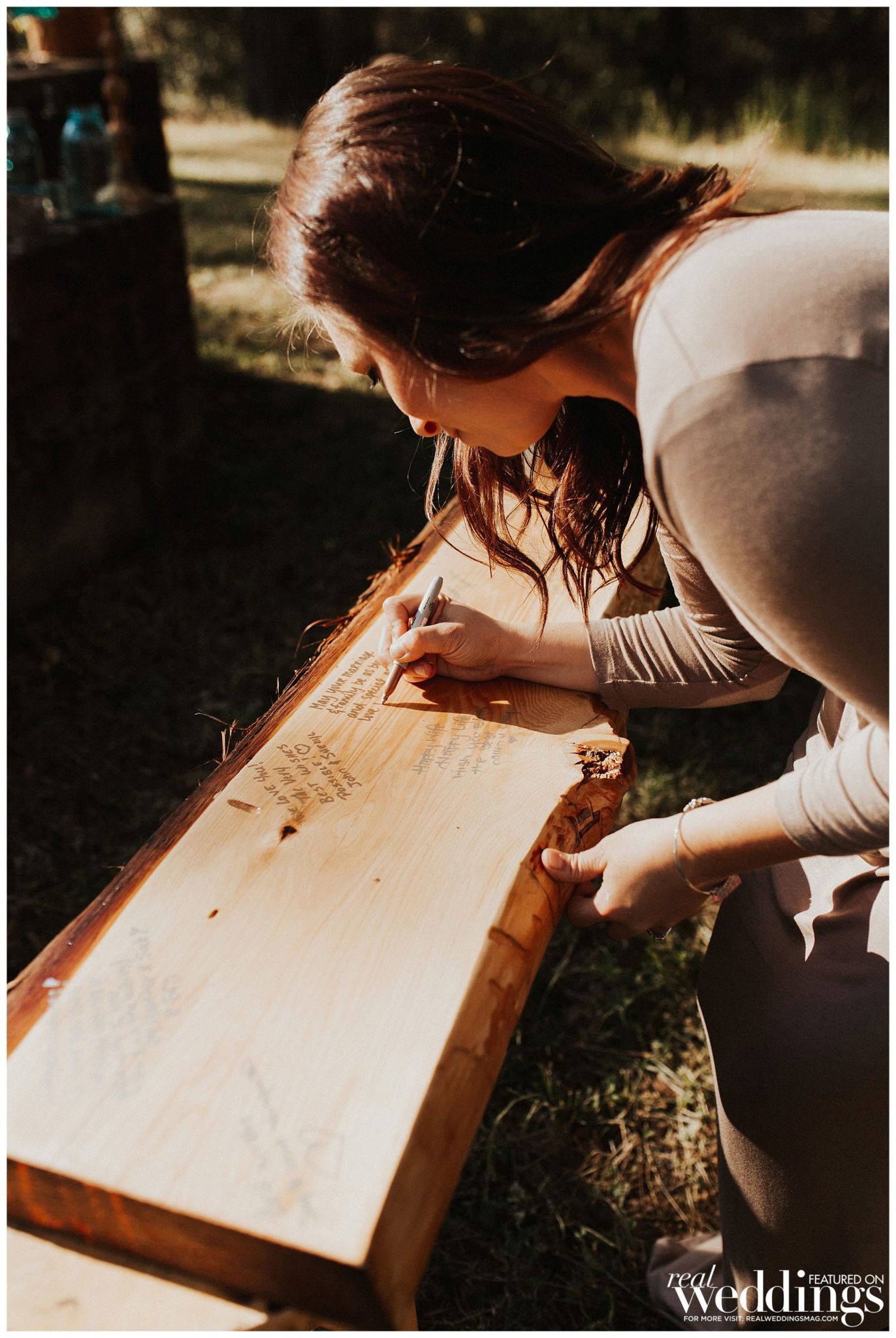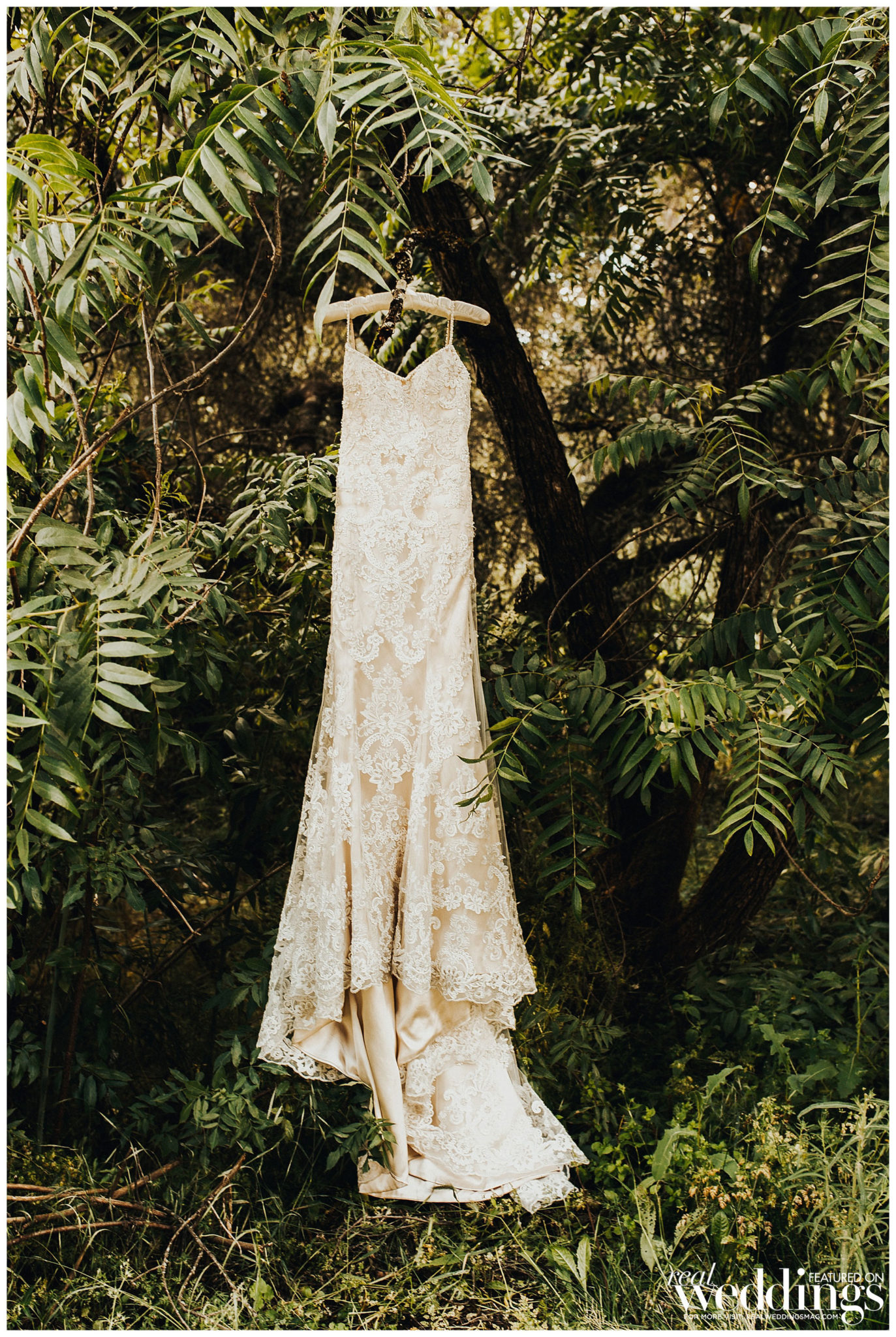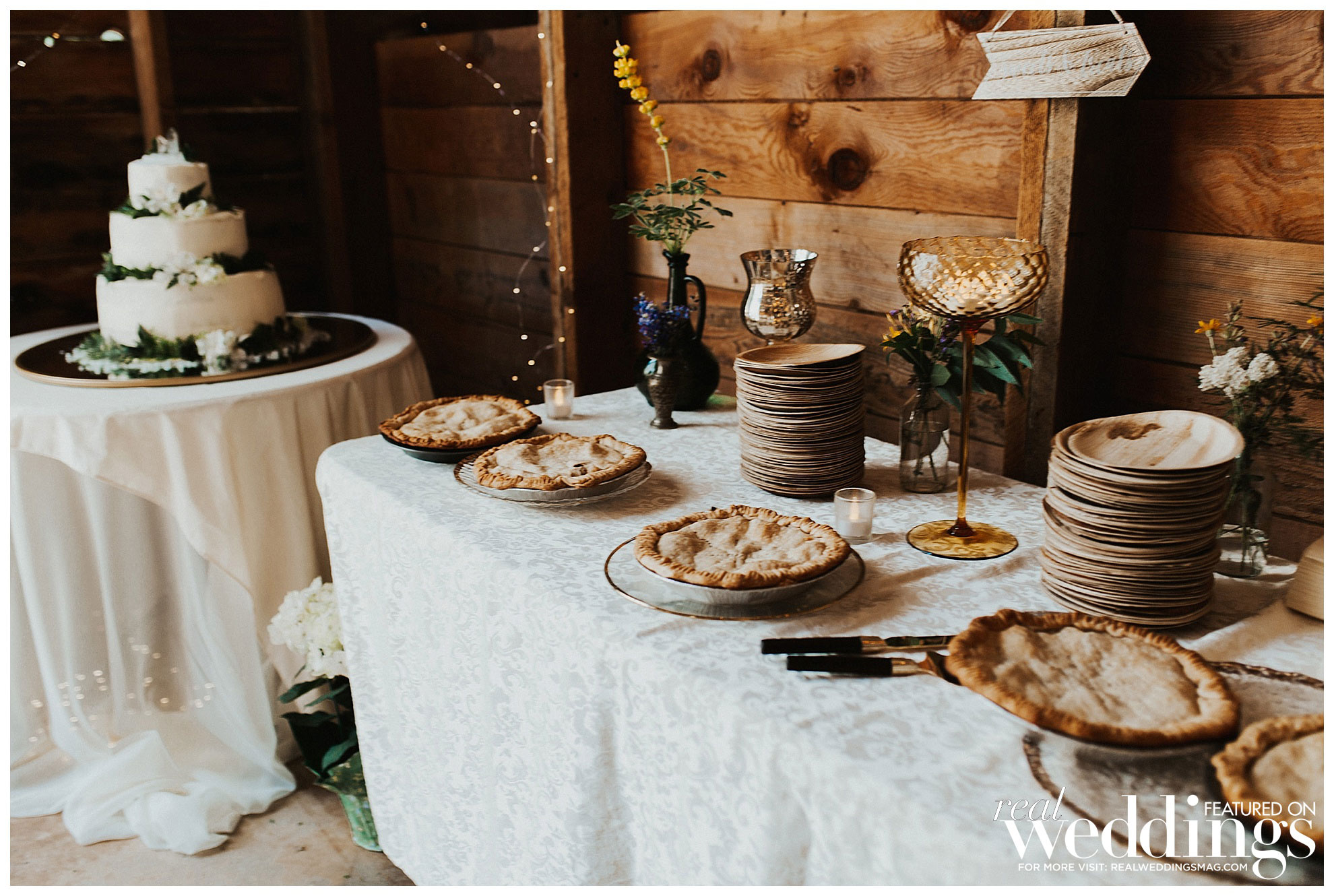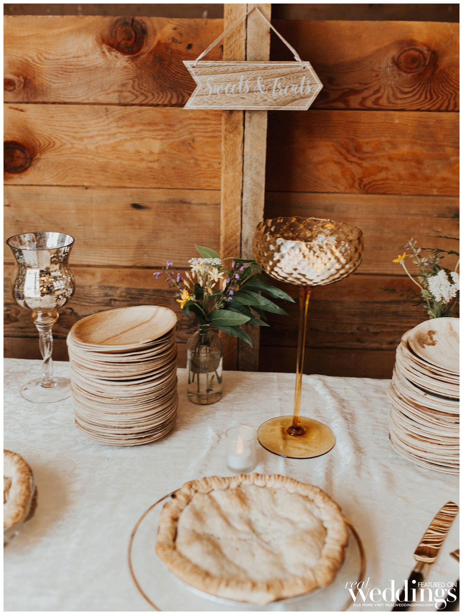 The bride did most of the wedding planning herself with the help of her mom and grandmother. “My favorite times were searching for unique décor at thrift stores and watching my theme come together,” she shares. “Also, I planned on setting up a teepee for the kids play area, and I tested out my teepee building skills in my living room a few days before the wedding. After it was successfully built, my maid of honor, my mom and I all climbed in and joked around about all of the ridiculous things that would most likely take place during the wedding. The laughter was a huge stress reliever.”