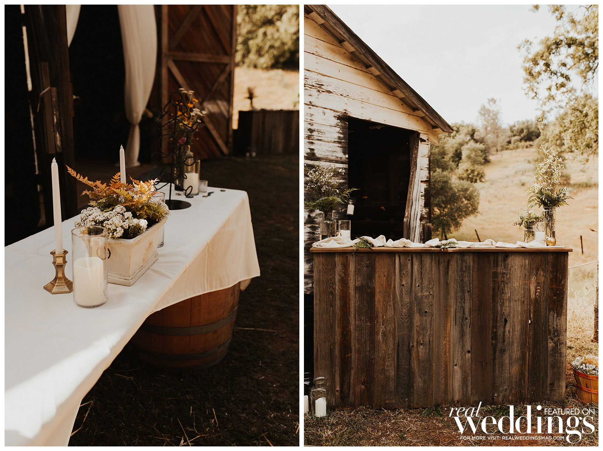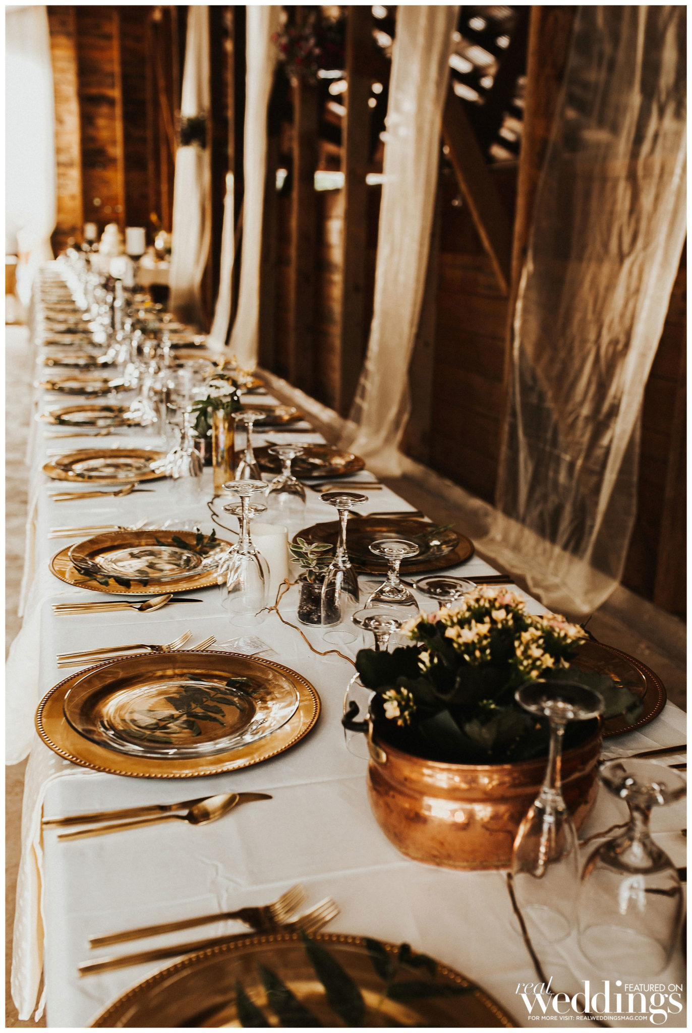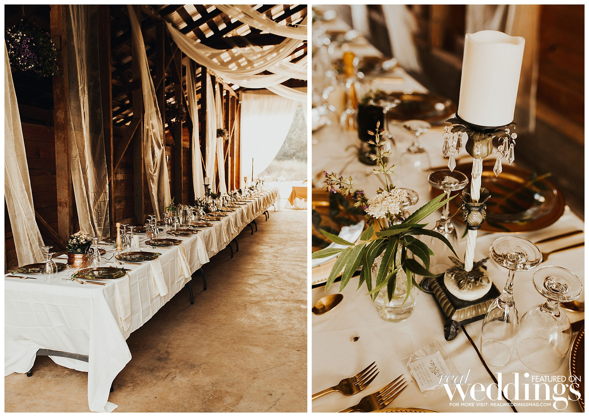 The reception was held a short walk from the ceremony in a barn. Irene’s mom bought sheer fabric to hang in the rafters. “It was quite a bit of work getting such a big barn decorated, but it was simple and gorgeous once we were finished,” says Irene.