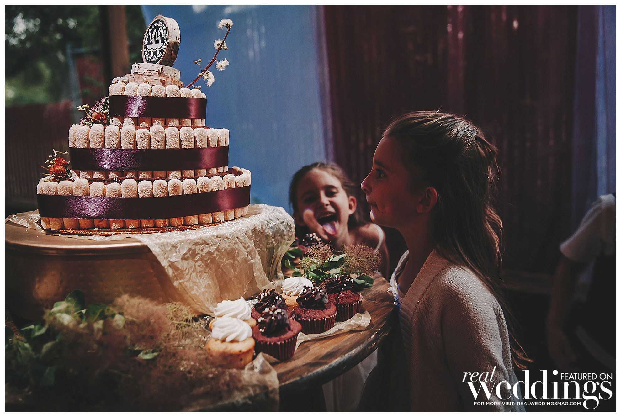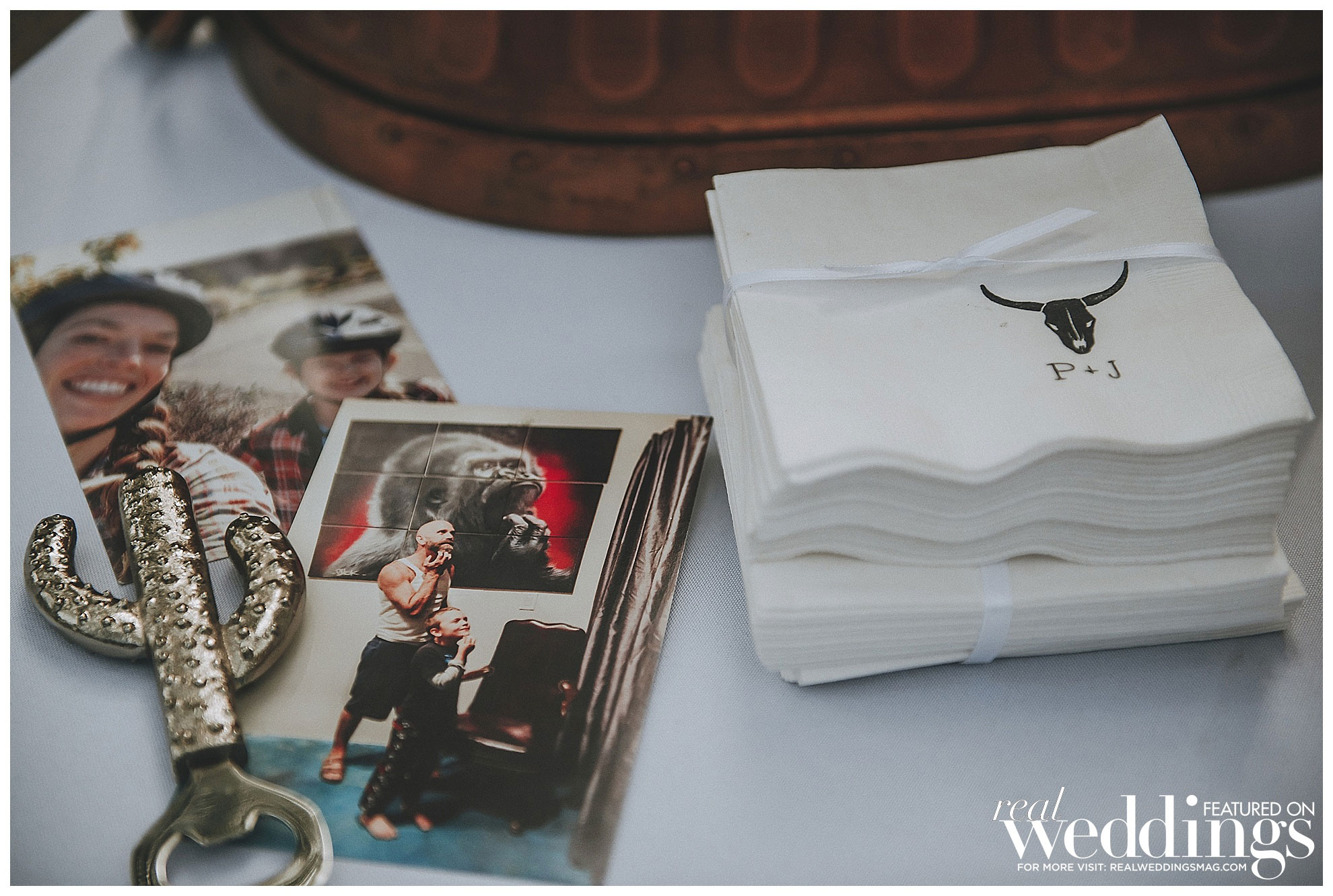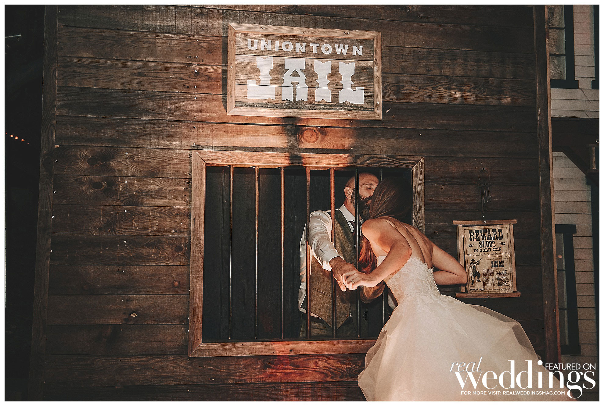 Both ceremony and reception were held at the same venue, Earthtrek Expeditions. Guests enjoyed a delicious barbecue from Hog Wild Bar-B-Que/Luke & Lucy Catering. “The dining area was elegant and rustic,” says Phil. “The dancing was down by the Gold Rush façade where we got a lot of cool pictures from the jail and saloon.”